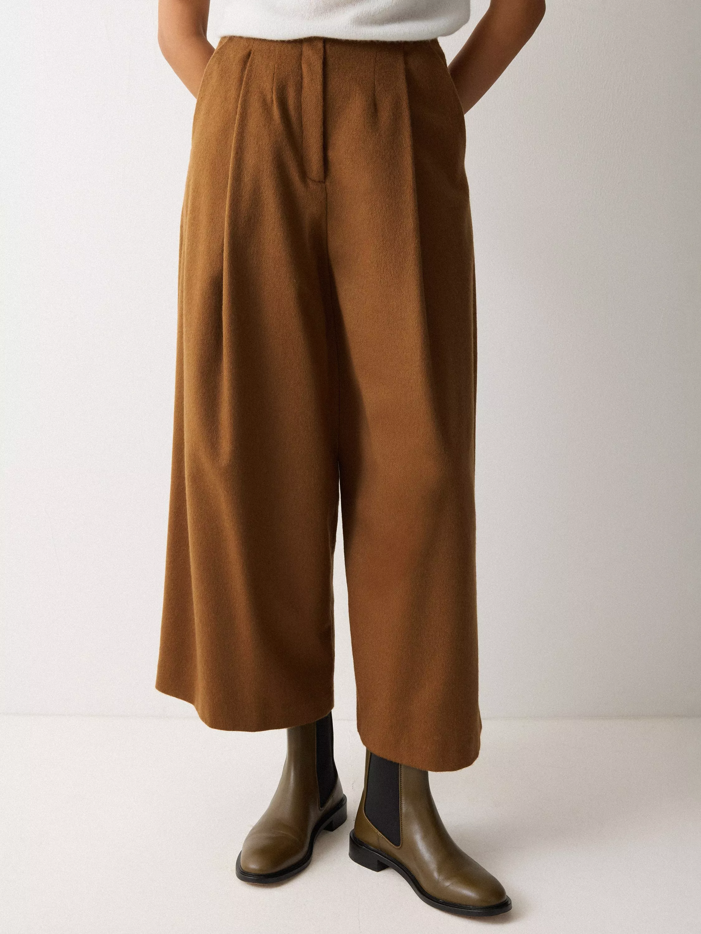 Cut for a wide, high-waisted fit with soft pleat detail, these trousers reimagine tailoring in a more relaxed silhouette. The fabric is brushed wool, a lustrous, soft, and warm material that bridges the gap between classic suiting and laidback dressing.