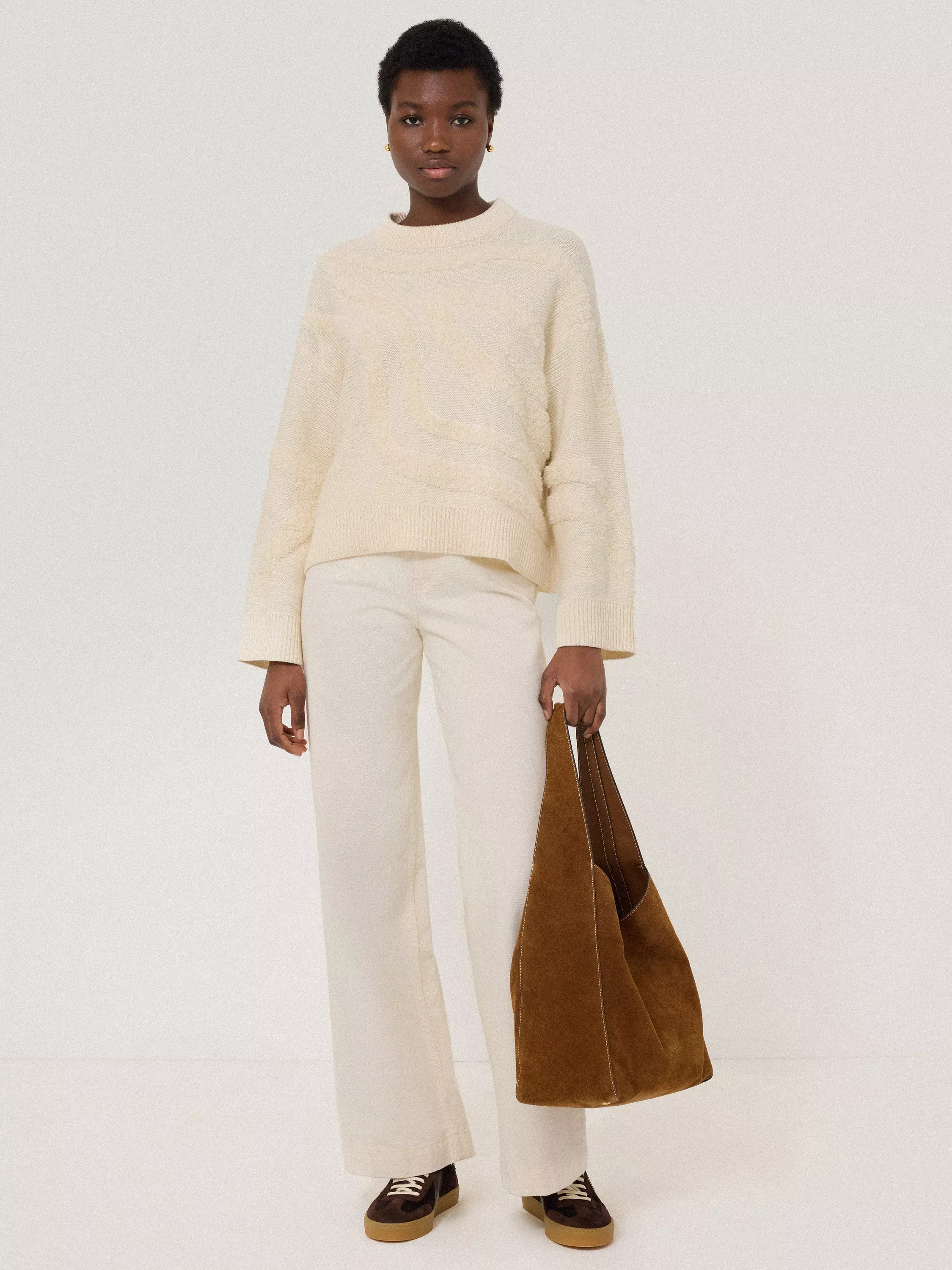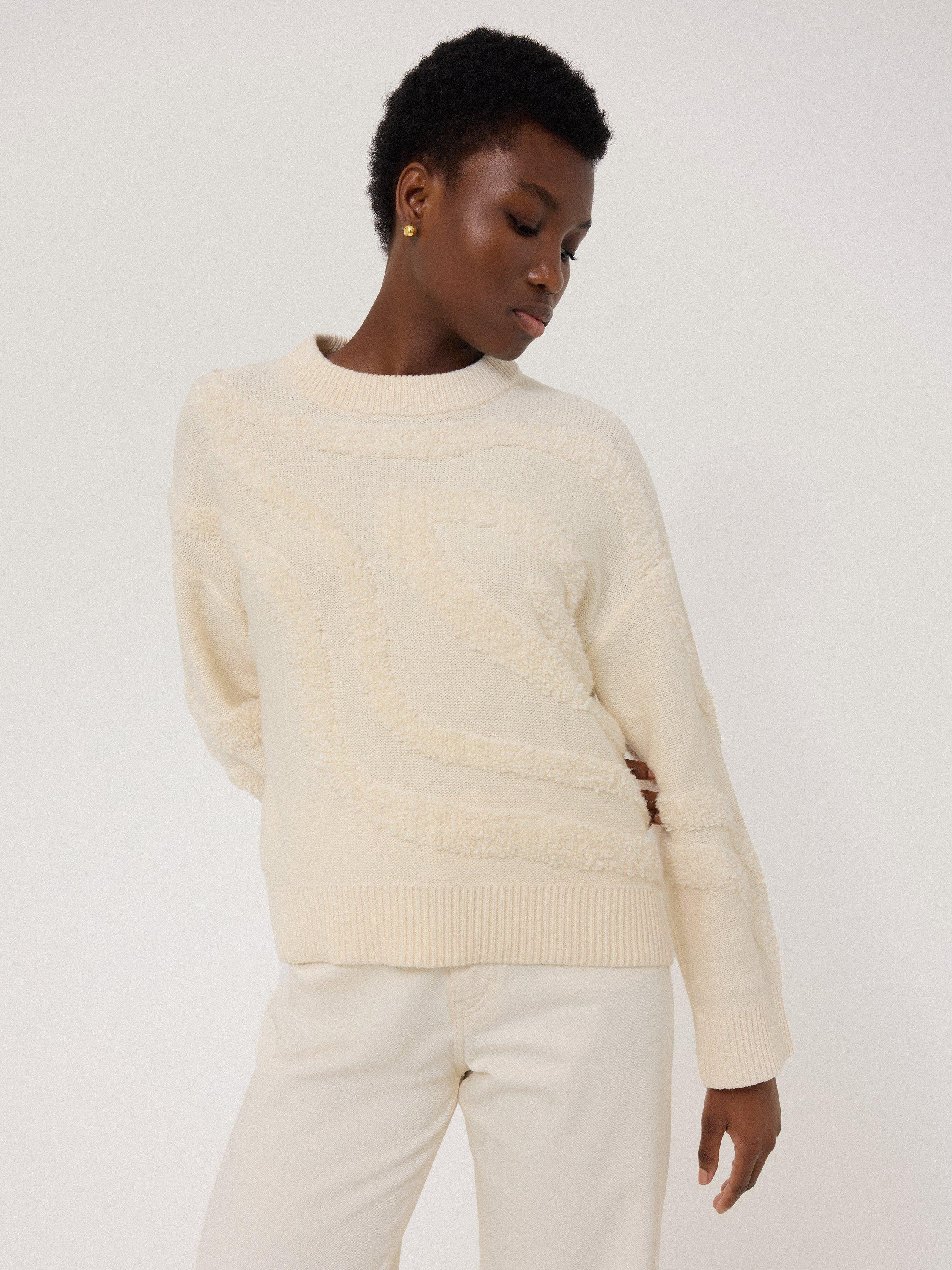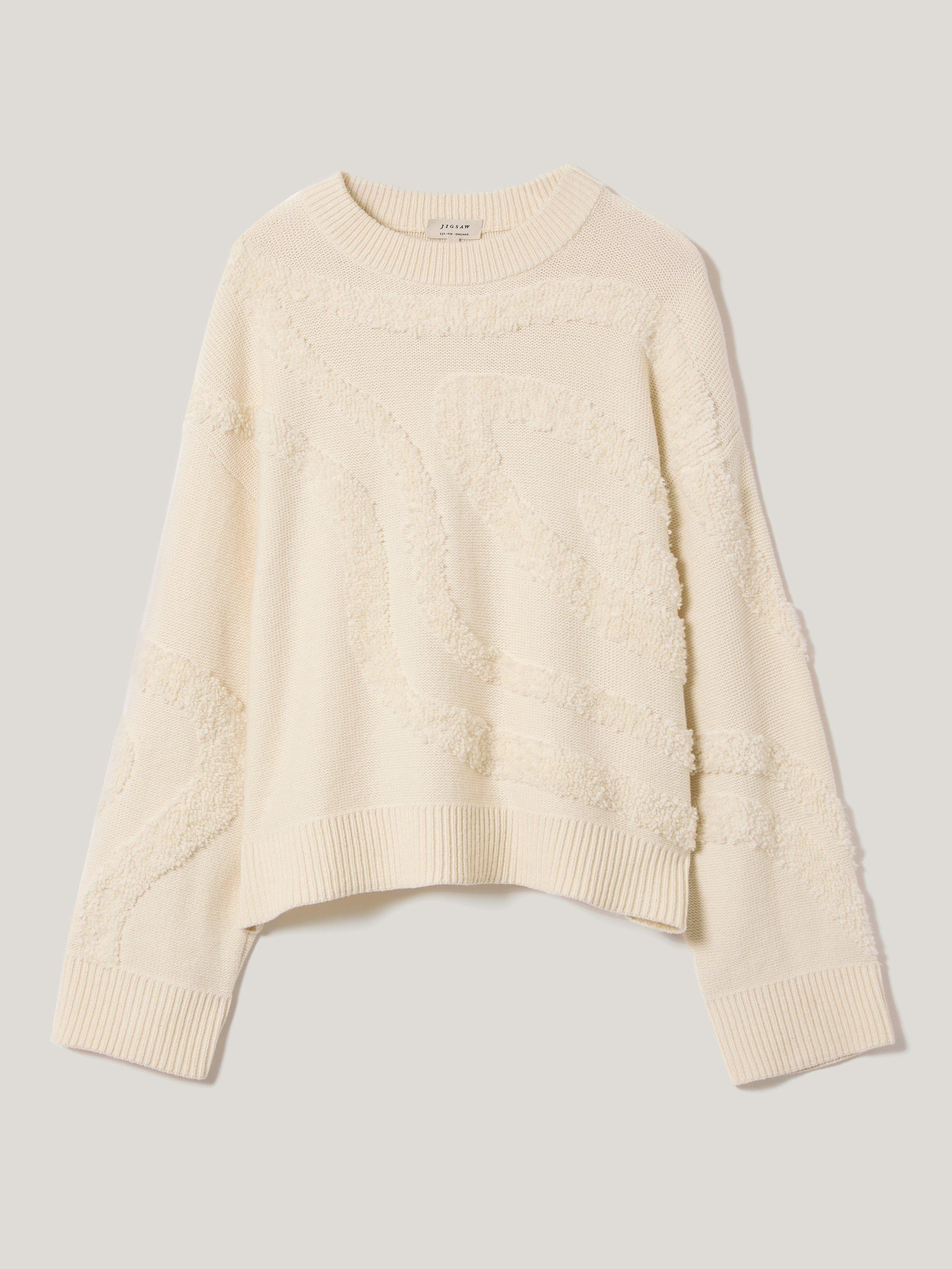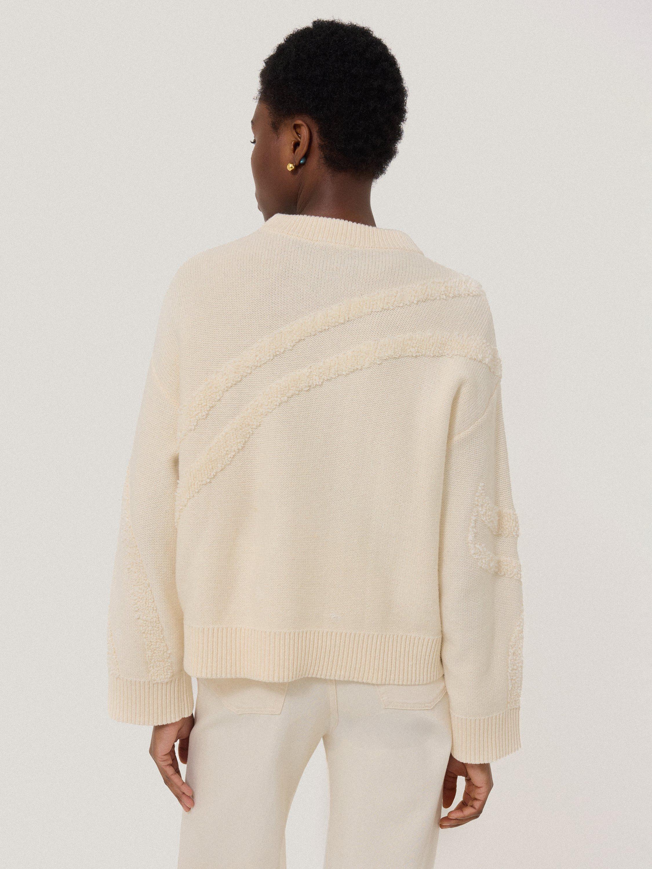 Created using a premium loop, the intarsia technique brings beautiful tactility and interest to this knit for the new season. Undulating lines to the back and the front create an abstract design with a slouch shape perfect for cooler days.