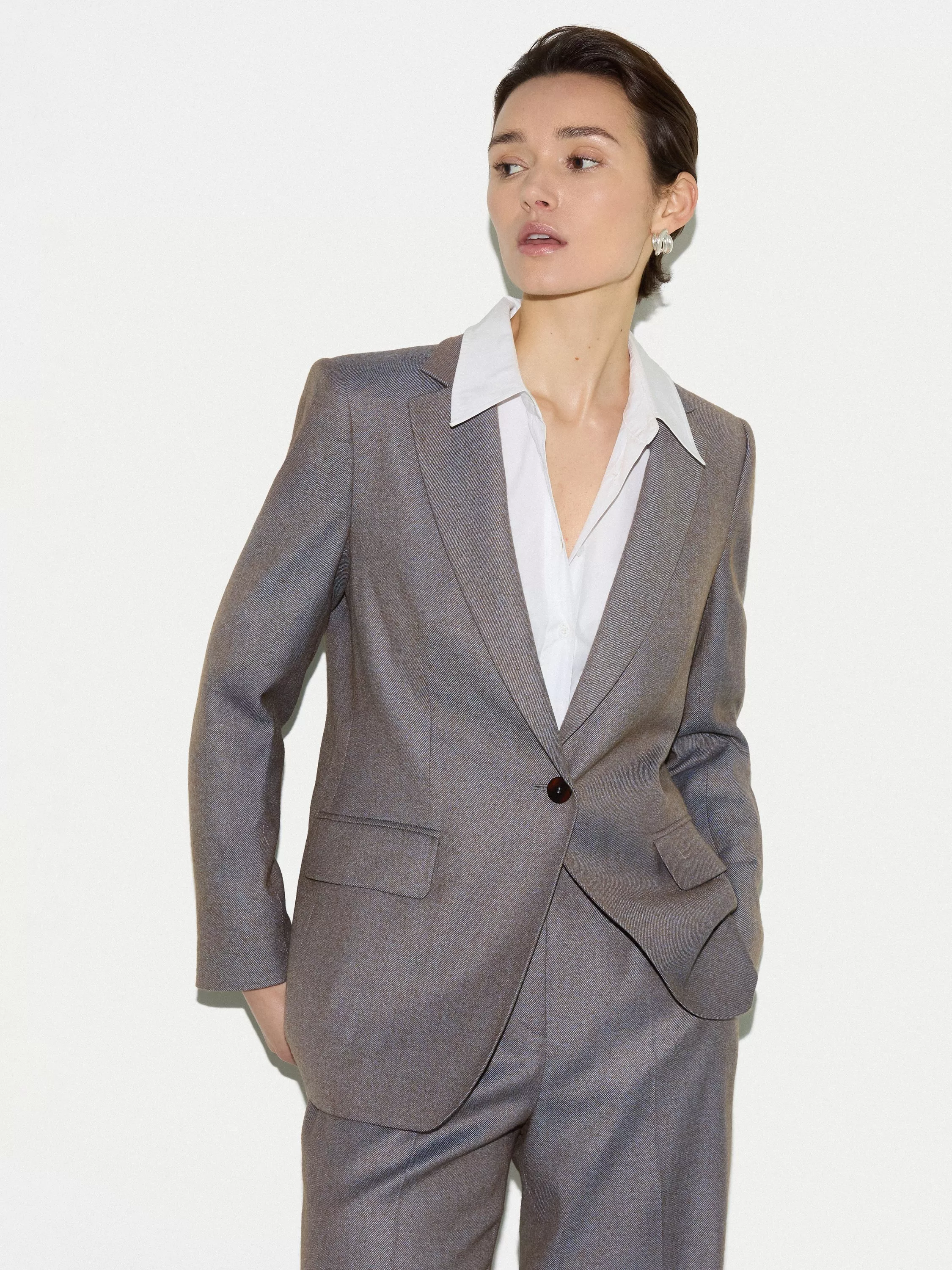 Impeccably crafted from a wool blend, the Knox Tailored Blazer is a testament to timeless design and modern sophistication. Its sharp, tailored fit creates a powerful silhouette, defined by clean lines and a single-breasted front. It layers beautifully over silk blouses for the office or a simple tee for an elevated weekend look.
