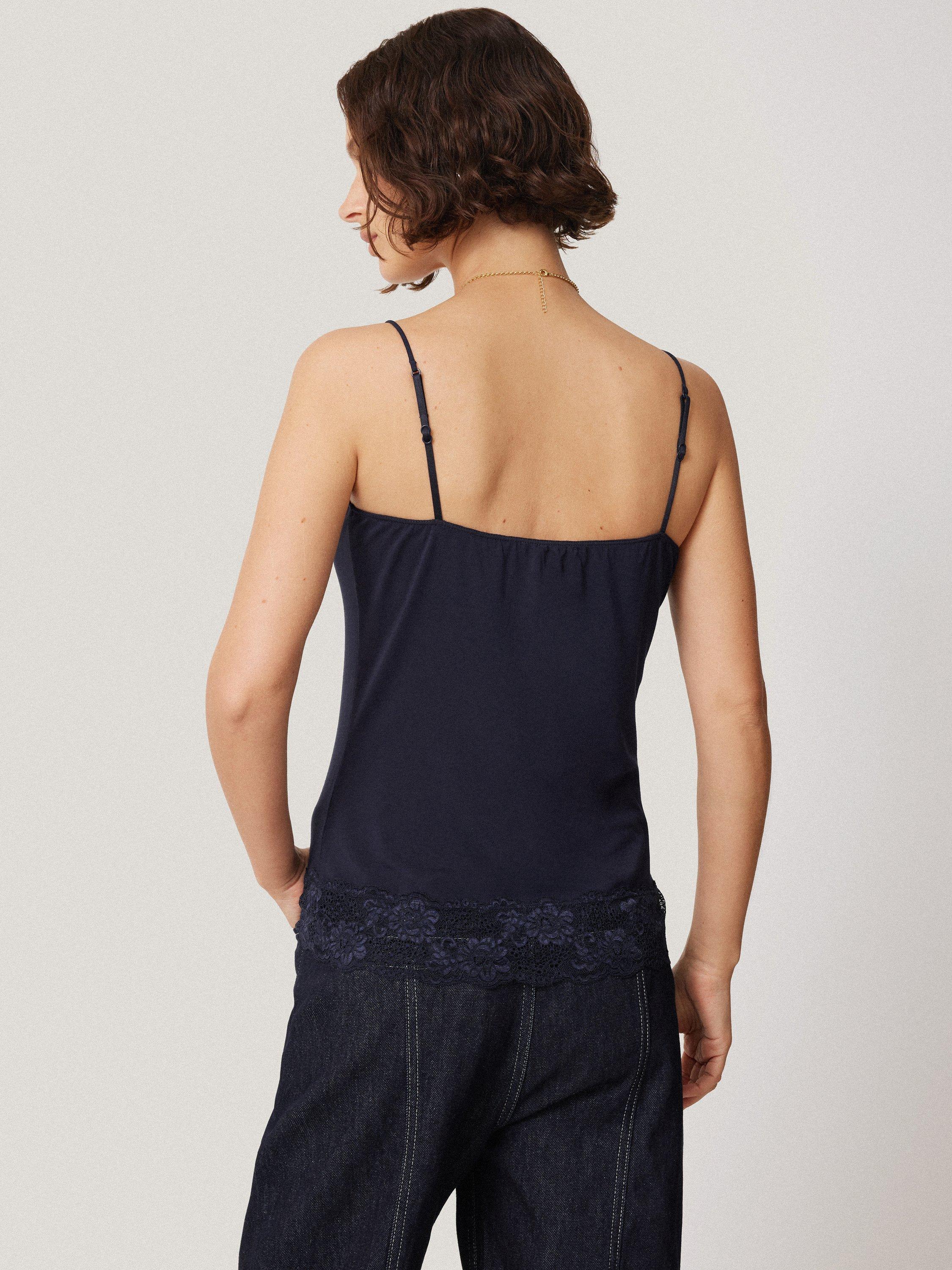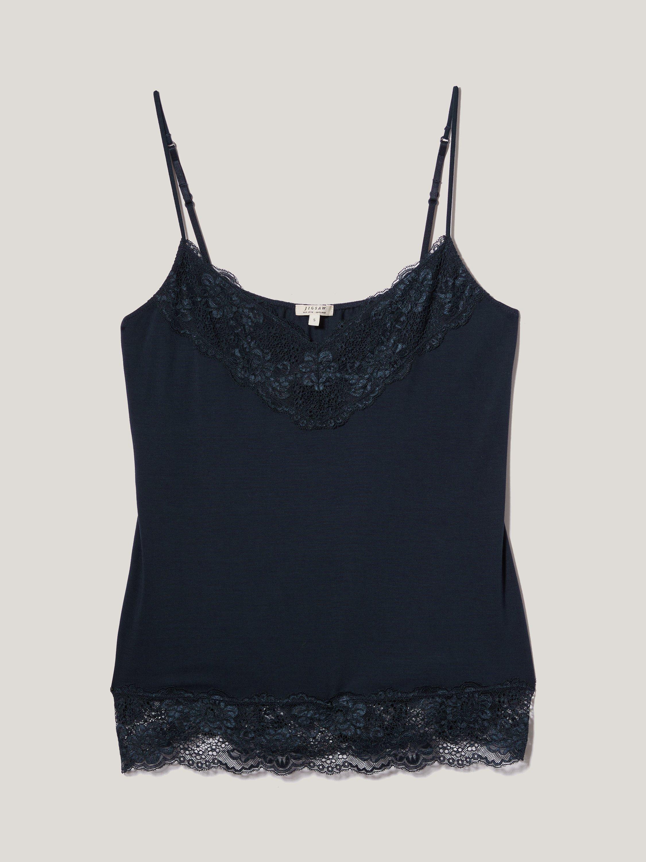 This modal lace vest is a bestselling underlayer. Cut from soft modal jersey with slim adjustable straps, the lace trim detail adds a subtle vintage-inspired twist.