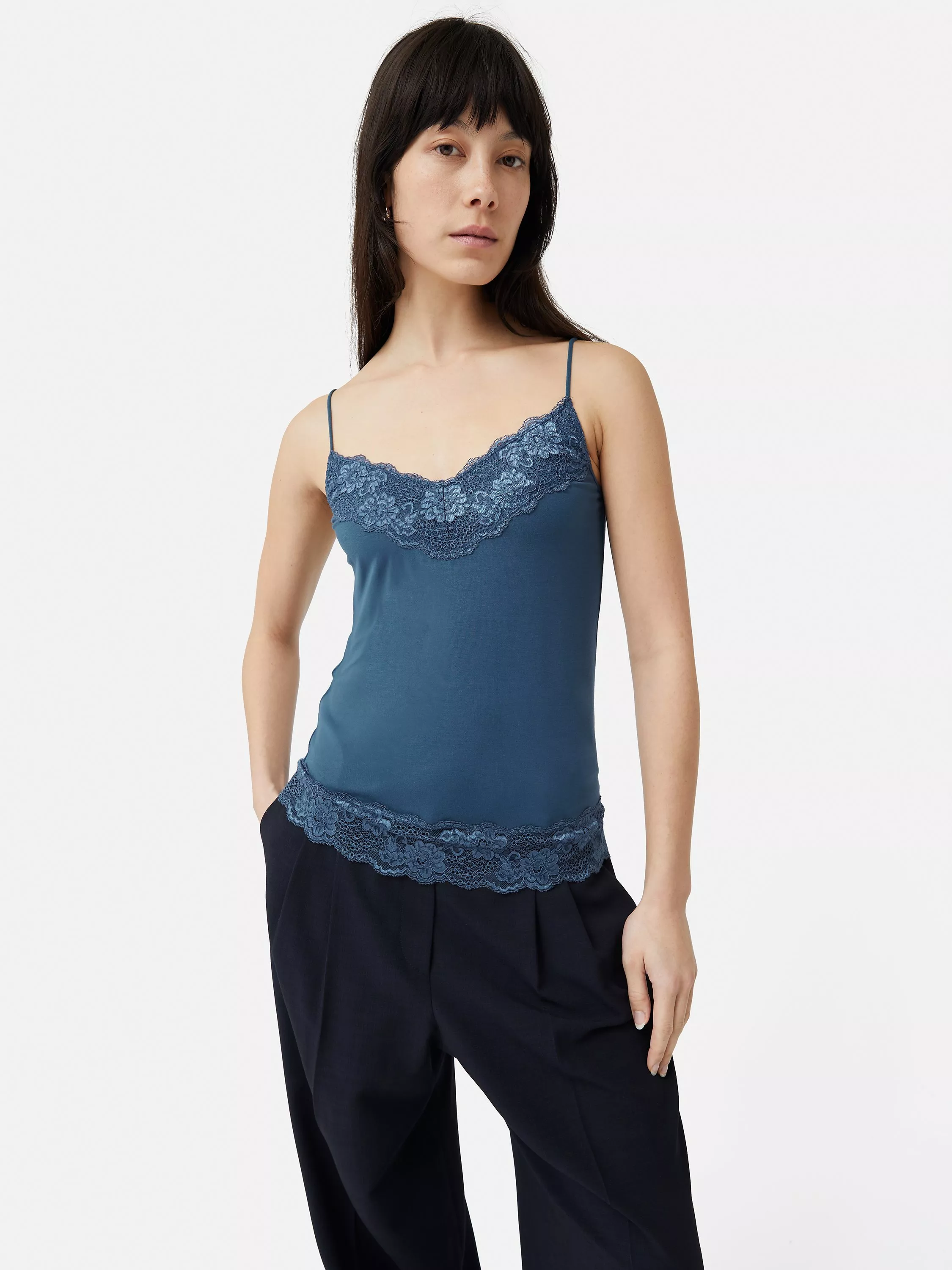 Delicate lace trims lend this design an ultra-feminine finish, wear alone of as a base layer under a tailored jacket for a versatile desk to dinner look.