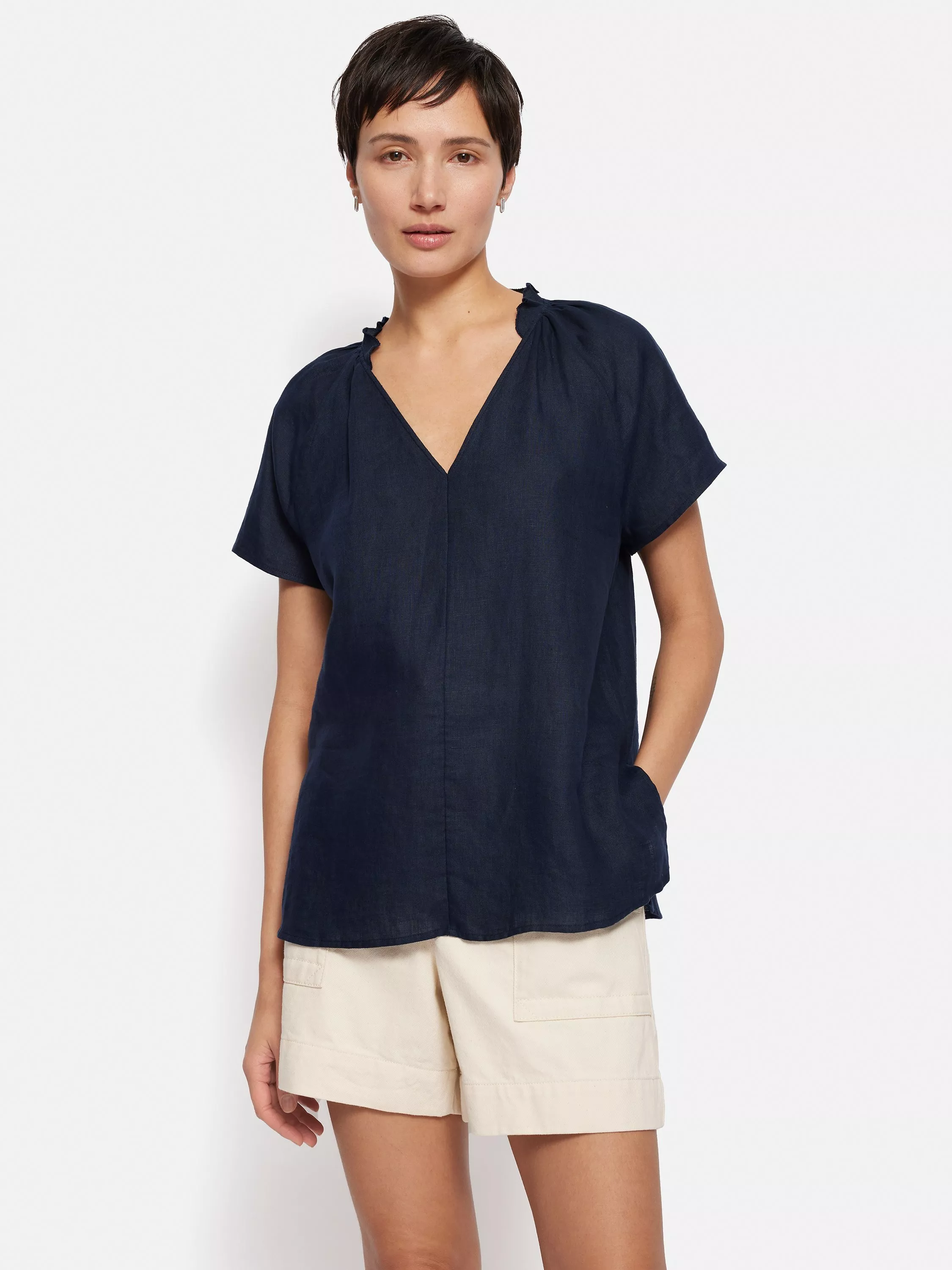 Framed with a v-neckline and short sleeves, the linen fabric offers cool and breathable comfort in warmer months and slips on well with tonal denim ready for the summer.