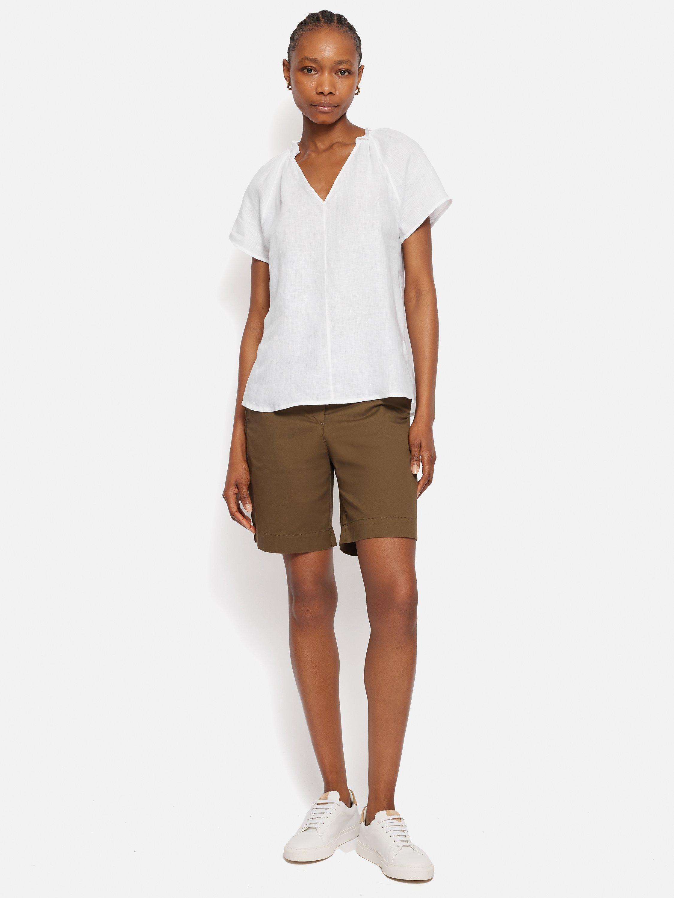 Framed with a v-neckline and short sleeves, the linen fabric offers cool and breathable comfort in warmer months and slips on well with tonal denim ready for the summer.