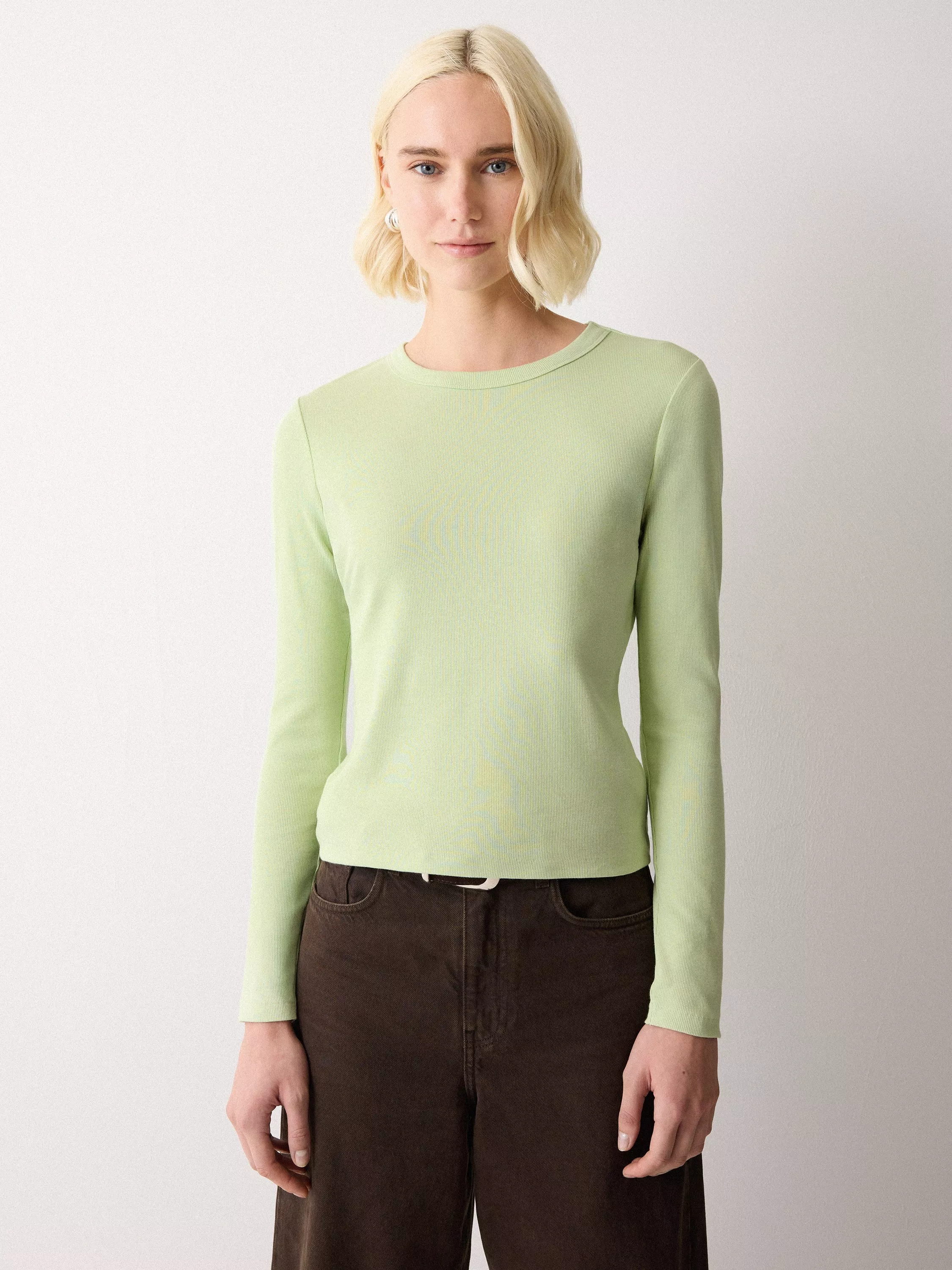A basic with a 90s-inspired silhouette, this long sleeve tee has a cropped baby fit, perfect for wearing alone or layered in a soft cotton jersey.