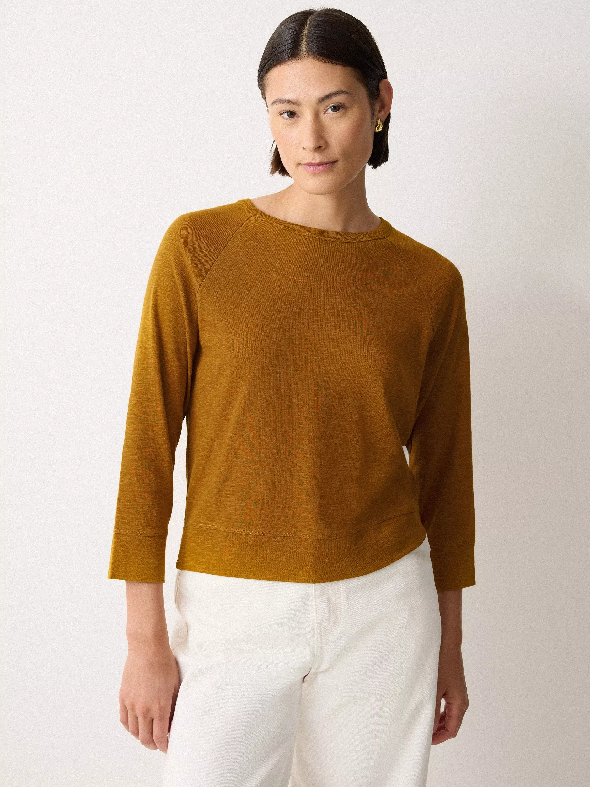 Luxurious cotton top cut from a beautifully textured slub jersey. This thoughtfully designed wardrobe staple is inspired by the iconic baseball tee with raglan armholes and deep hem band. An effortless piece that is equally suited for layering or wearing alone.