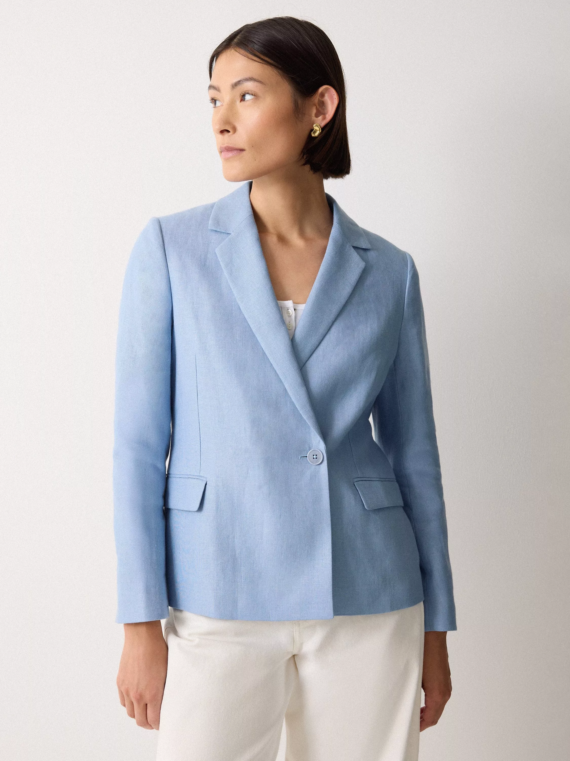 This summer's tailoring capsule spotlights Irish linen, honouring Jigsaw's relationship with renowned mill, Baird McNutt. The Maree blazer is tailored for a slightly shorter silhouette than traditional cuts for a boxier shape, with a single fastening to create an asymmetric front.