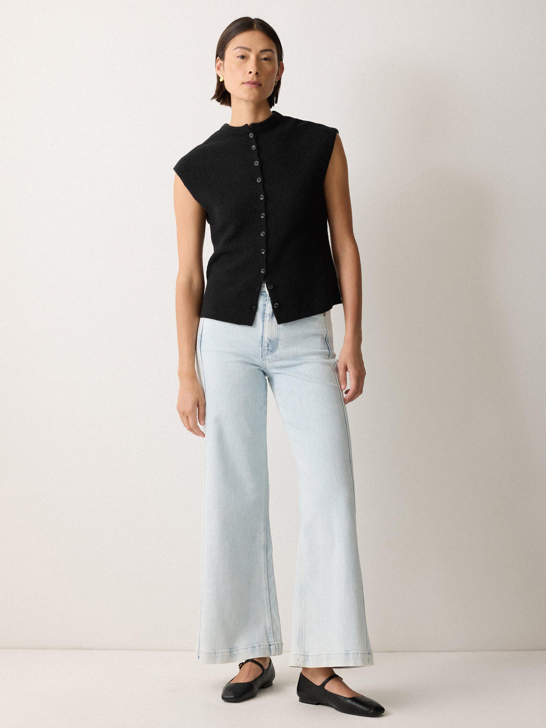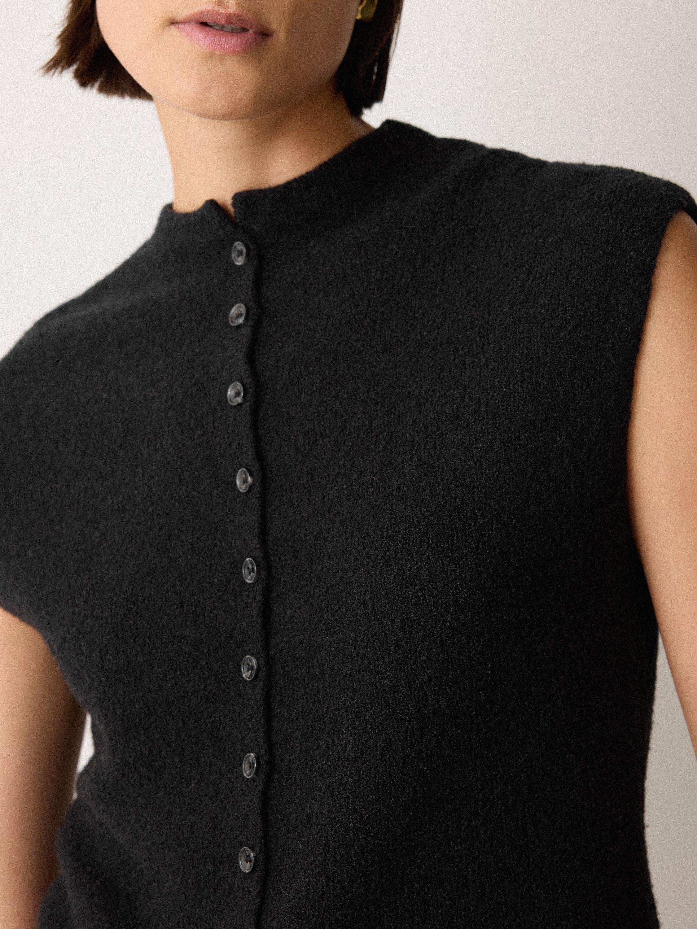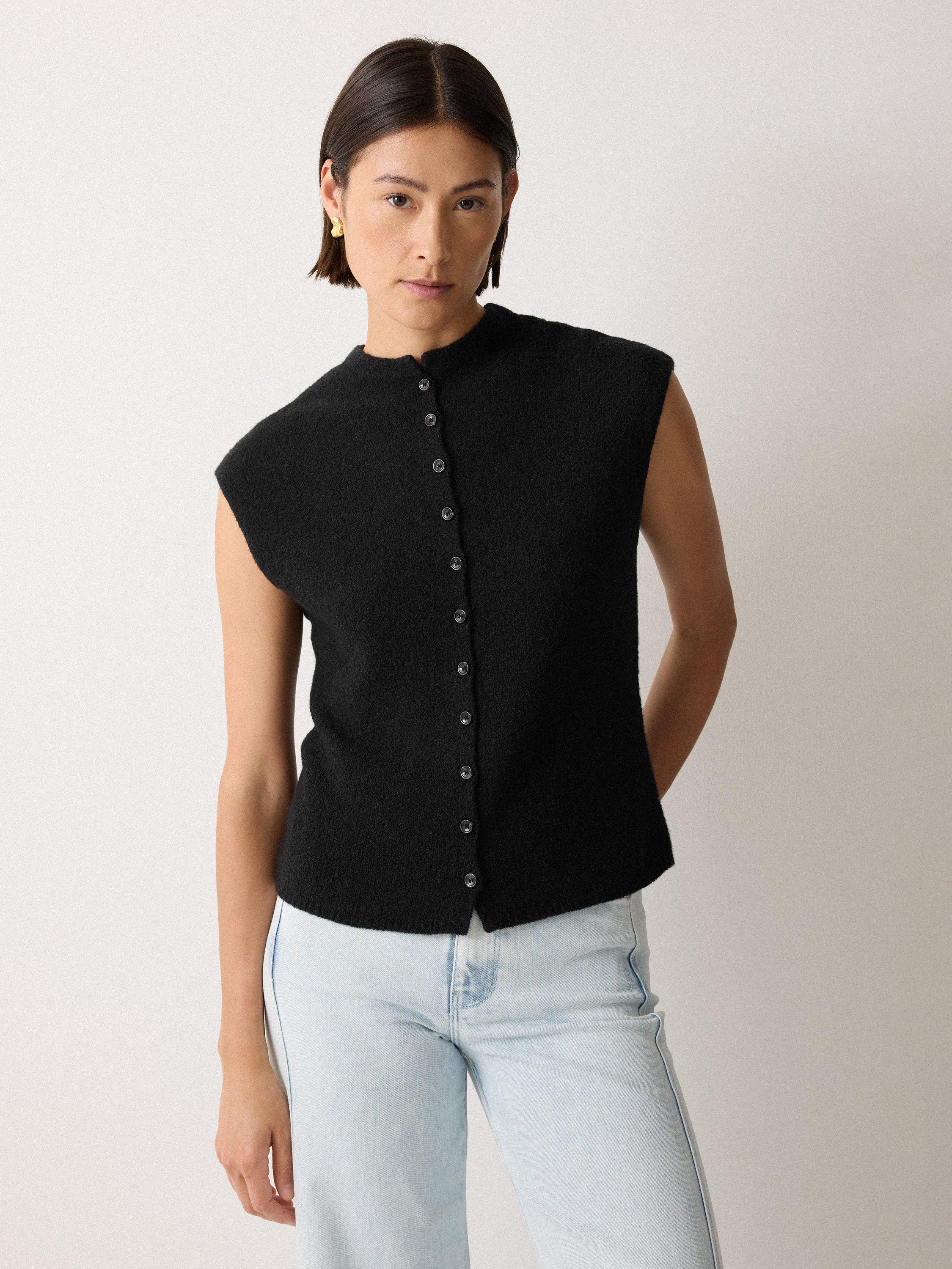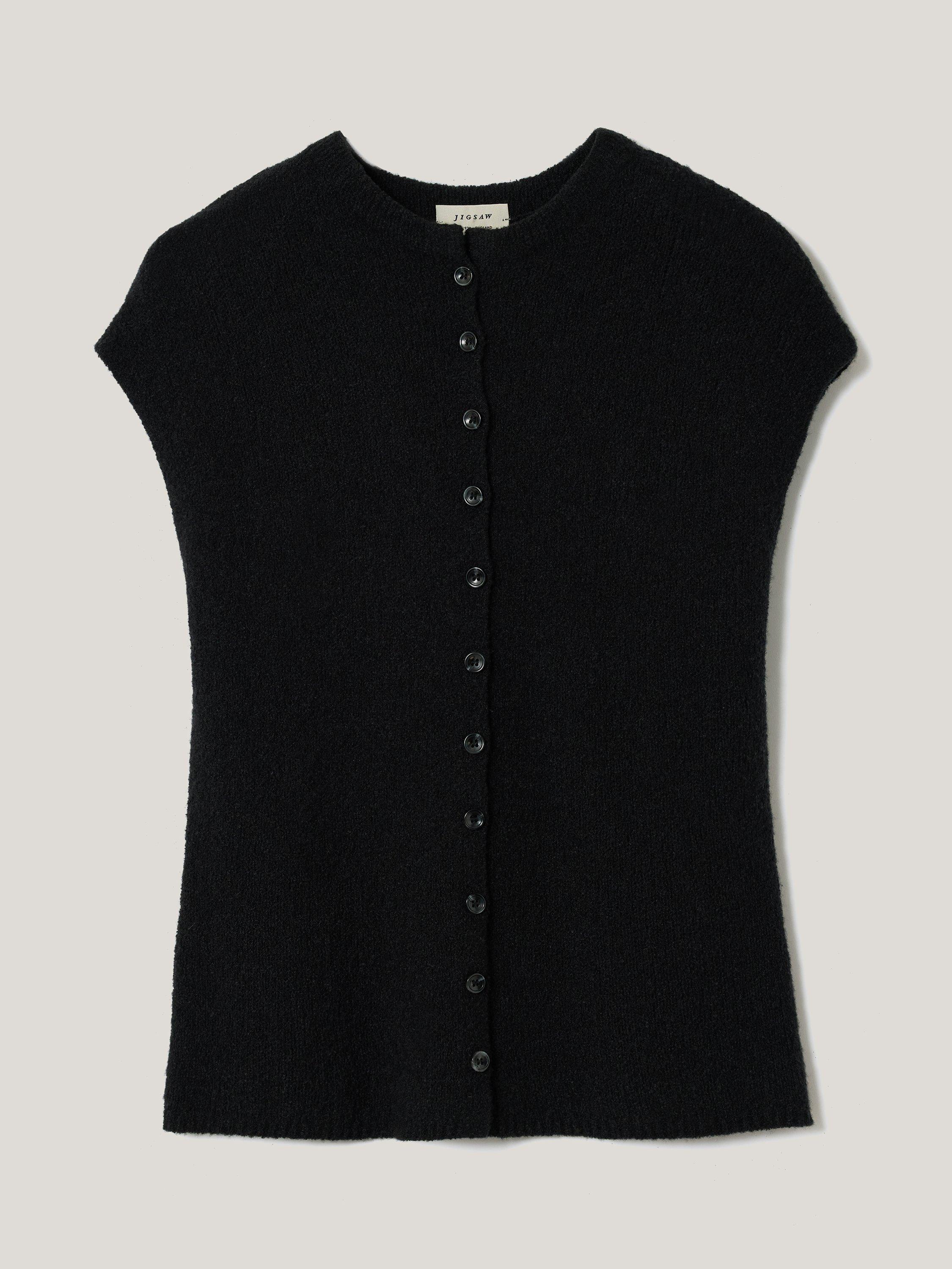We love the button-down tank for its endless versatility and layering options. This season sees it reimagined in a unique micro boucle fabric for subtle texture, framed with elegant cap sleeves.