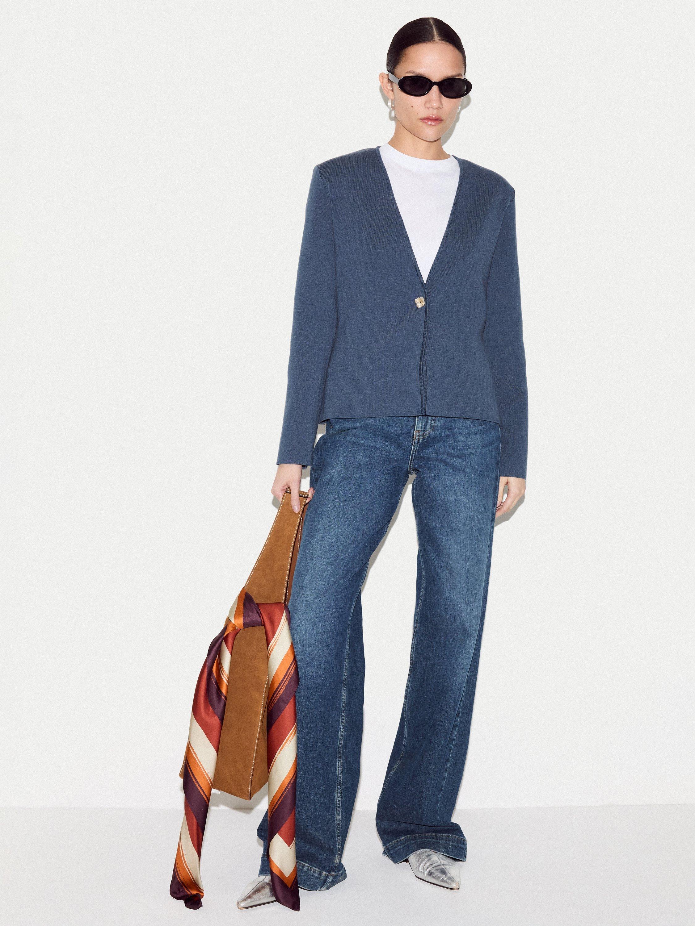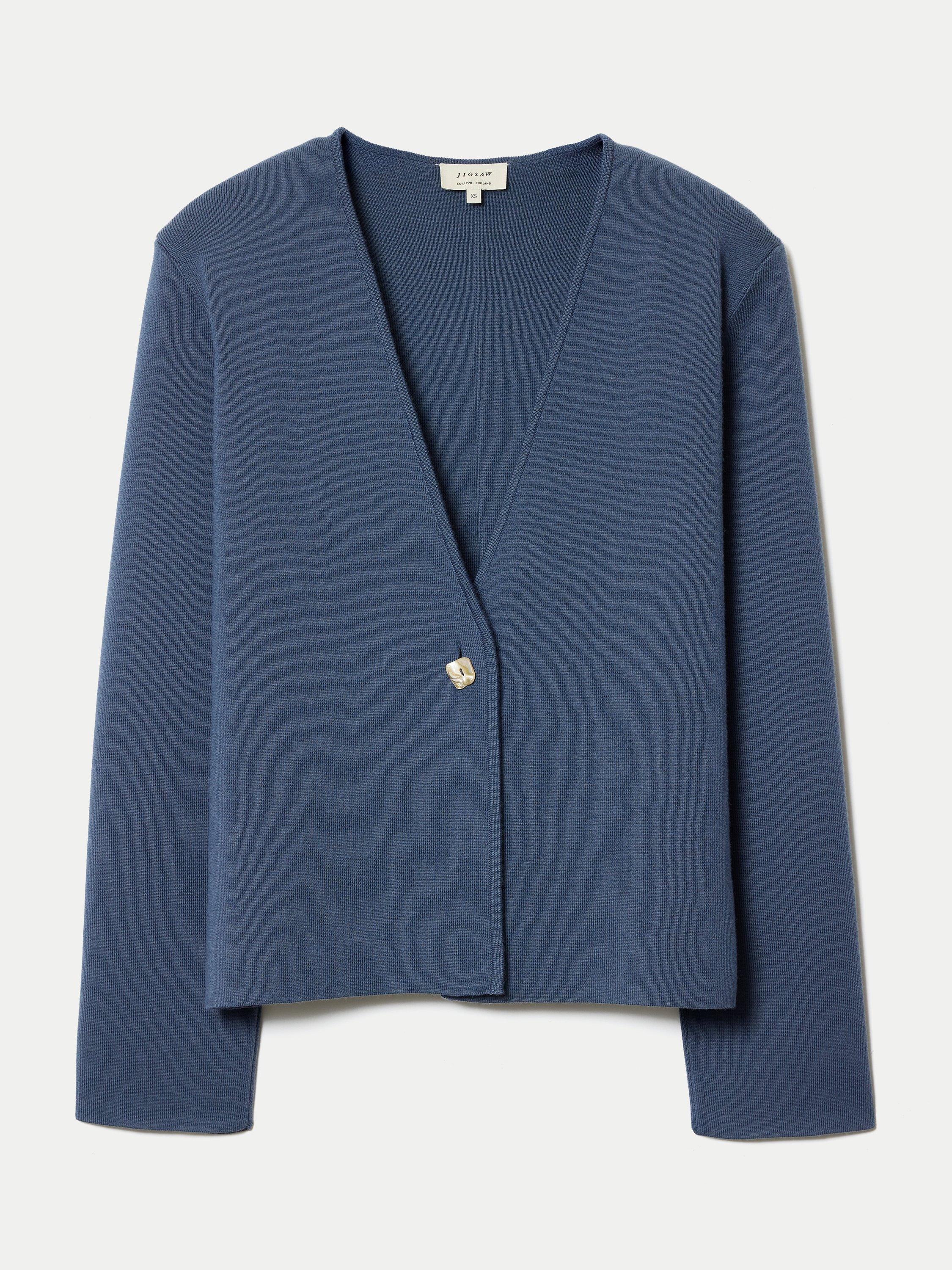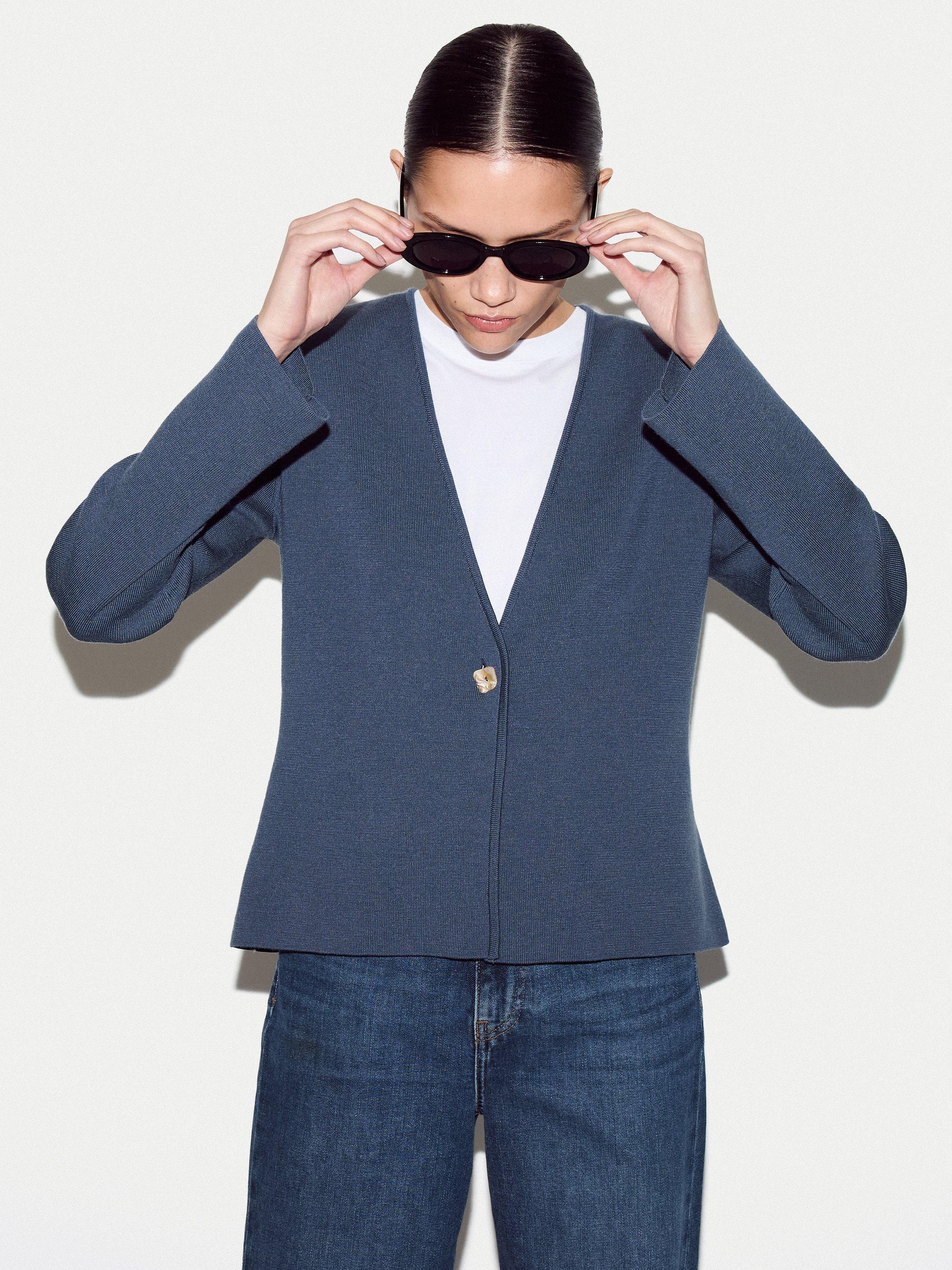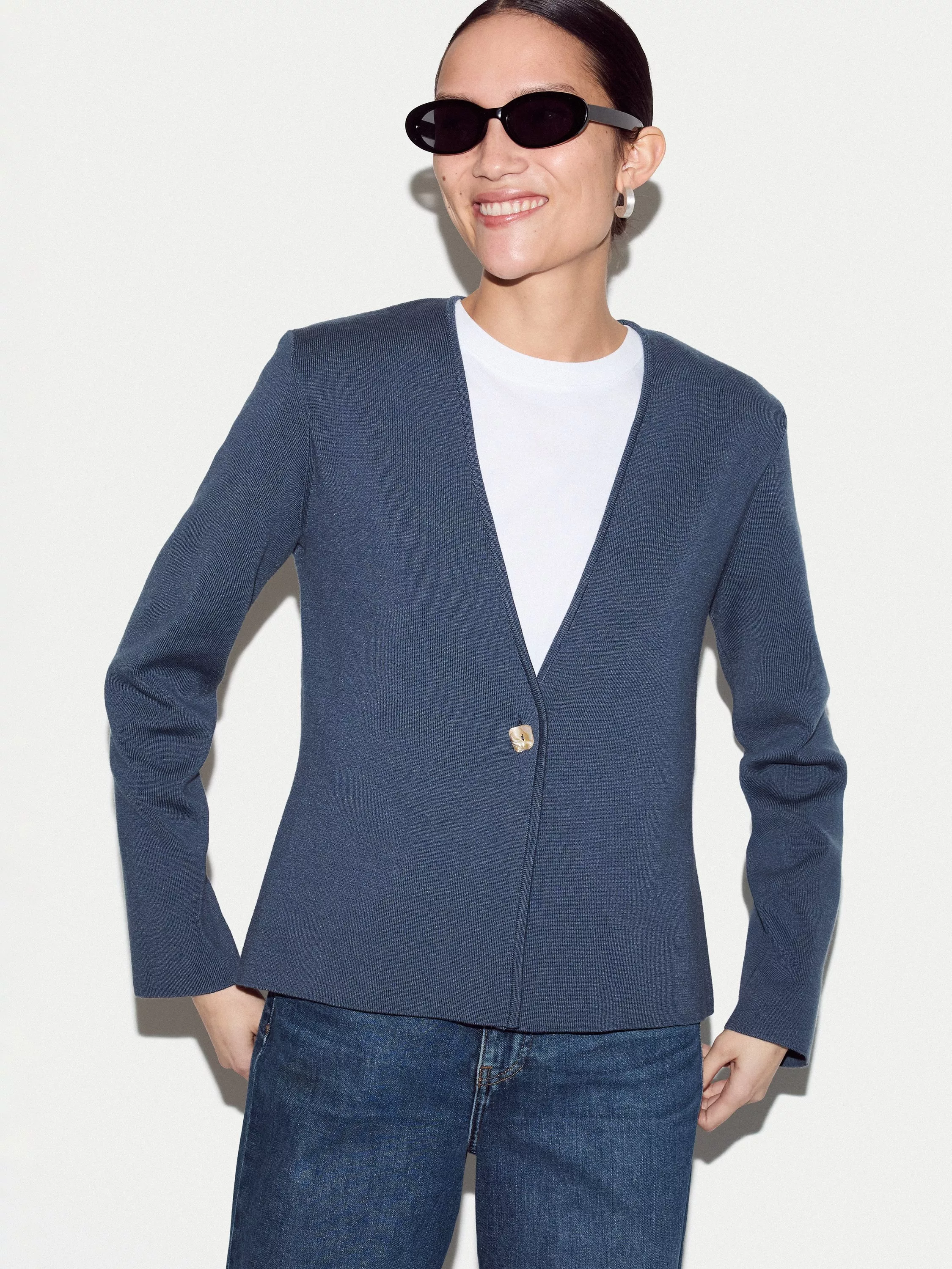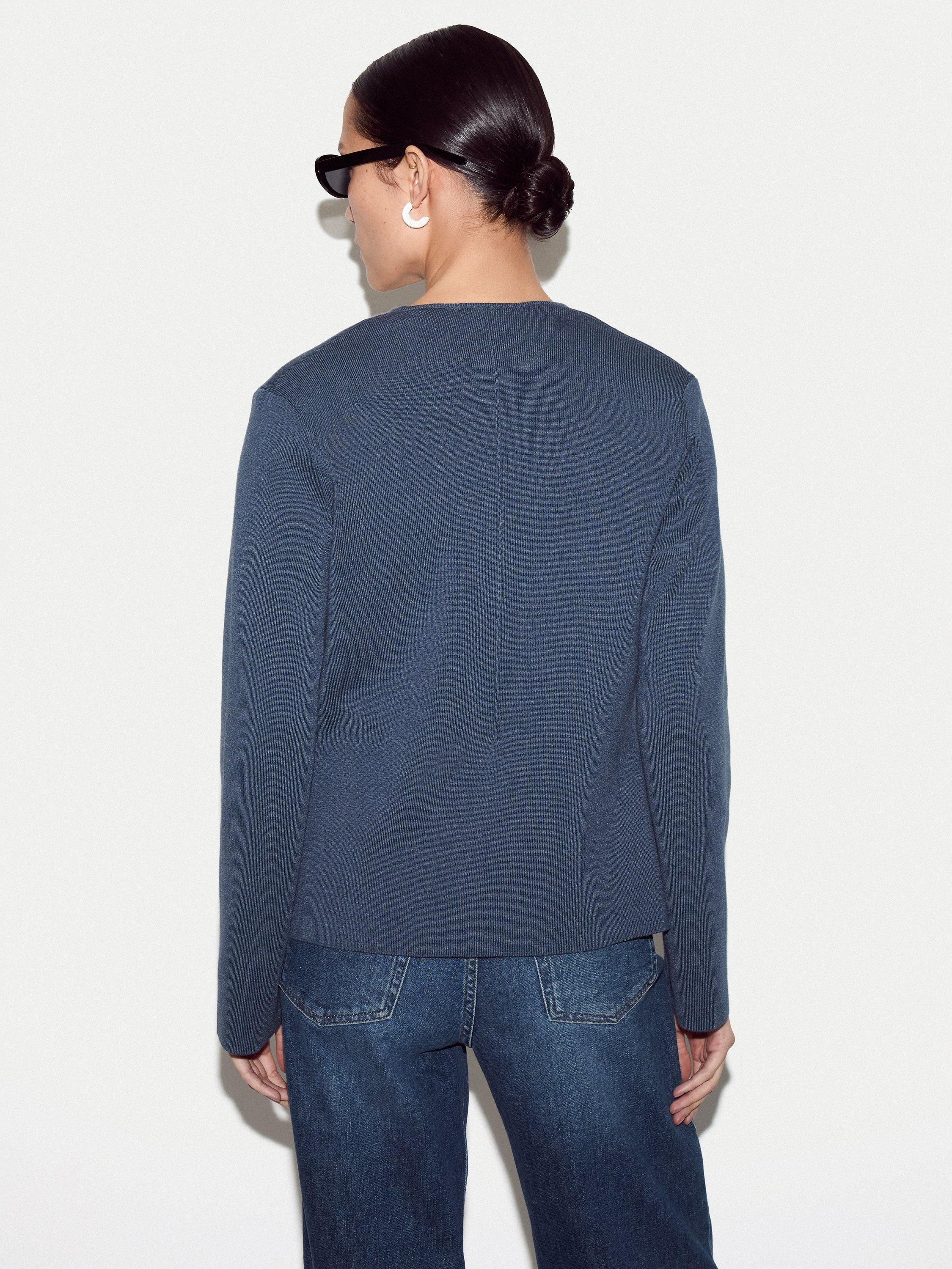 A relaxed but structured layering piece, this wool-rich knit jacket features clean lines and a minimalist design. The lightweight construction makes it perfect for transitional weather, pairing effortlessly with tailored separates.
