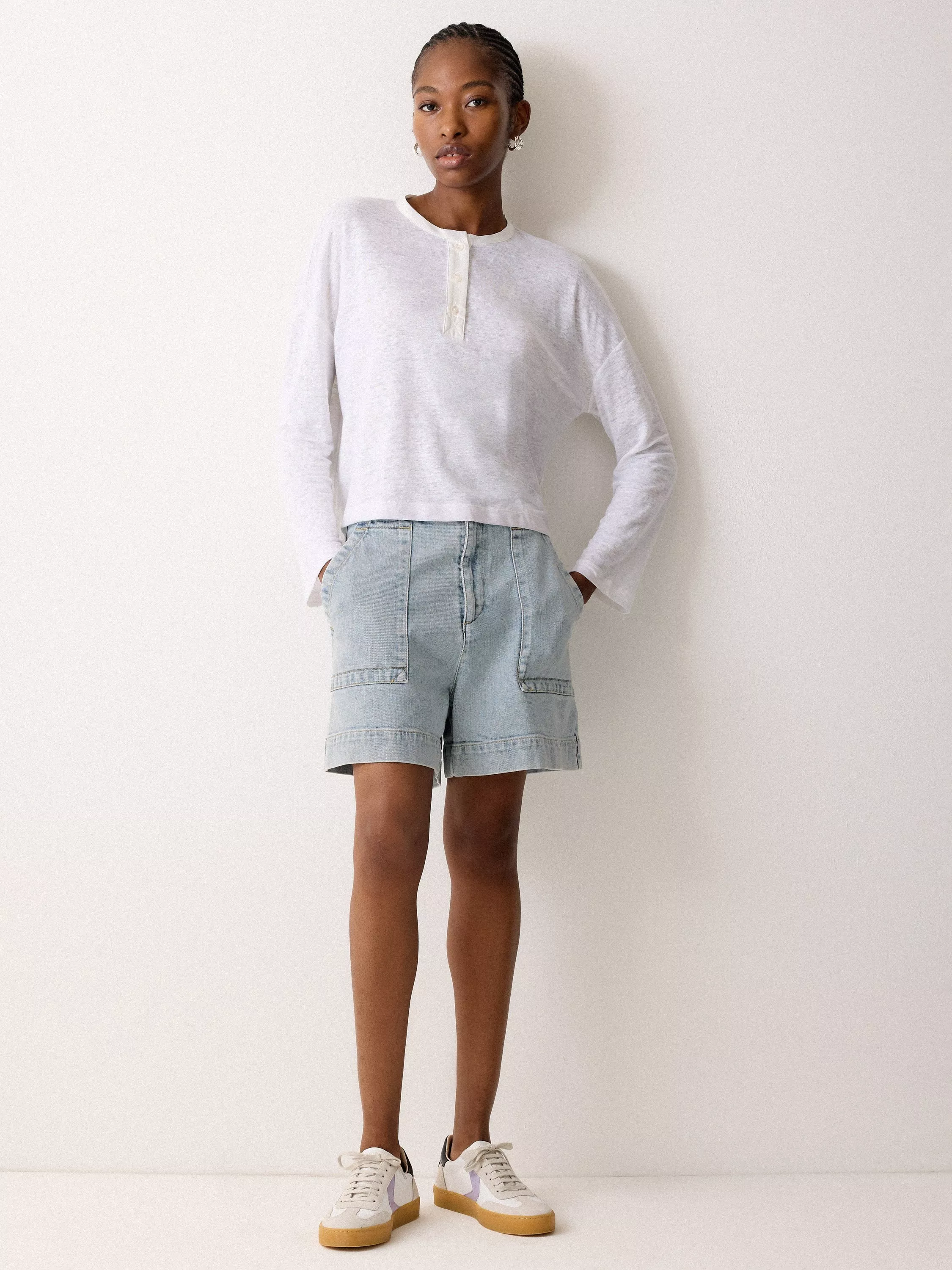 Crafted from pure cotton denim, these high-waisted shorts feature an elasticated waistband for optimal comfort. Front and back patch pockets, along with heavy topstitching details contribute to both functionality and a distinctive aesthetic.