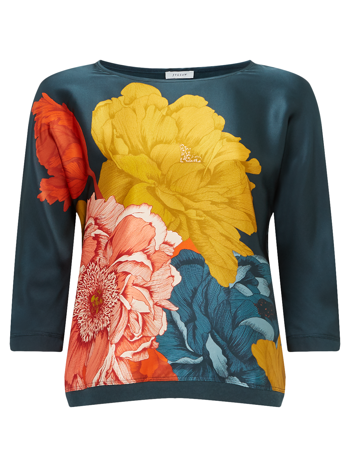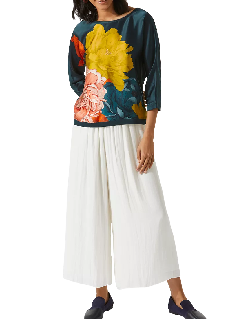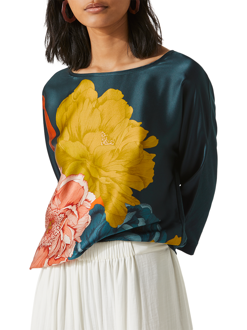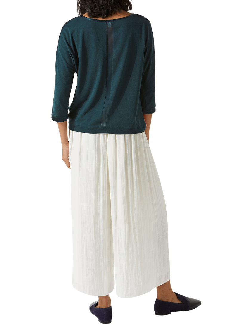 Boasting a pure silk front and jersey back. It features three-quarter length sleeves and a wide round neckline.