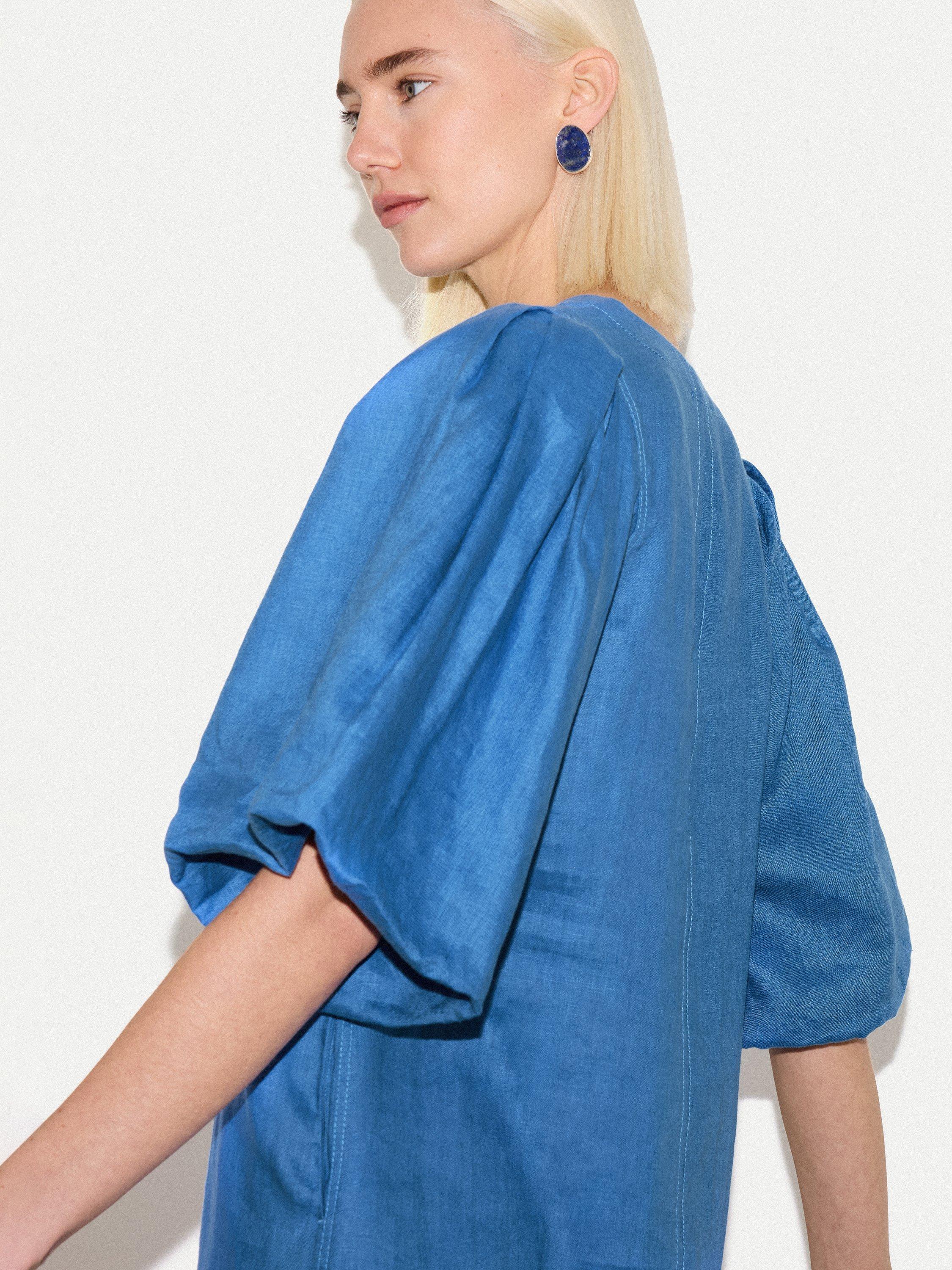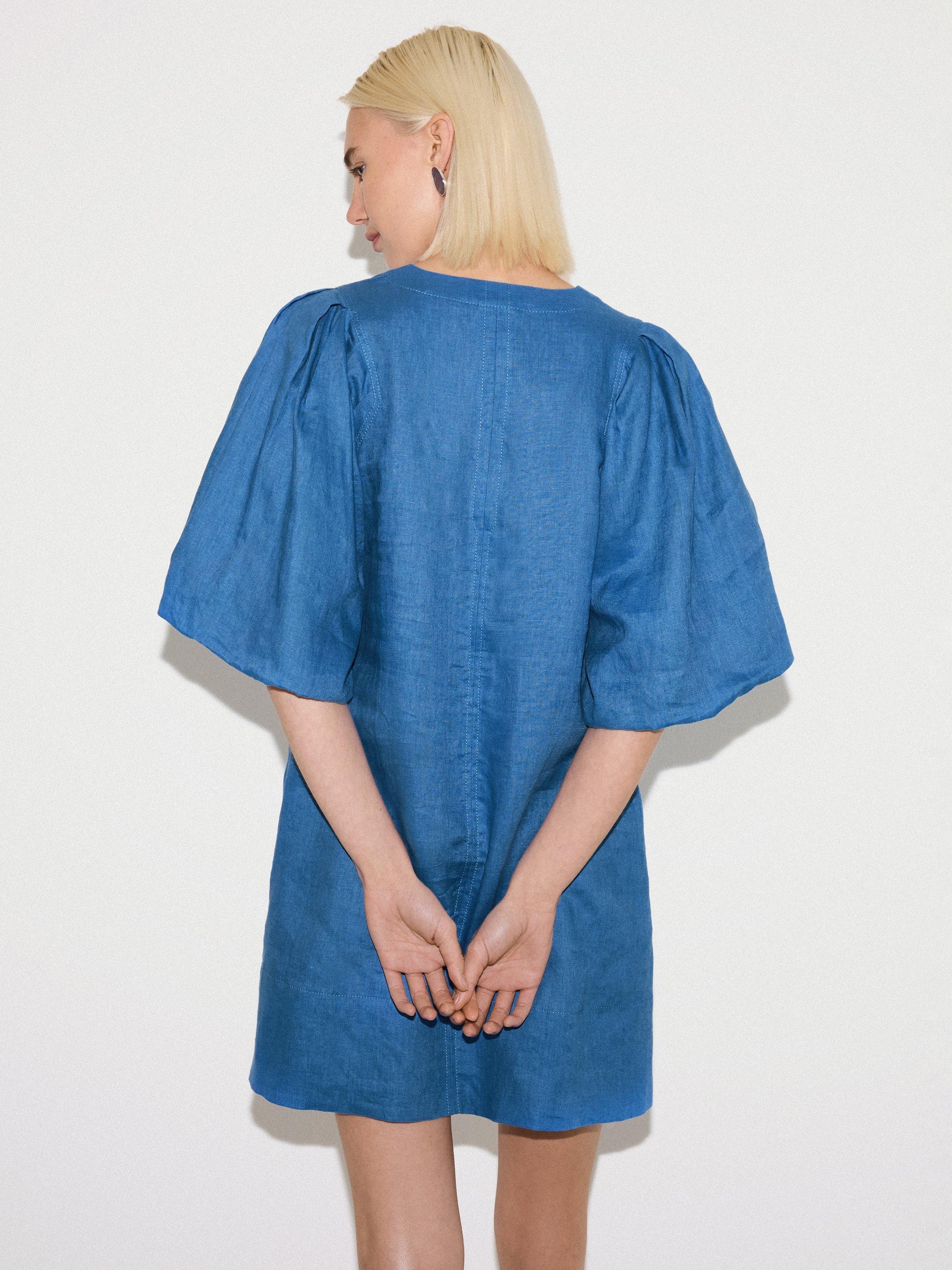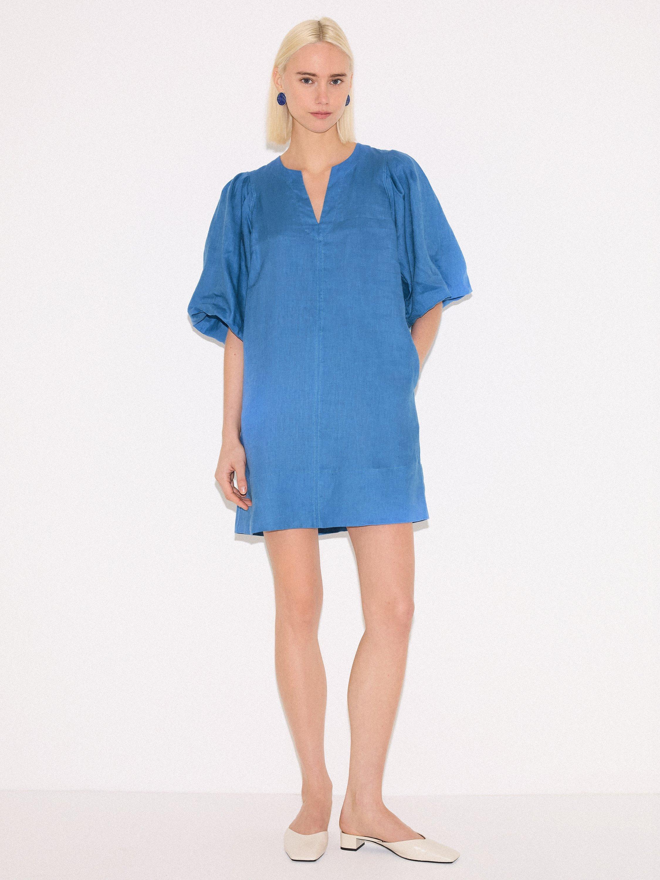 Framed by voluminous puff sleeves gives this summer mini dress subtle drama for day or evening wear. Airy in a soft, lightweight linen, complete this kaftan style with gold jewellery and a pair of sandals for effortless ease under the sun.