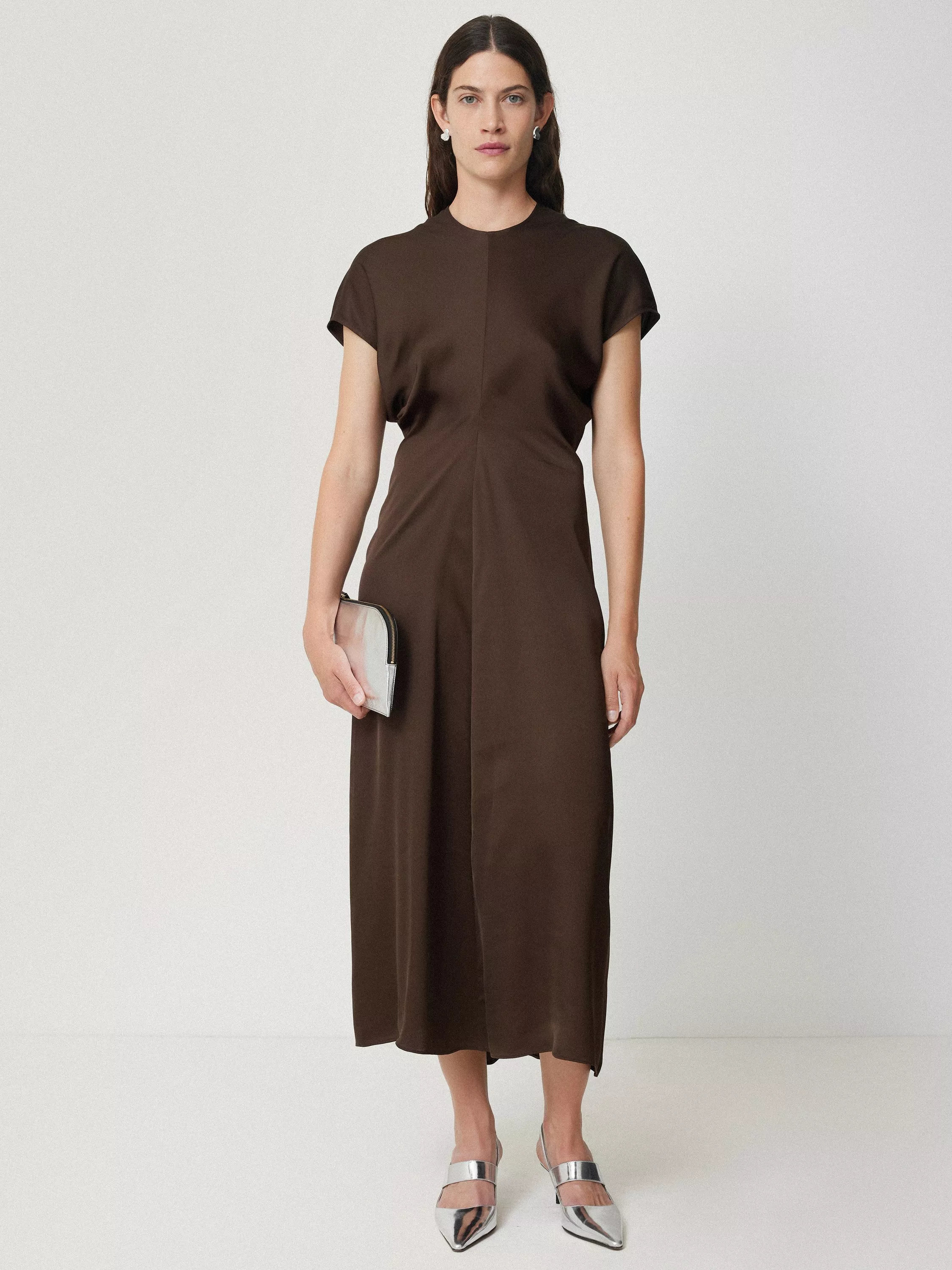 With a drapey yet form-fitted silhouette, this midi dress from Jigsaw is crafted from satin crepe. With a simple round neck and cap batwing sleeves, it is free of unnecessary embellishments.