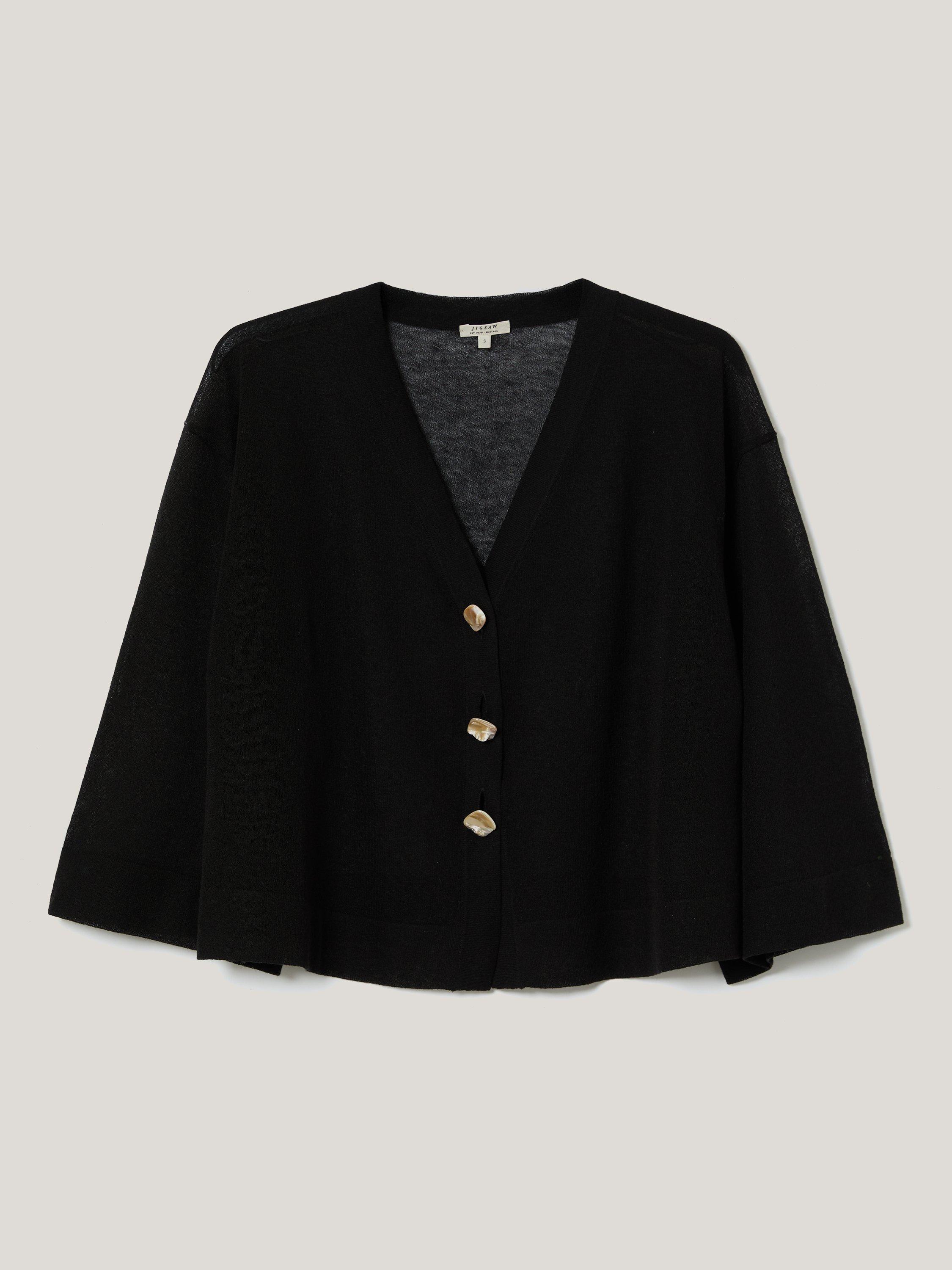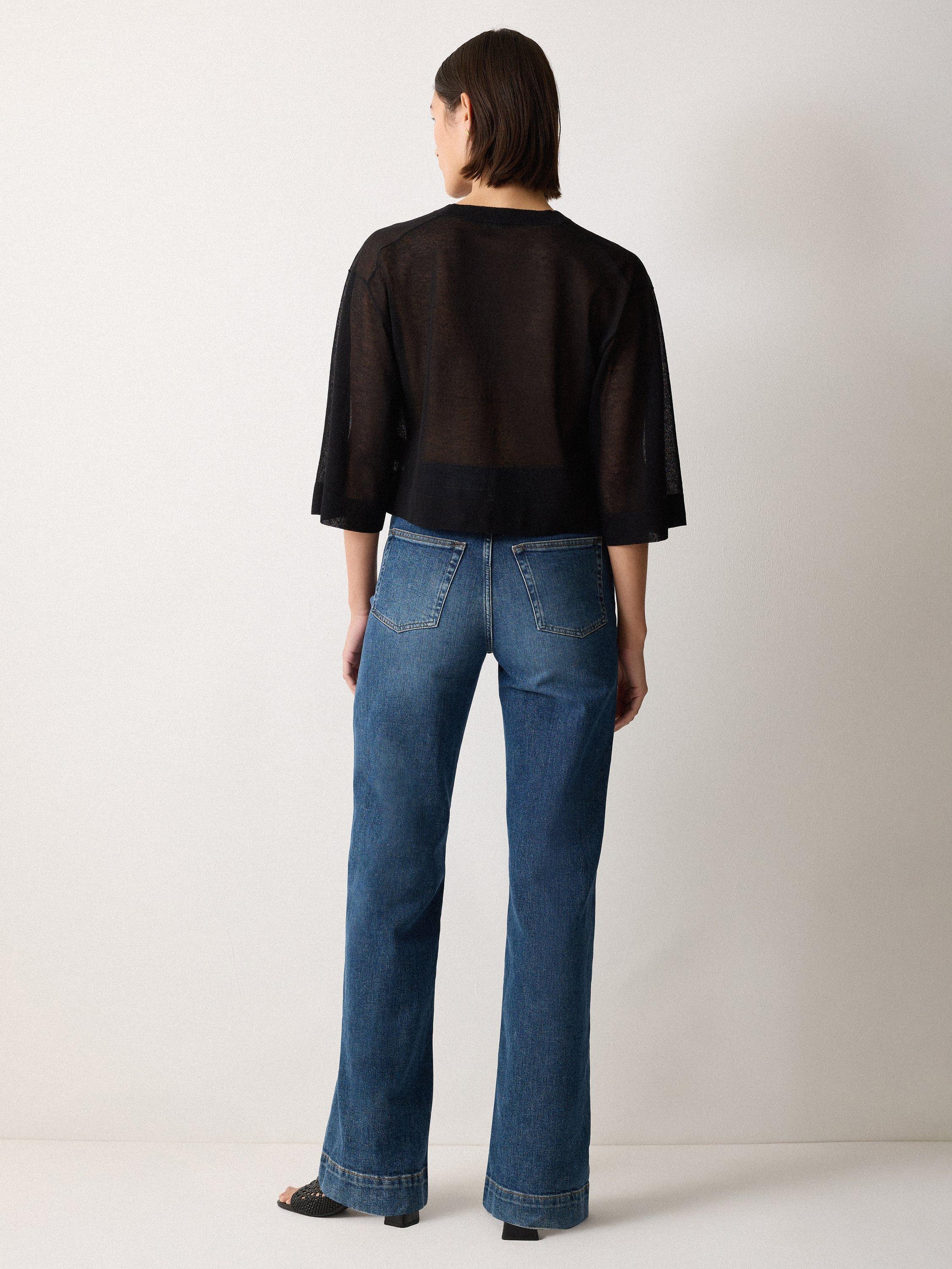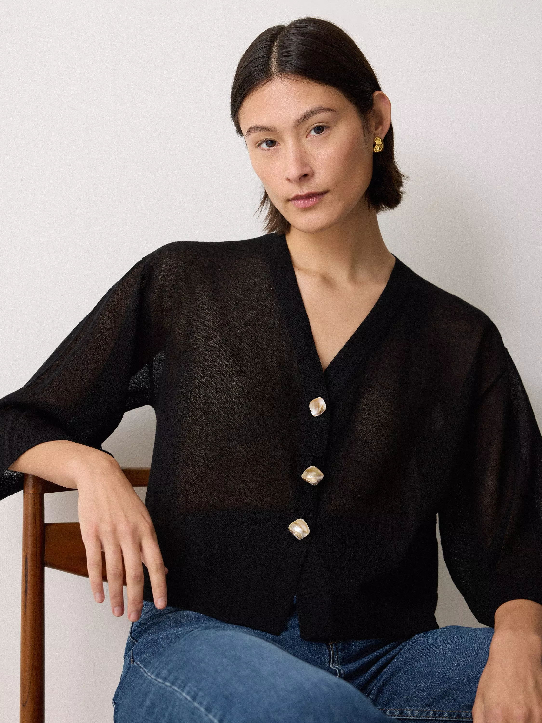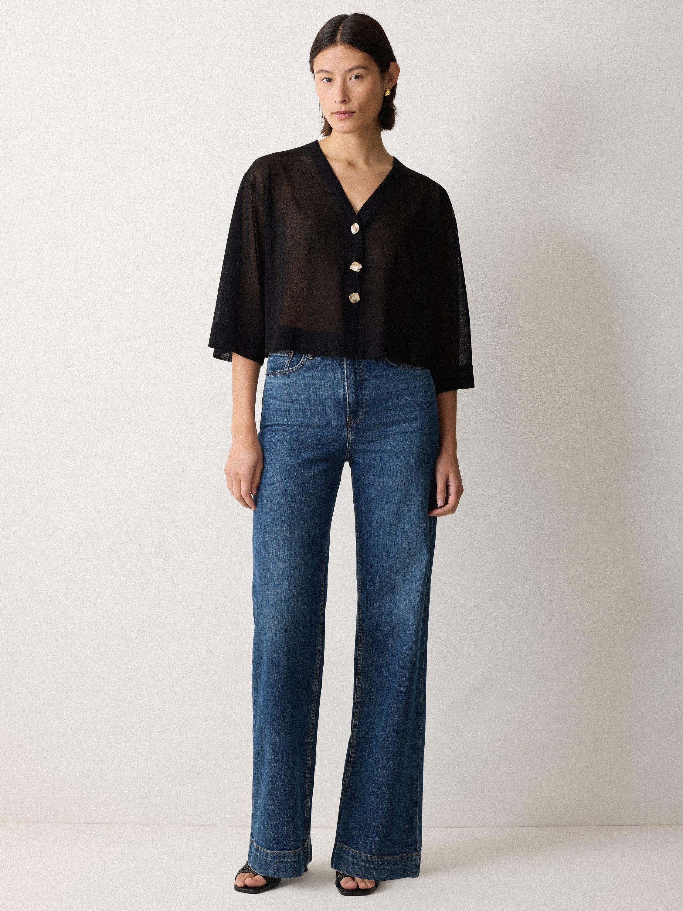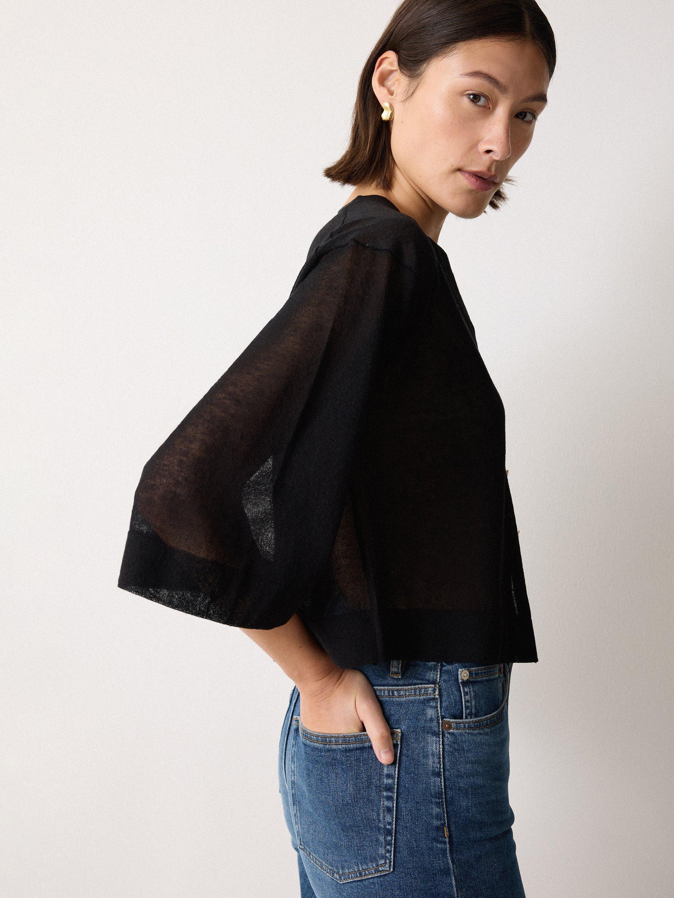 Opt for a barely there cover-up with this beautiful cardigan in a flowing sheer fabric blend to try out transparency in a modern way. Cut for a cropped silhouette with flared sleeves, button up over your linen ensembles for true summer romance.