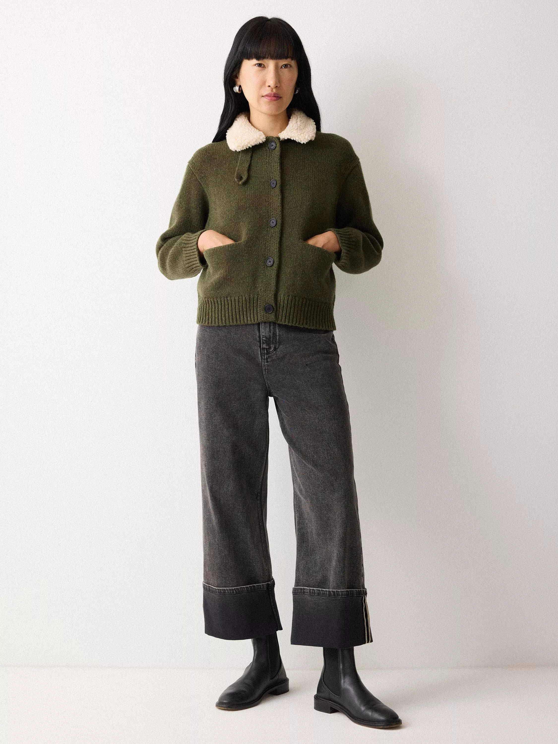 Jigsaw's sherpa collar cardigan is perfect for inbetween weather days to layering. Featuring rounded shoulders and square pockets for a contemporary take on knitwear.
