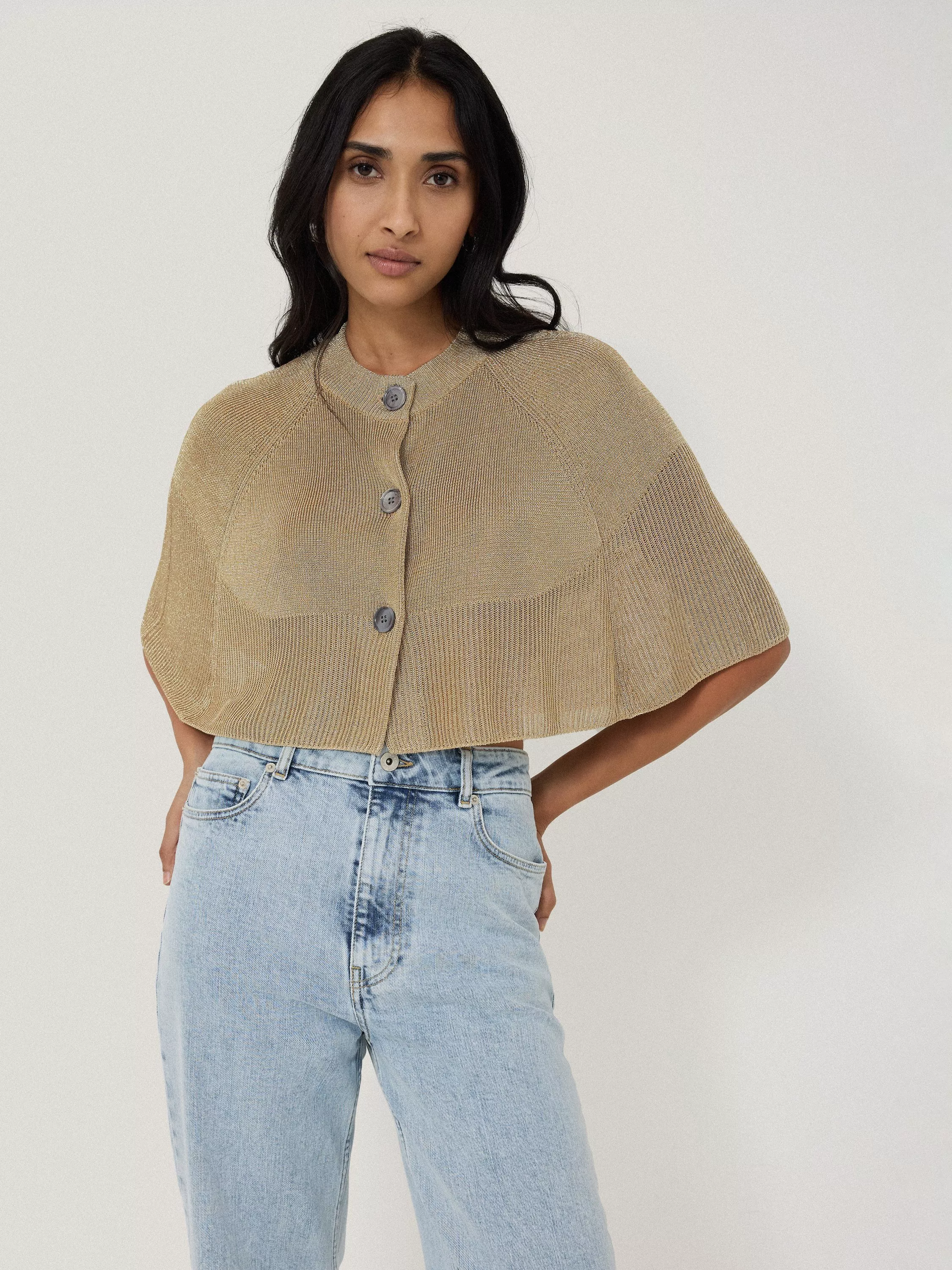 Patterned for a modern cropped cape silhouette, the weightless knit design is interspersed with gold lurex threads for beautiful shimmer along with pearlescent fastenings. Button over any dress when the temperature drops.