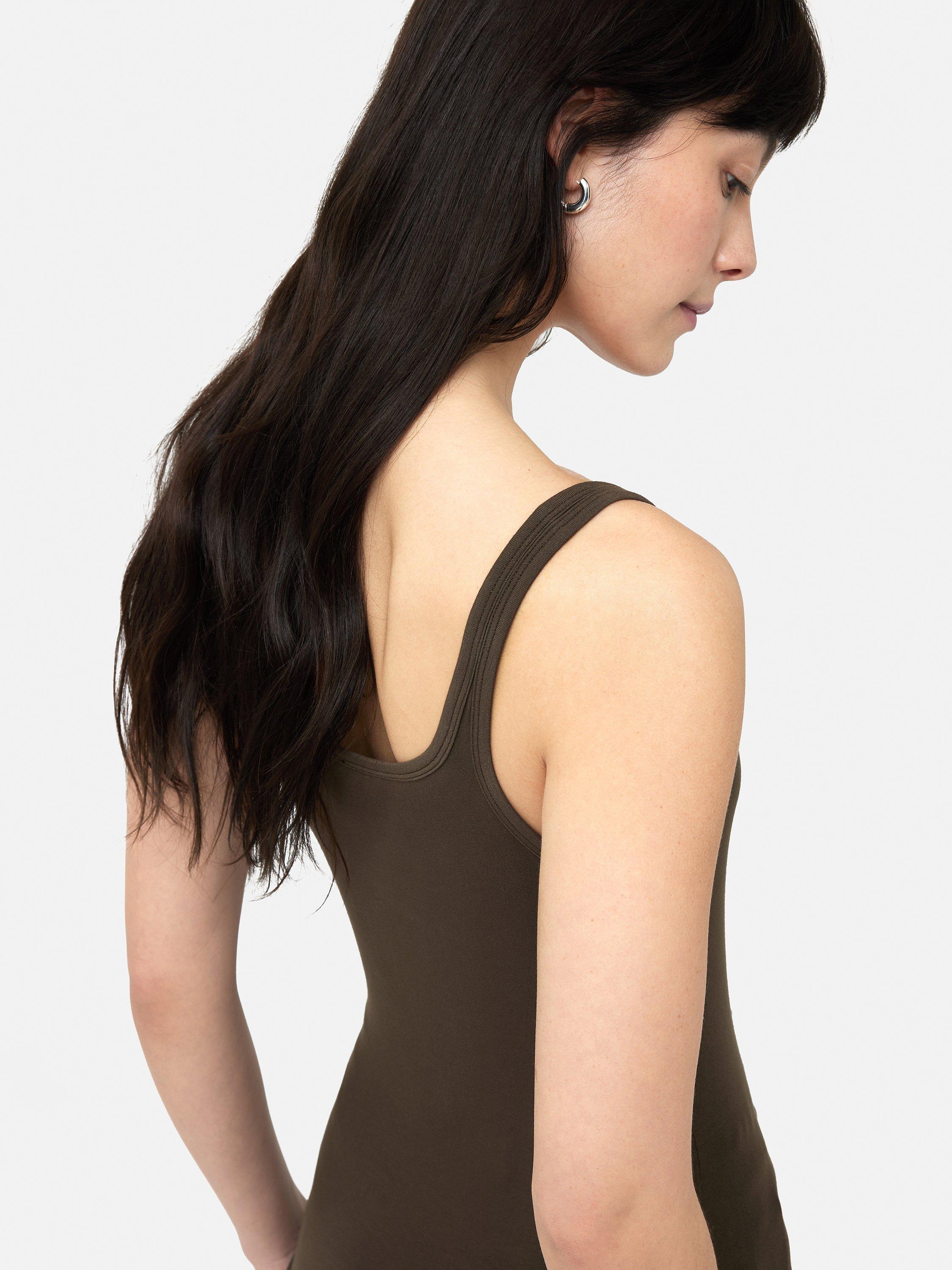 Shaped with a demure square neck and a sleeveless design, it is made with light yet robust blended fabric for longevity of wear and is an easy daytime option.