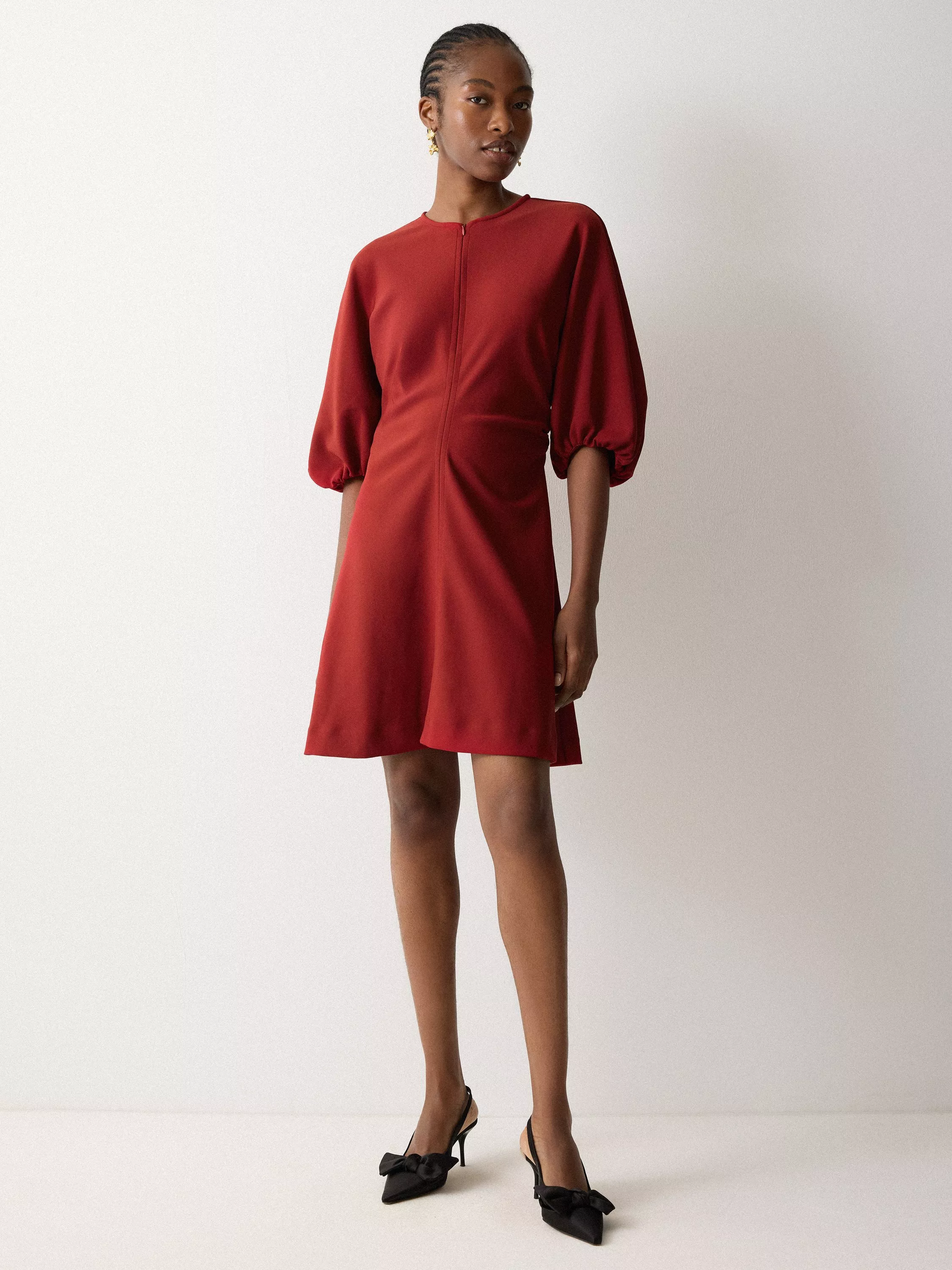 Find your seasonal hero dress with the Stretch Crepe Mini. Featuring cap sleeves and pleating details with a concealed zip at the back.