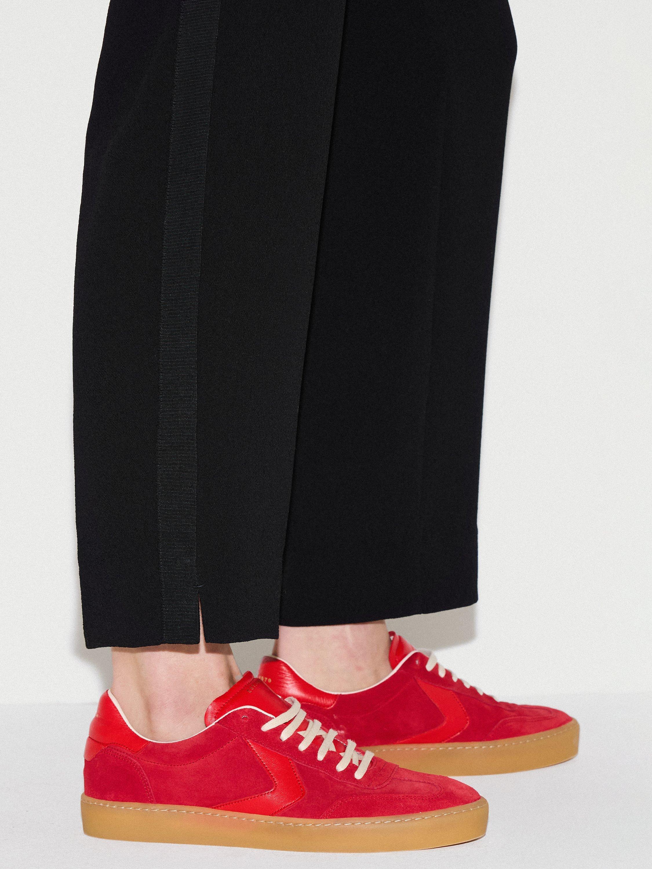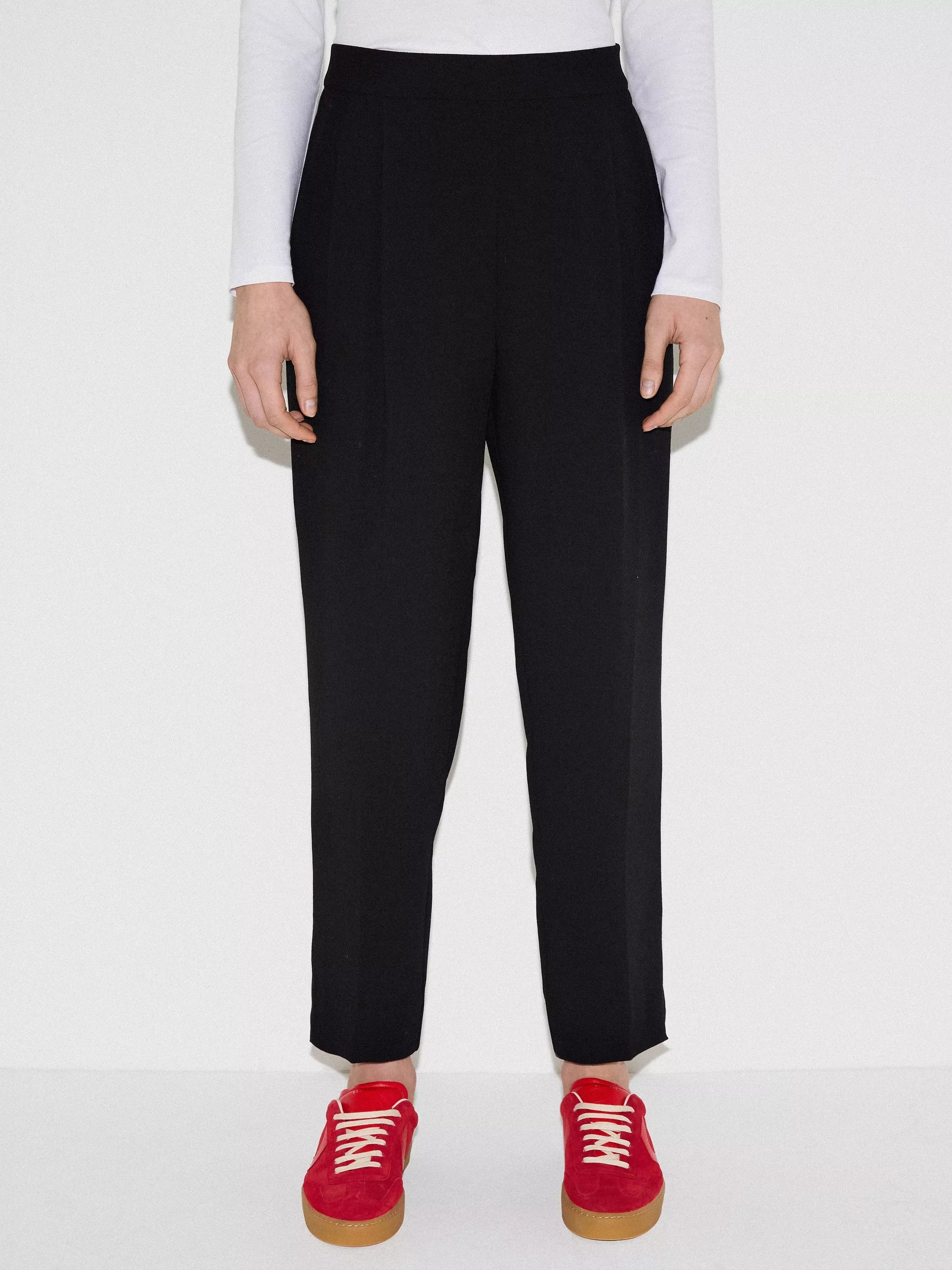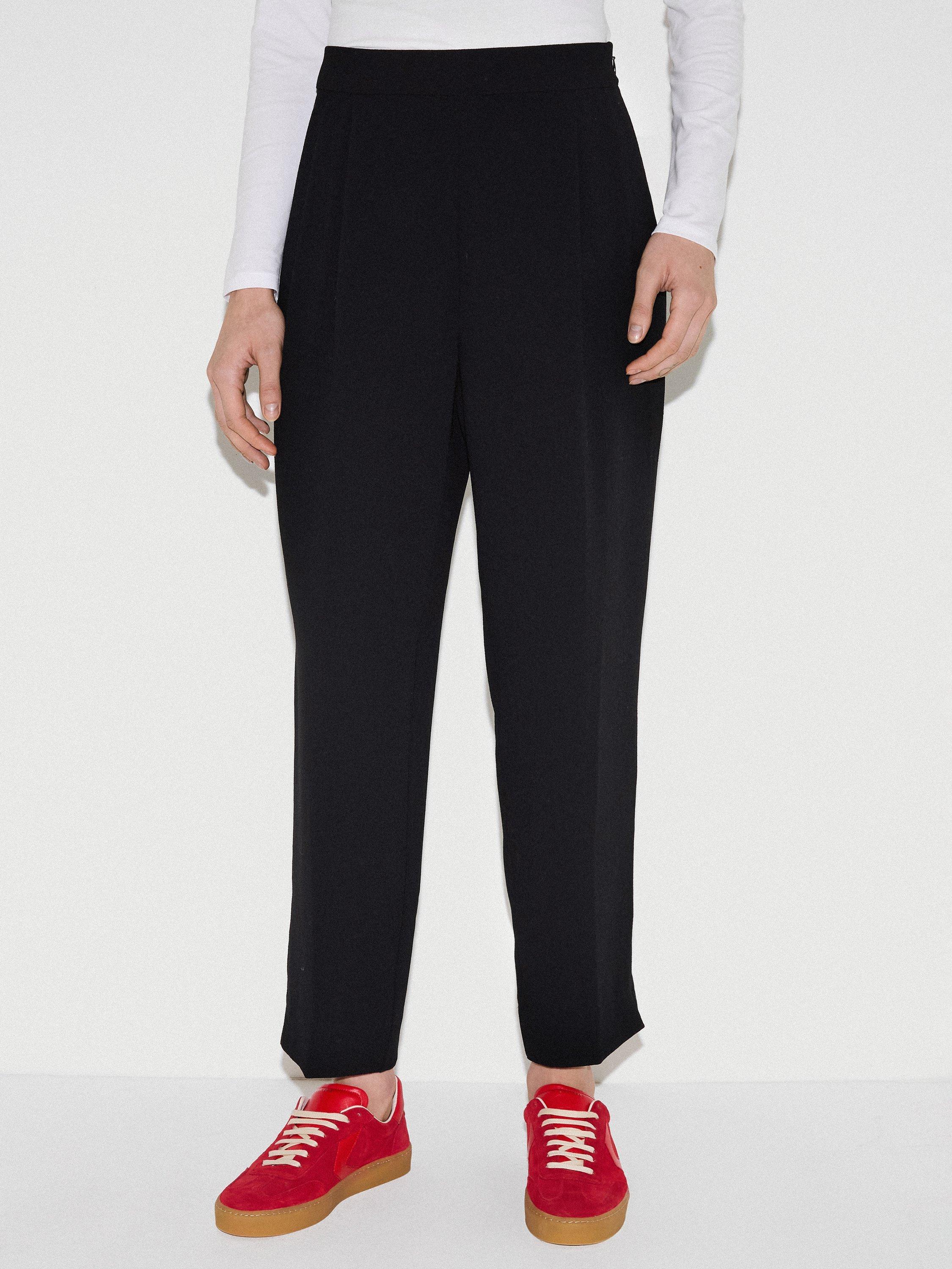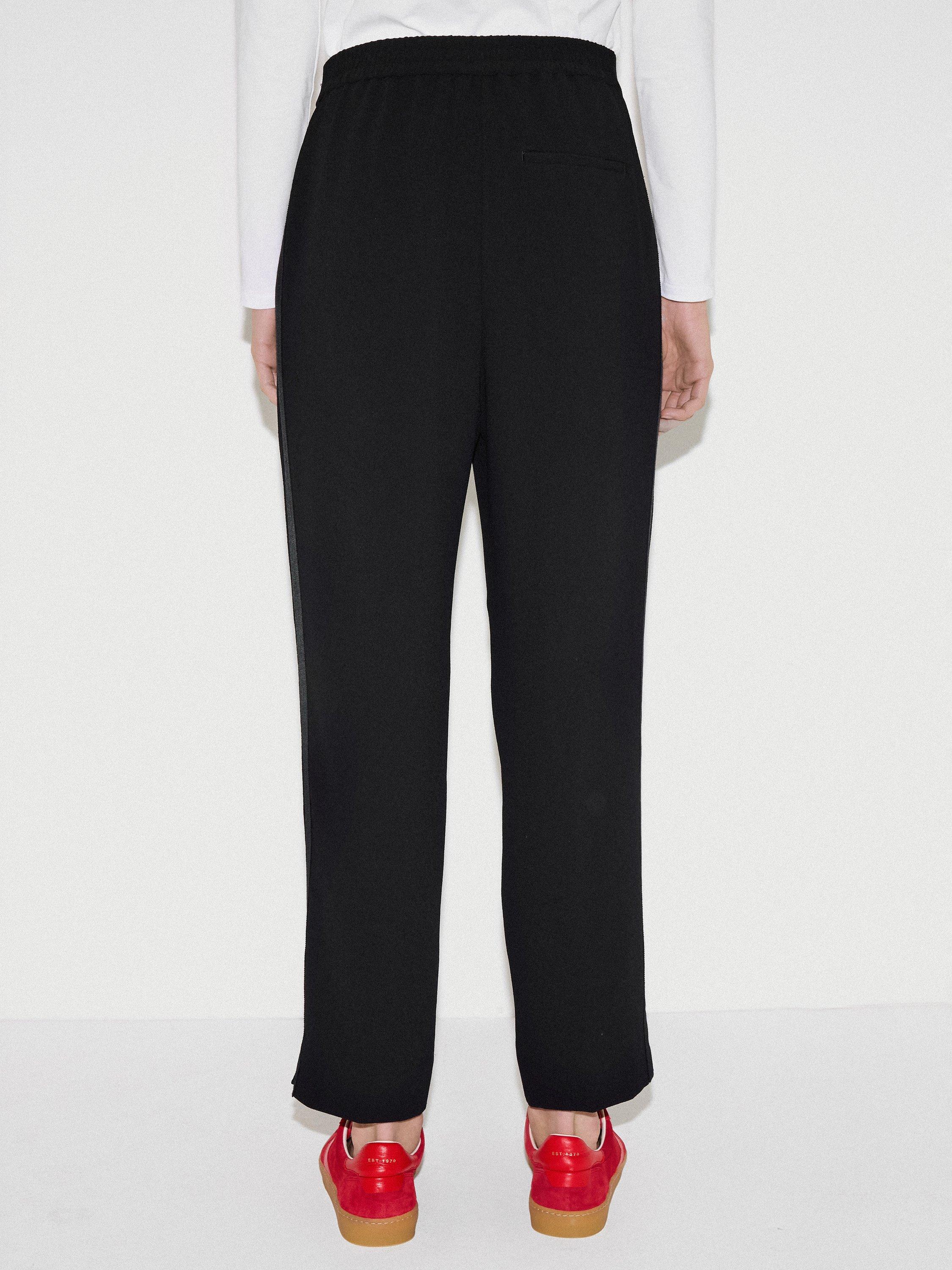 Stylish jogger trousers in an Italian soft crepe with textured fabric side leg detail. Designed with a contrast elastic waistband for a more relaxed fit. Features a pin tuck crease down the front and a split hem detail.