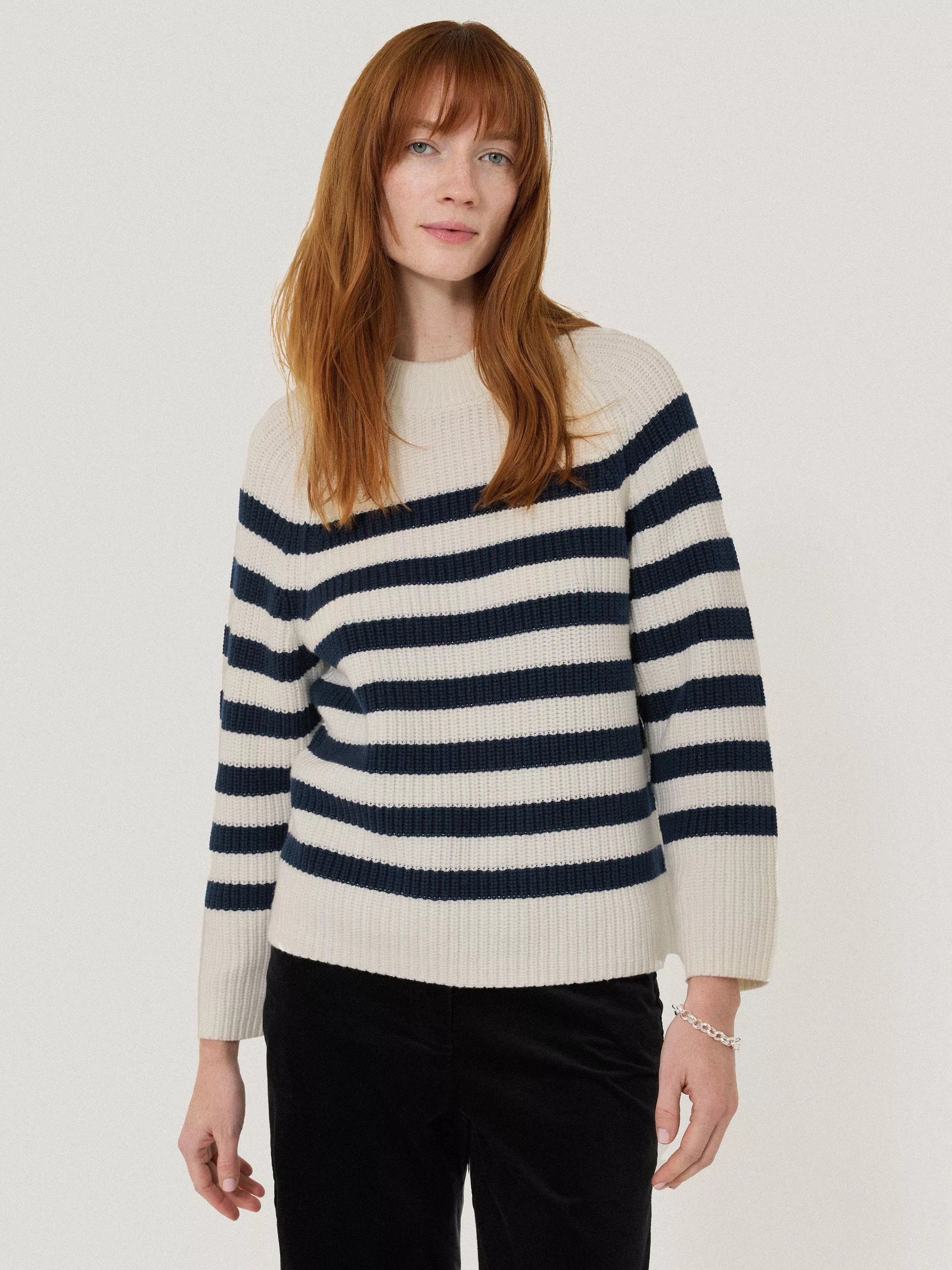Offering a classic shape with its crew neckline, this chunky stripe knit jumper from Jigsaw is a fine match for grey skies in a warming woollen blend.