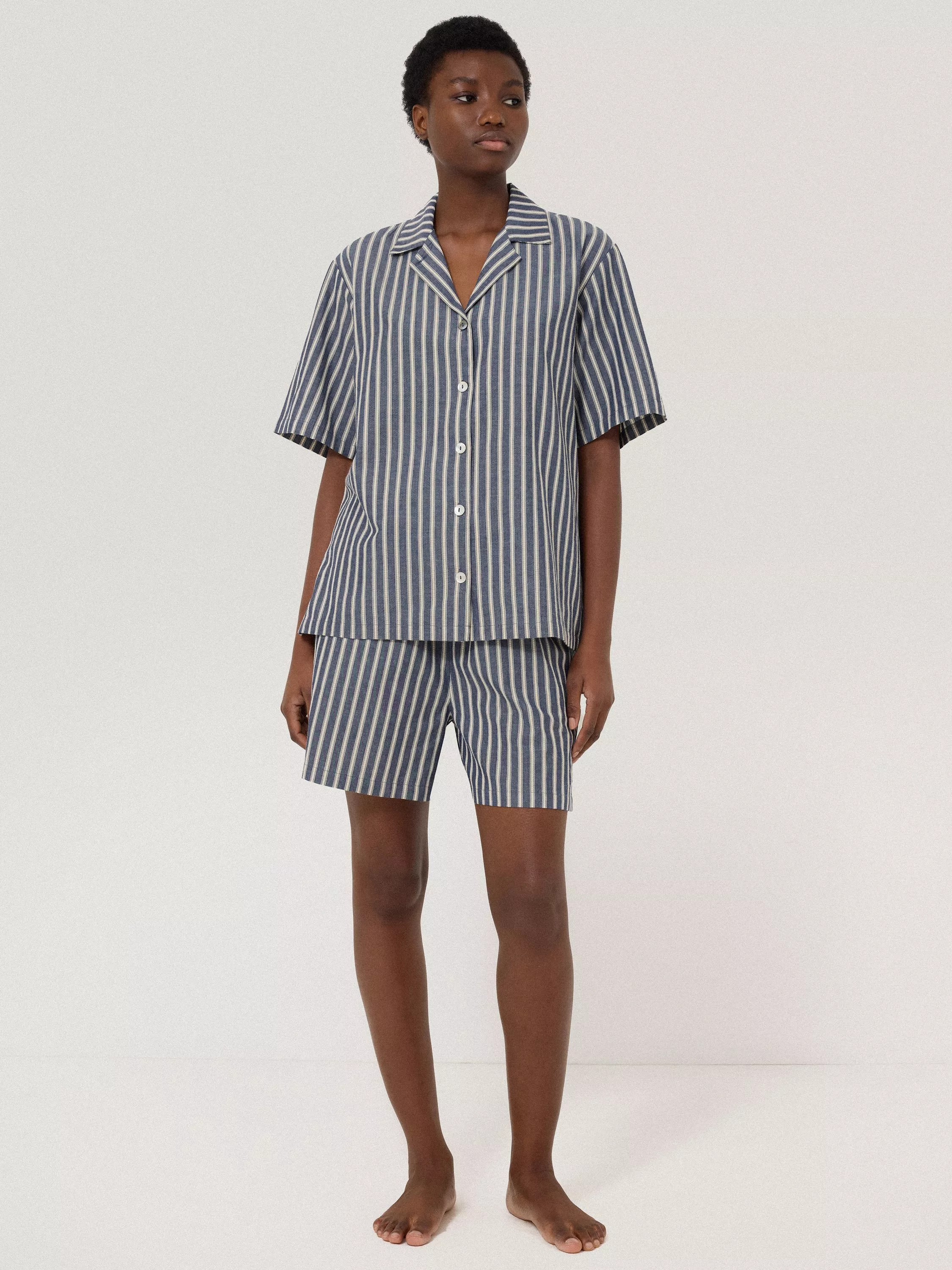 A classic pyjama style, this set features a timeless ticking stripe pattern throughout on a super-soft woven cotton. Featuring a collared short-sleeved shirt and shorts, this is the perfect pair for lazy mornings and weekend lounging.