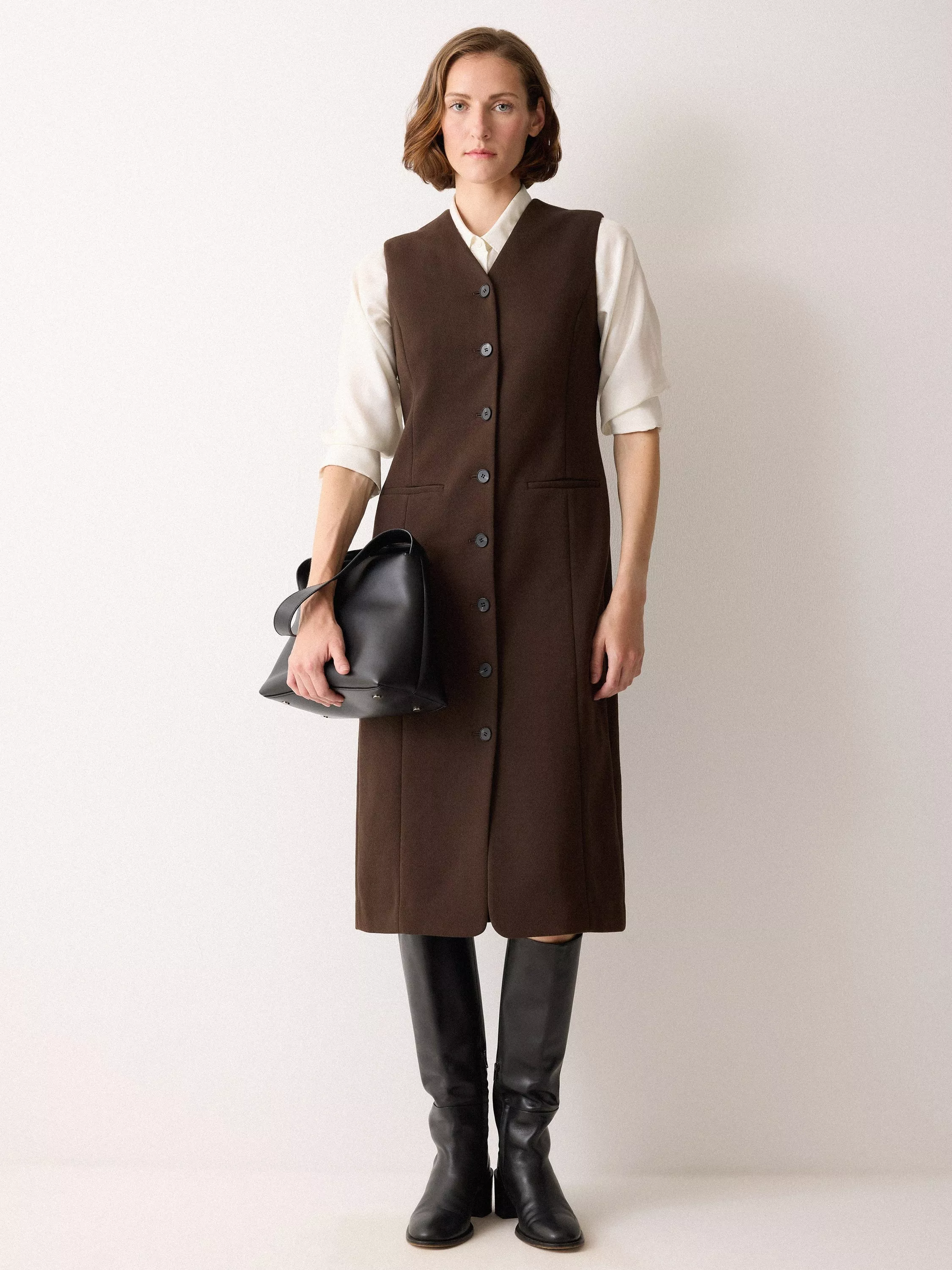 Balancing structure with a soft, figure-skimming silhouette, tailoring gets a feminine update this season. This long waistcoat dress, crafted from woven cotton, features a V-neck, centre-front button fastenings and front welt pockets, making it a timeless and chic addition to your smart casual wardrobe.