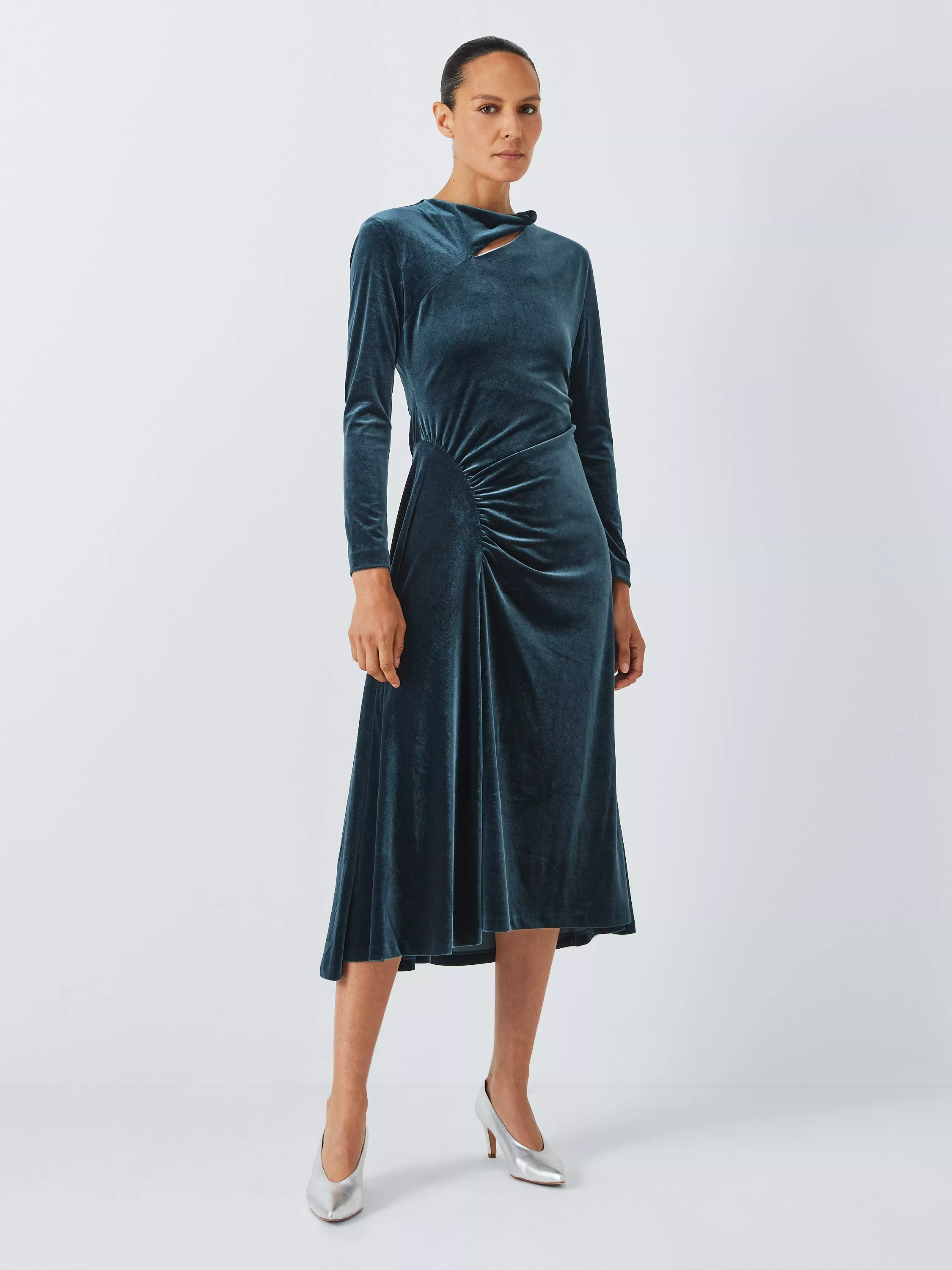Inspired by the rich, heritage fabrics seen around grand manor houses, this velvet dress is a must for any evening event. Playing to our love of slash neck details for an unexpected twist, this piece also features ruching around the waist for a flattering fit. This dress has an inner lining at the top body to give a smooth line. Take care when putting on the dress to make sure you put your arms inside the dress and inside the lining! A simple heel and statement earring will add just the right amount of sophistication.