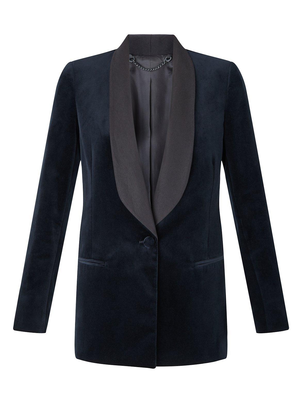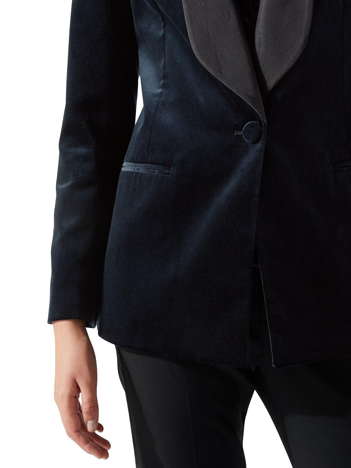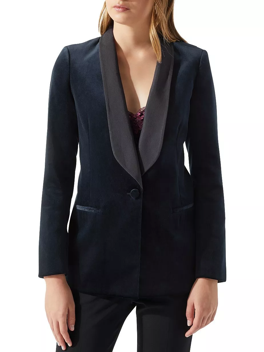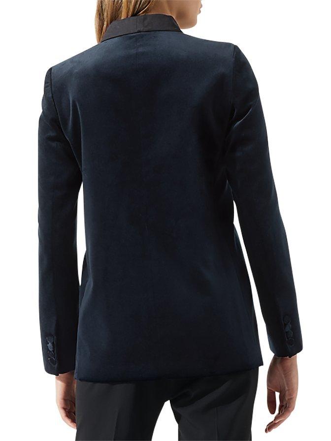 Boasting an on trend velvet finish with a sleek satin collar, buttoned cuffs and a slit at the back for a neat fit.