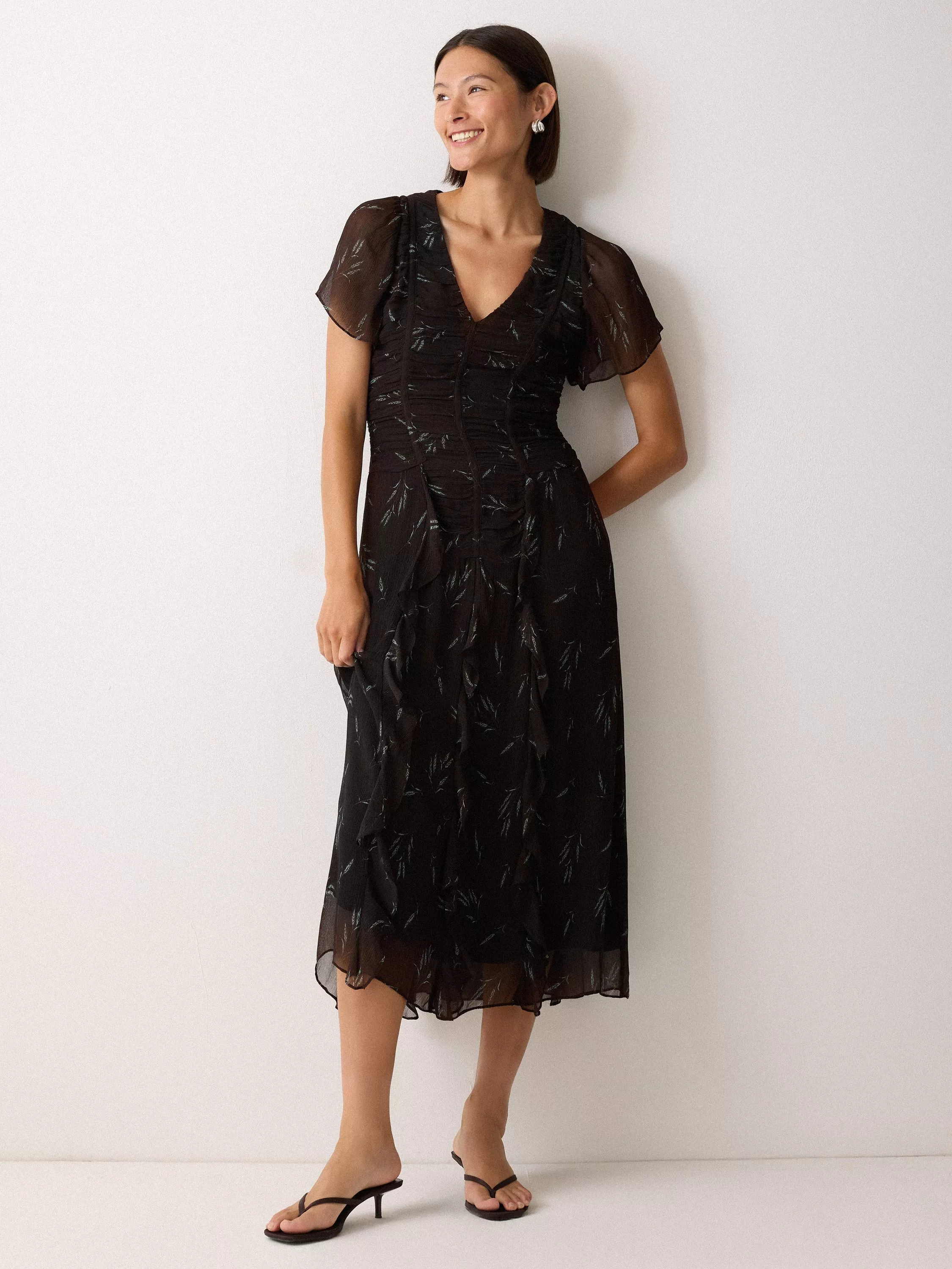 Cut on the bias from sheer, lightweight fabric, this V-neck dress is framed with floaty short sleeves and ruched panel contouring around the waist that flatters in all the right places. The bias cut allows the fabric to drape and move more fluidly, while the bespoke Wheat Flower print reflects the quiet elegance of autumnal landscapes.