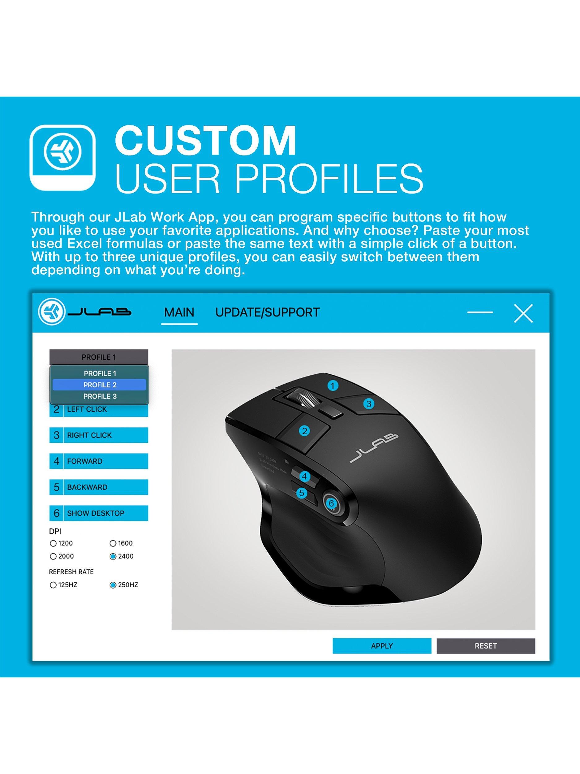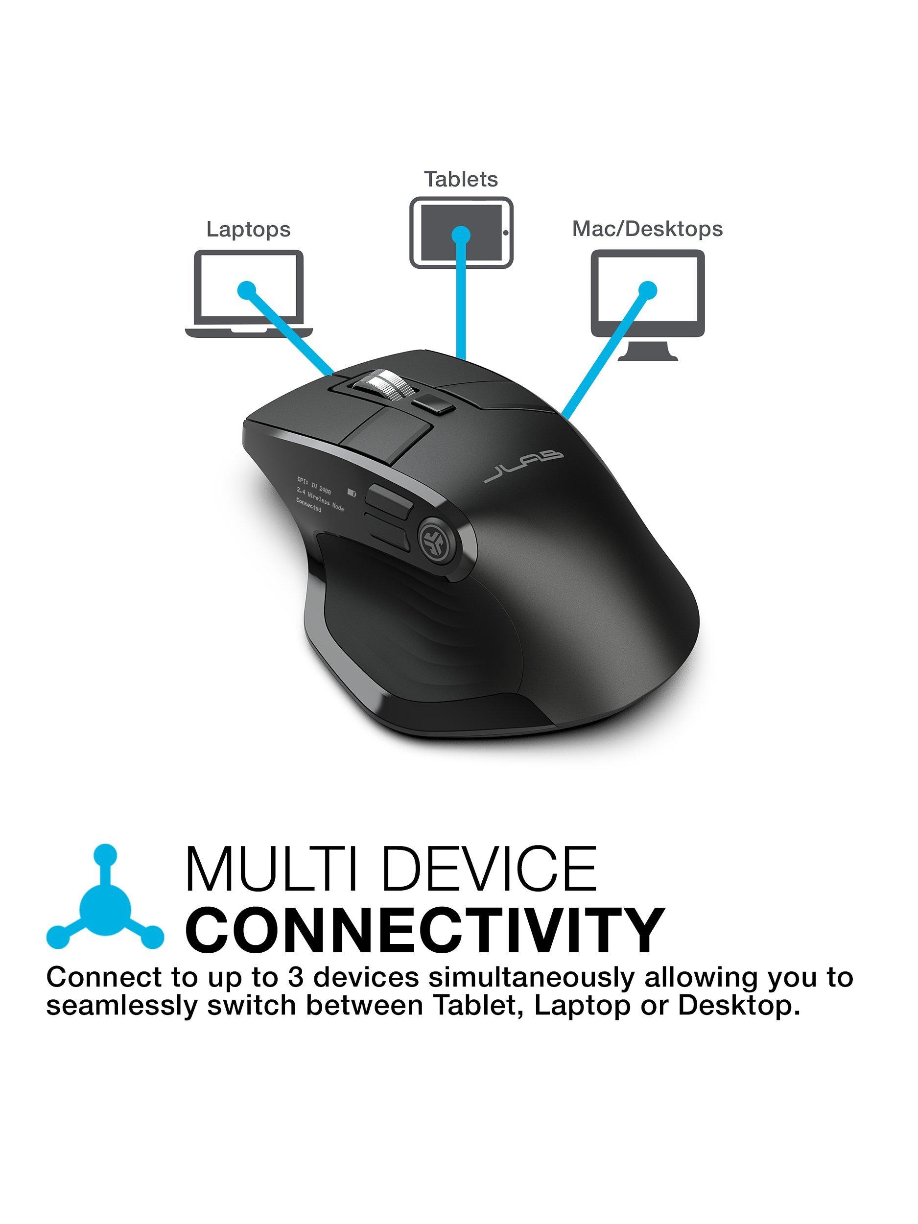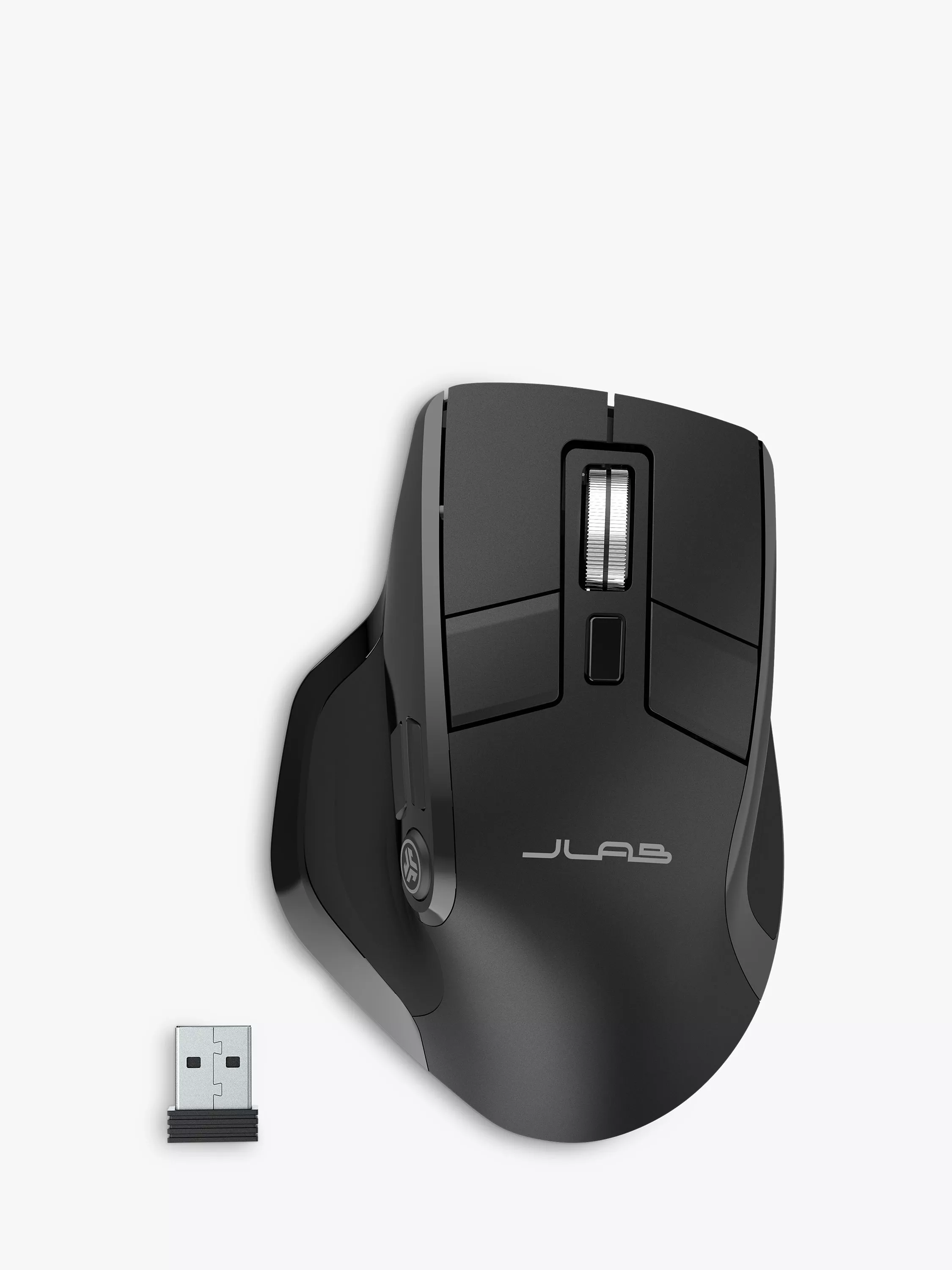 This multi-device ergonomic full-size mouse puts ultimate productivity and pro performance into your hand. Connect via Bluetooth or USB wireless dongle, and easily switch between up to three saved devices. Nine buttons with silent clicks, which are customisable in the JLab Work app, and an in-built OLED display keep you you clicking and creating with top tech at your fingertips.