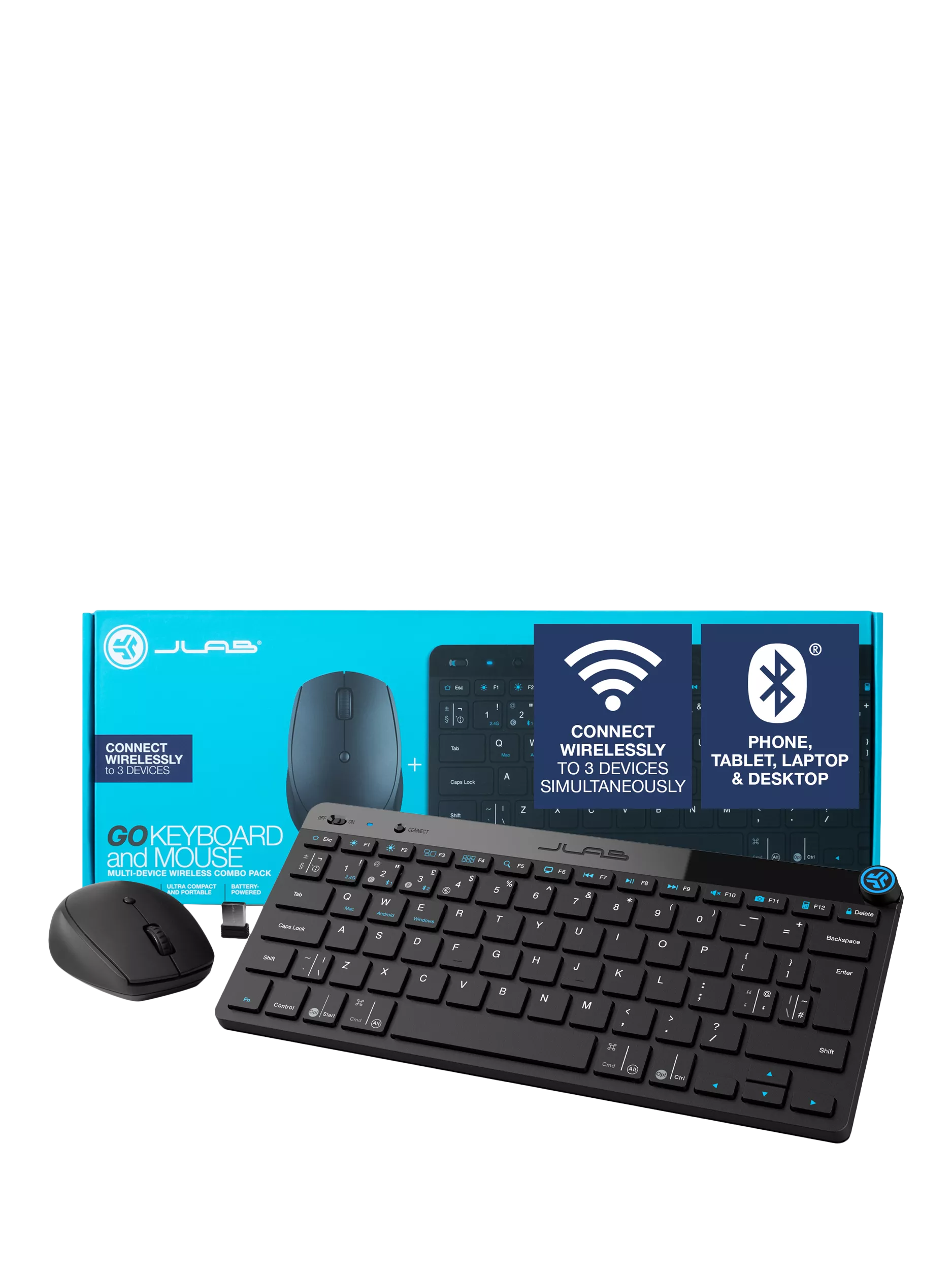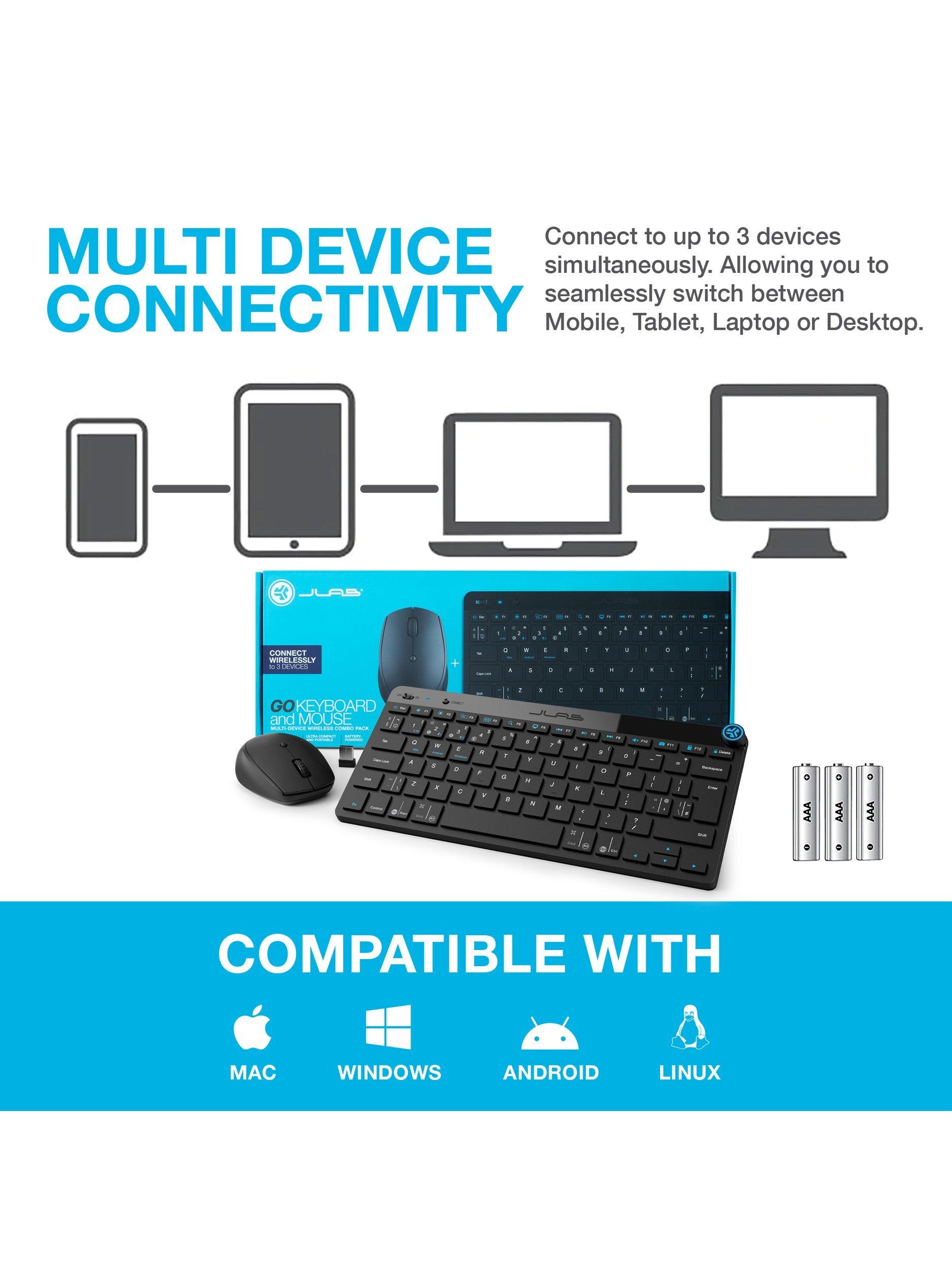 The Go Mouse and Keyboard set is compatible with three device connection options. You can pair with nearly any type of device using Bluetooth 5 or USB.
