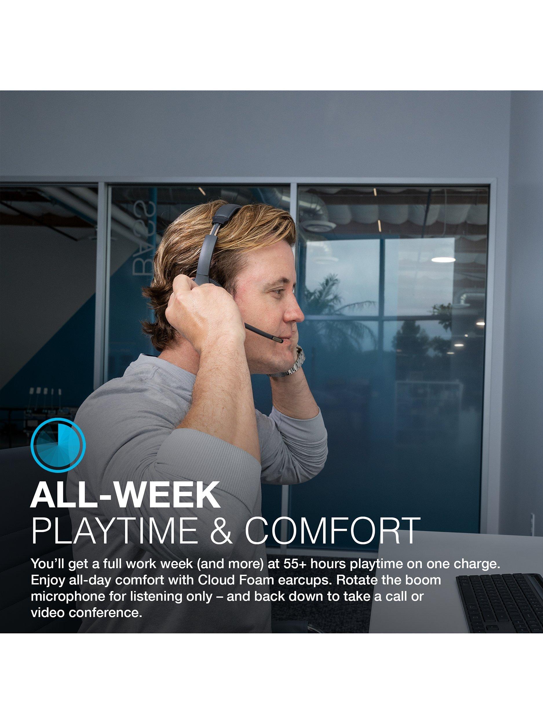Get 45+ hours of playtime on one charge - and all-day comfort with Cloud Foam earcups. Rotate the boom microphone for listening only …and down to take a teams call or video conference meeting.