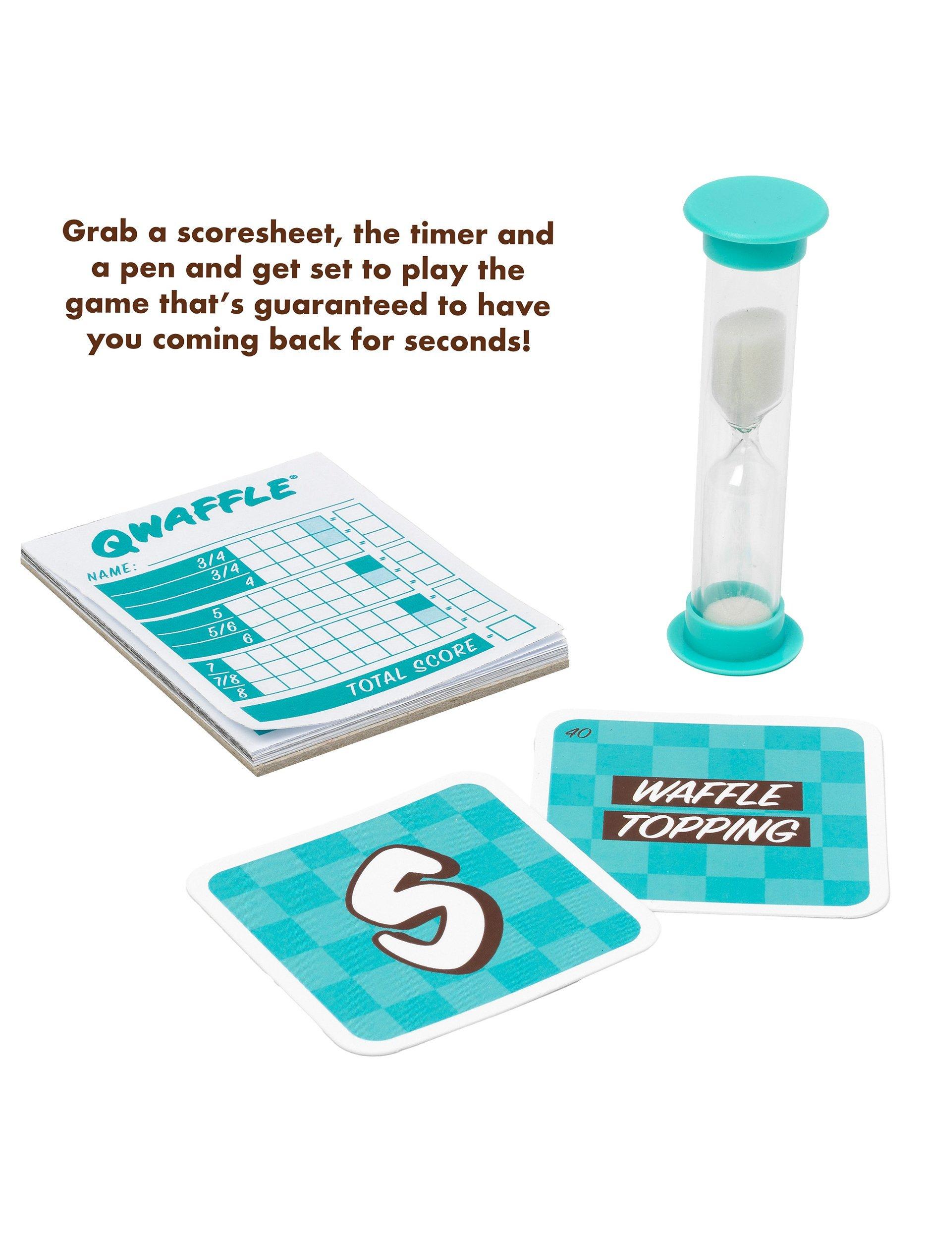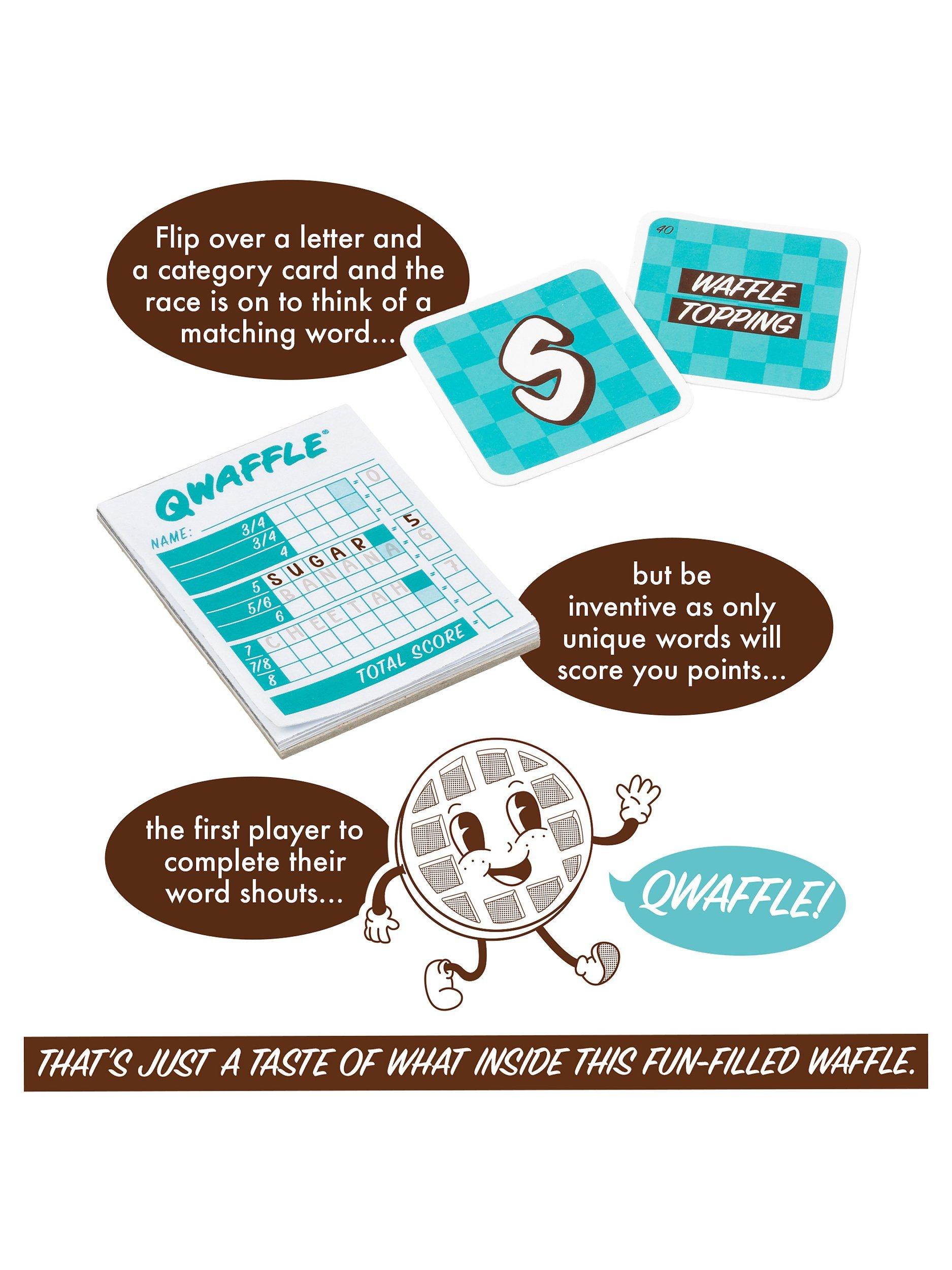 Grab a scoresheet, the timer and a pen and get set to play the game that's guaranteed to have you coming back for seconds! Flip over a letter and a category card and the race is on to think of a matching word which fits one of the blank spaces on your scoresheet... but be inventive as only unique words will score. Don't take too long as once the first player completes their word, they shout QWAFFLE, and the remaining players have until the timer runs out to finish too. Be as creative as you like but be prepared to QWAFFLE your way out of any challenges you receive. Who will have the highest score when all the scorecards are complete?