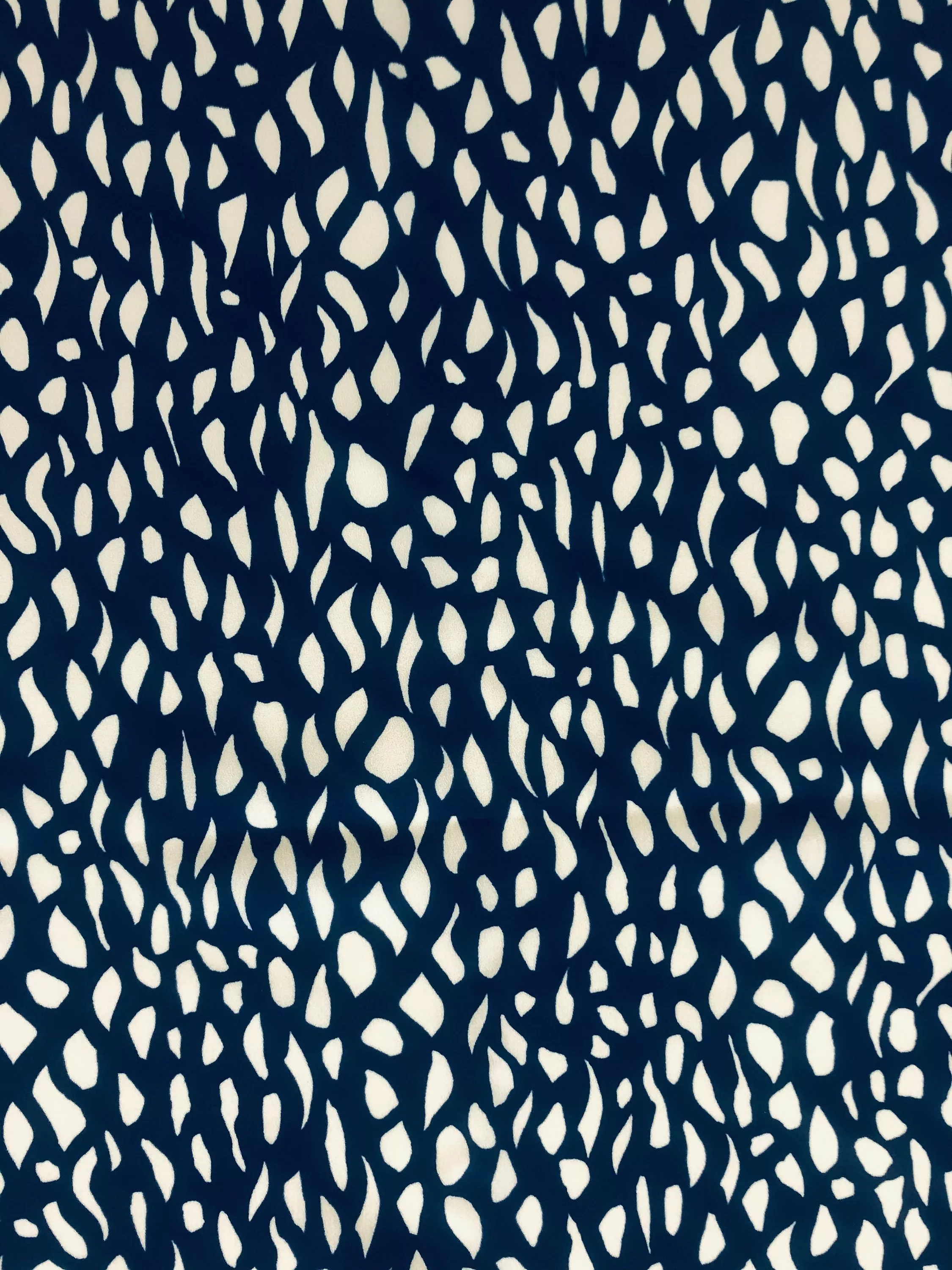 A white and blue dash design printed on a polyester crepe de chine easy care fabric.