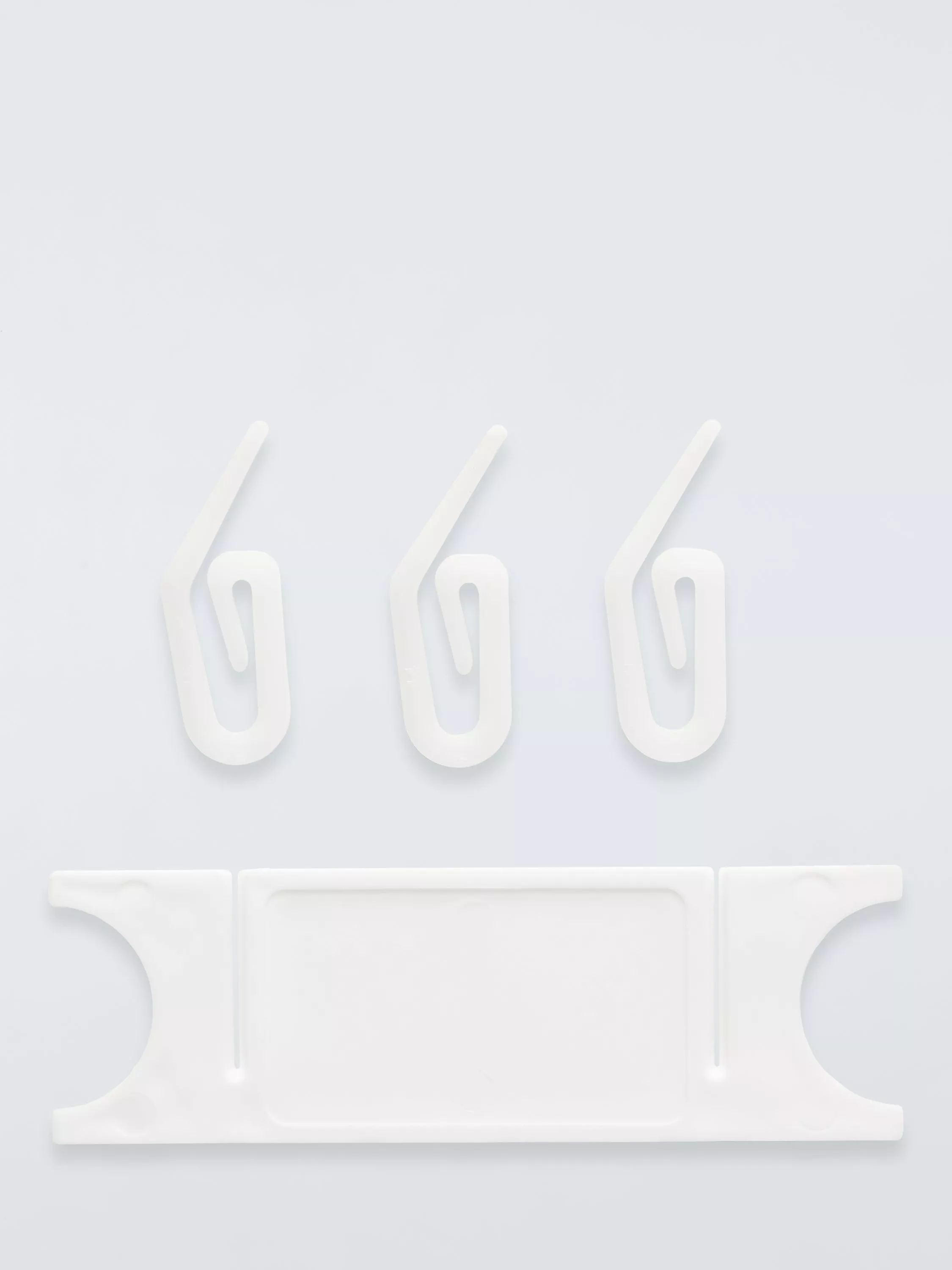 A pack of 50 standard curtain hooks and 2 plastic cord tidies.