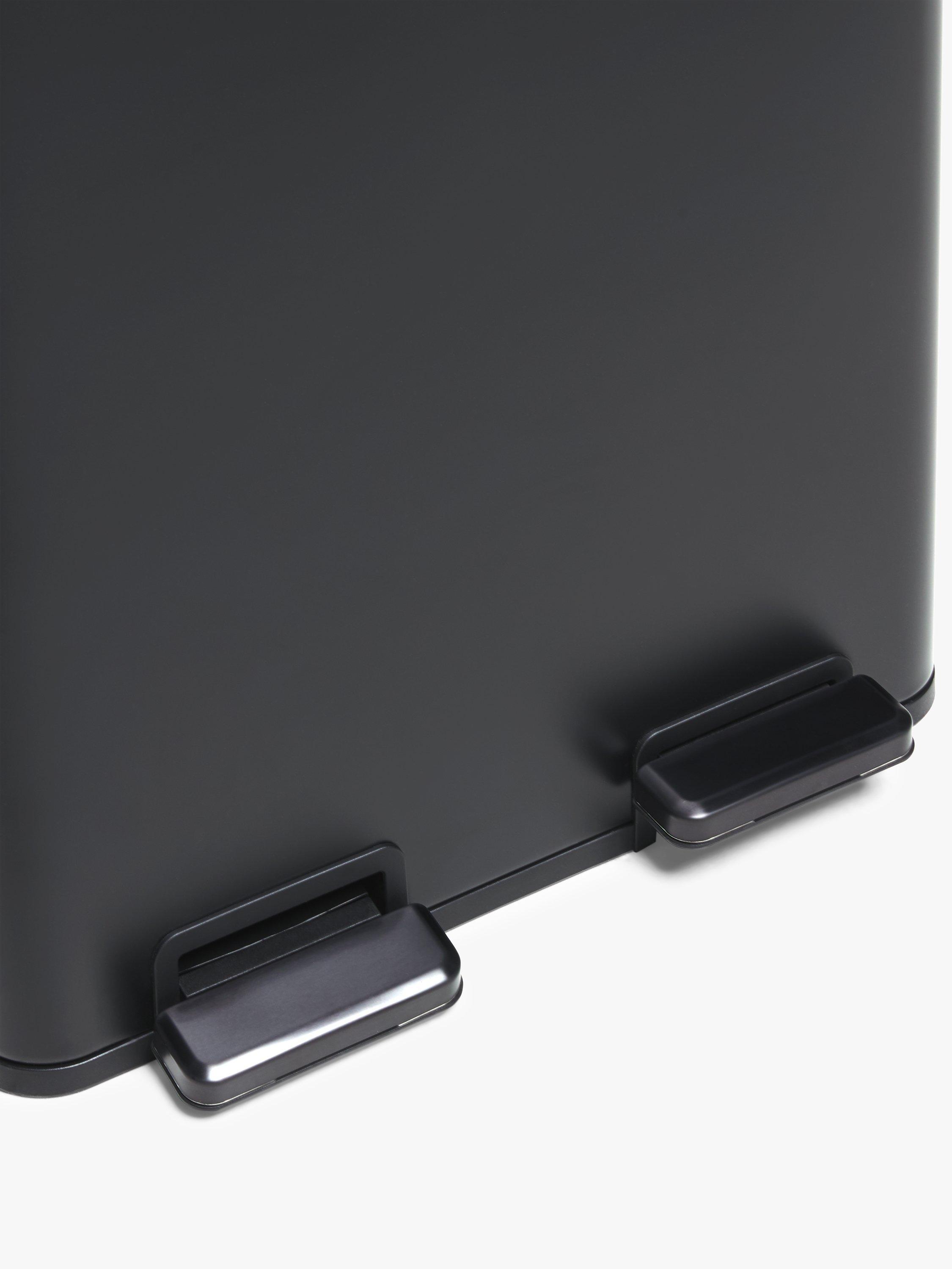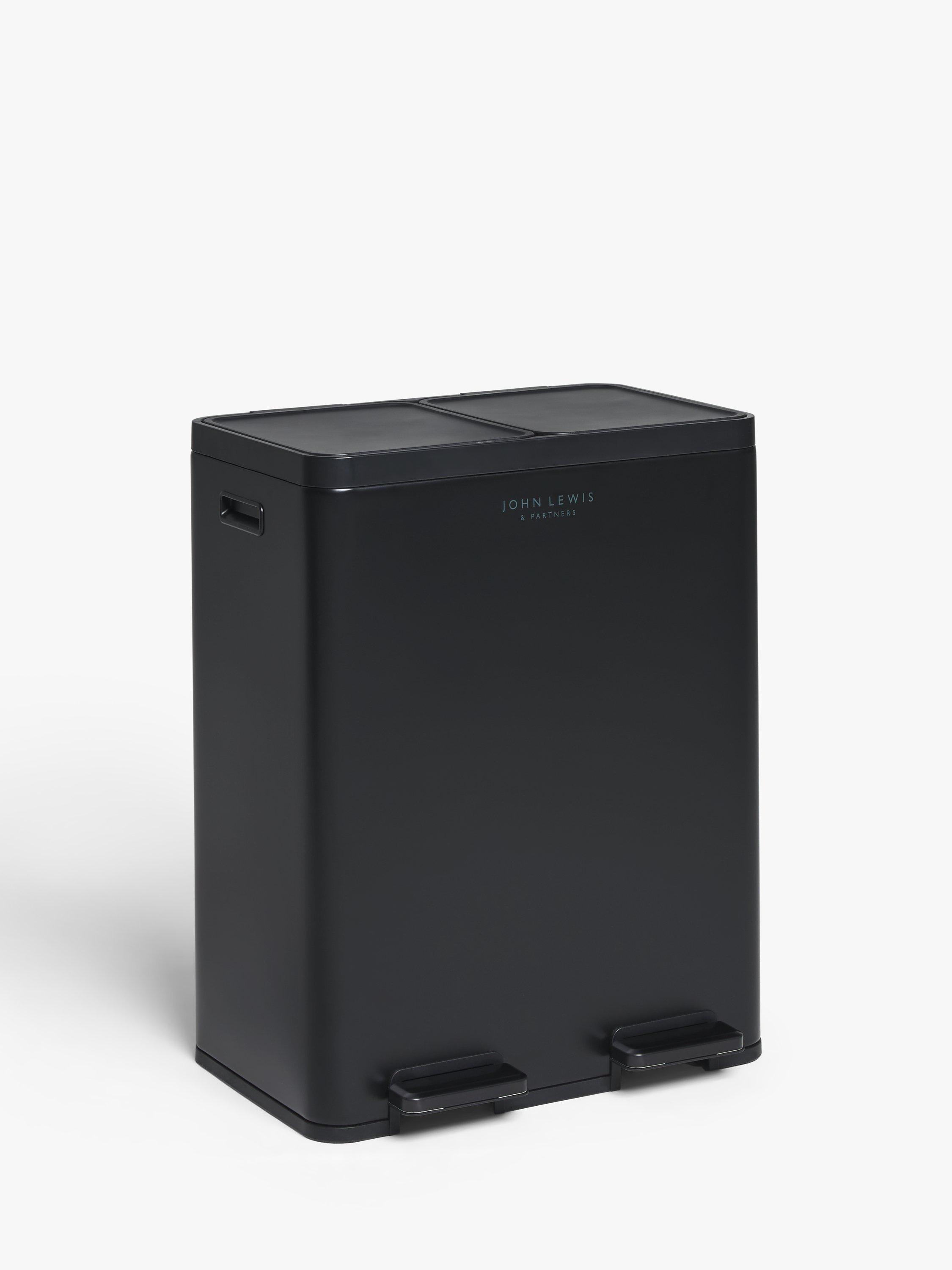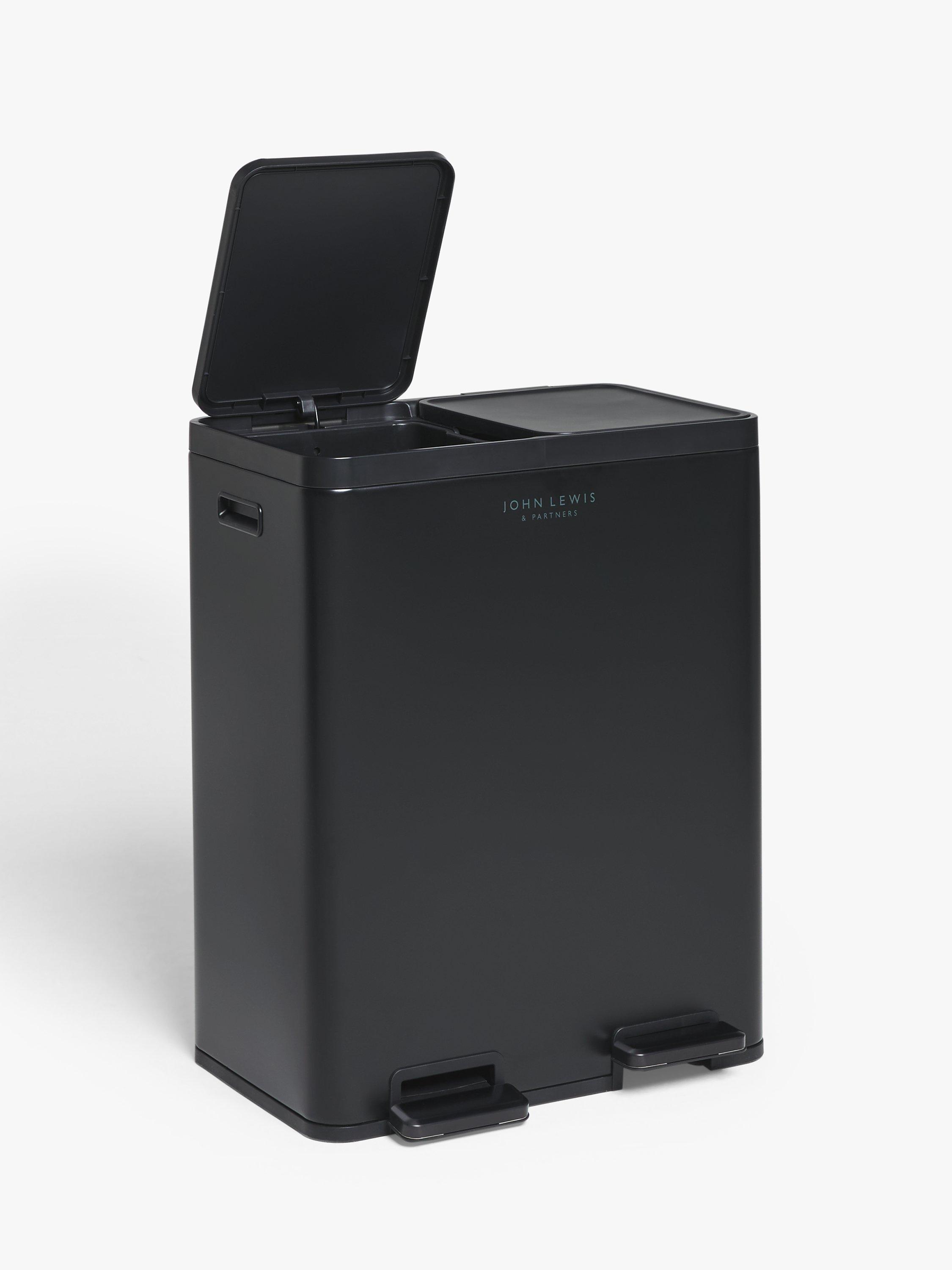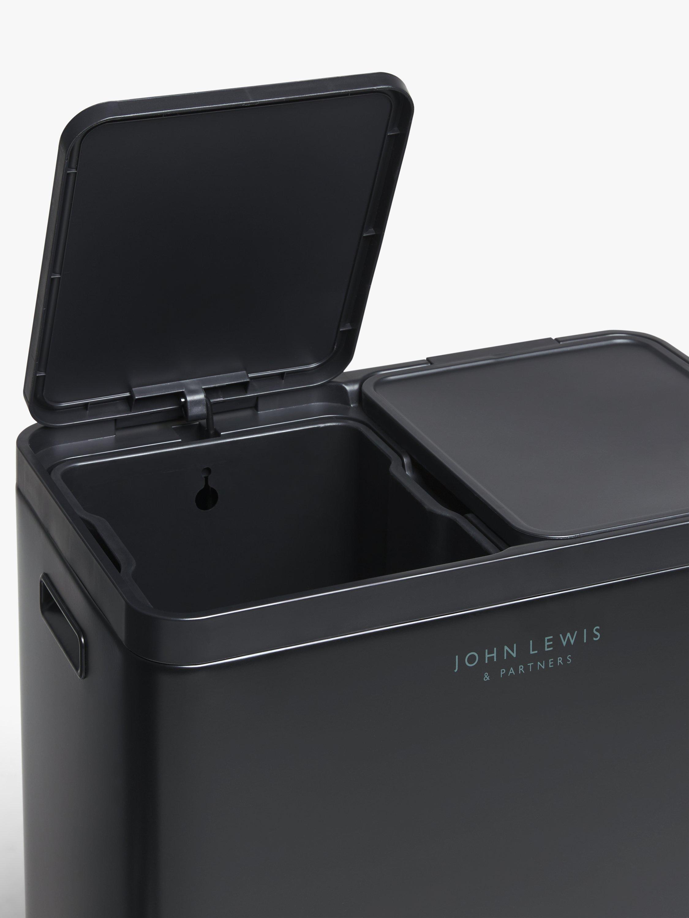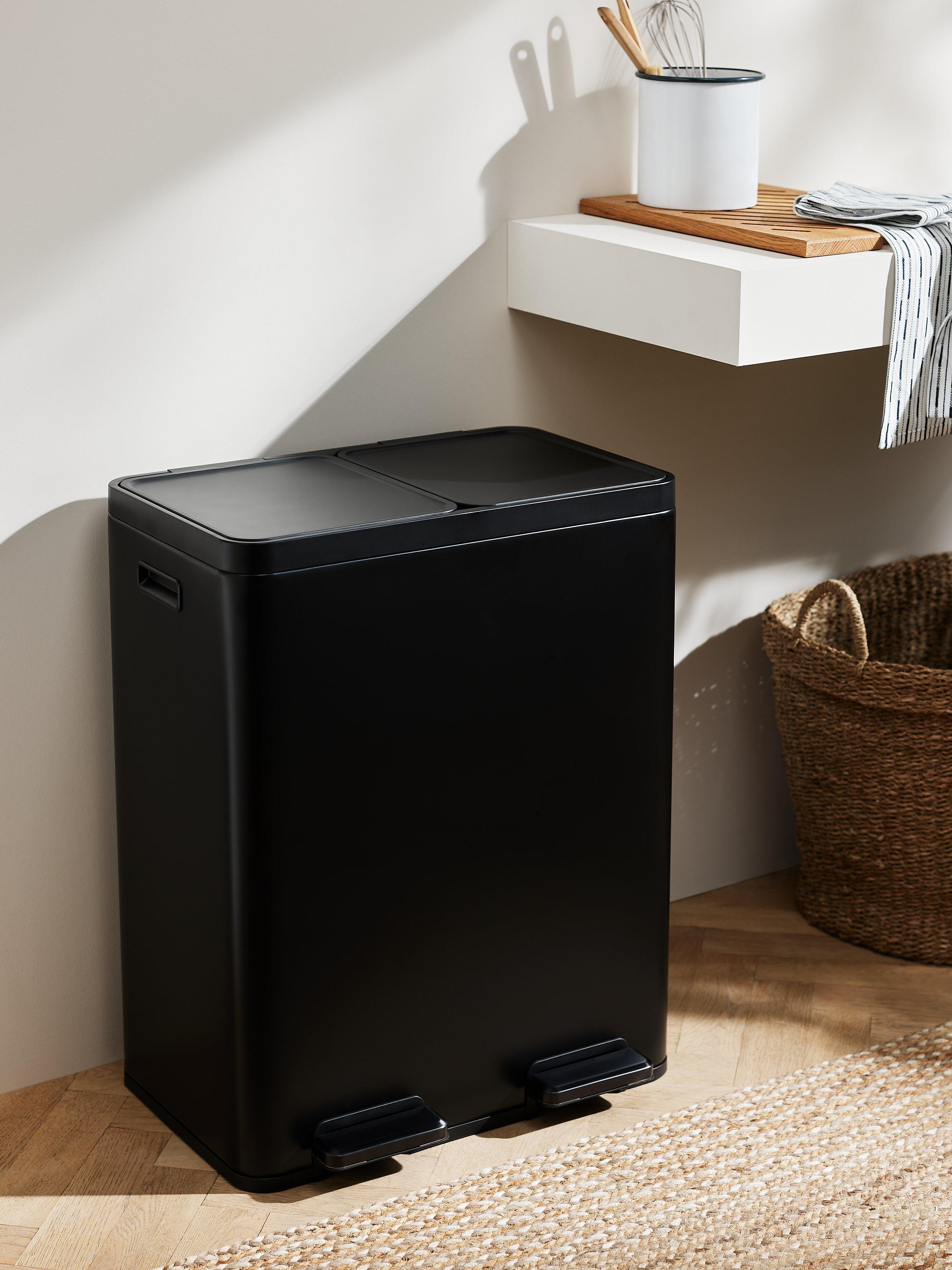 This space-efficient 2-section recycling bin fits perfectly against a wall.