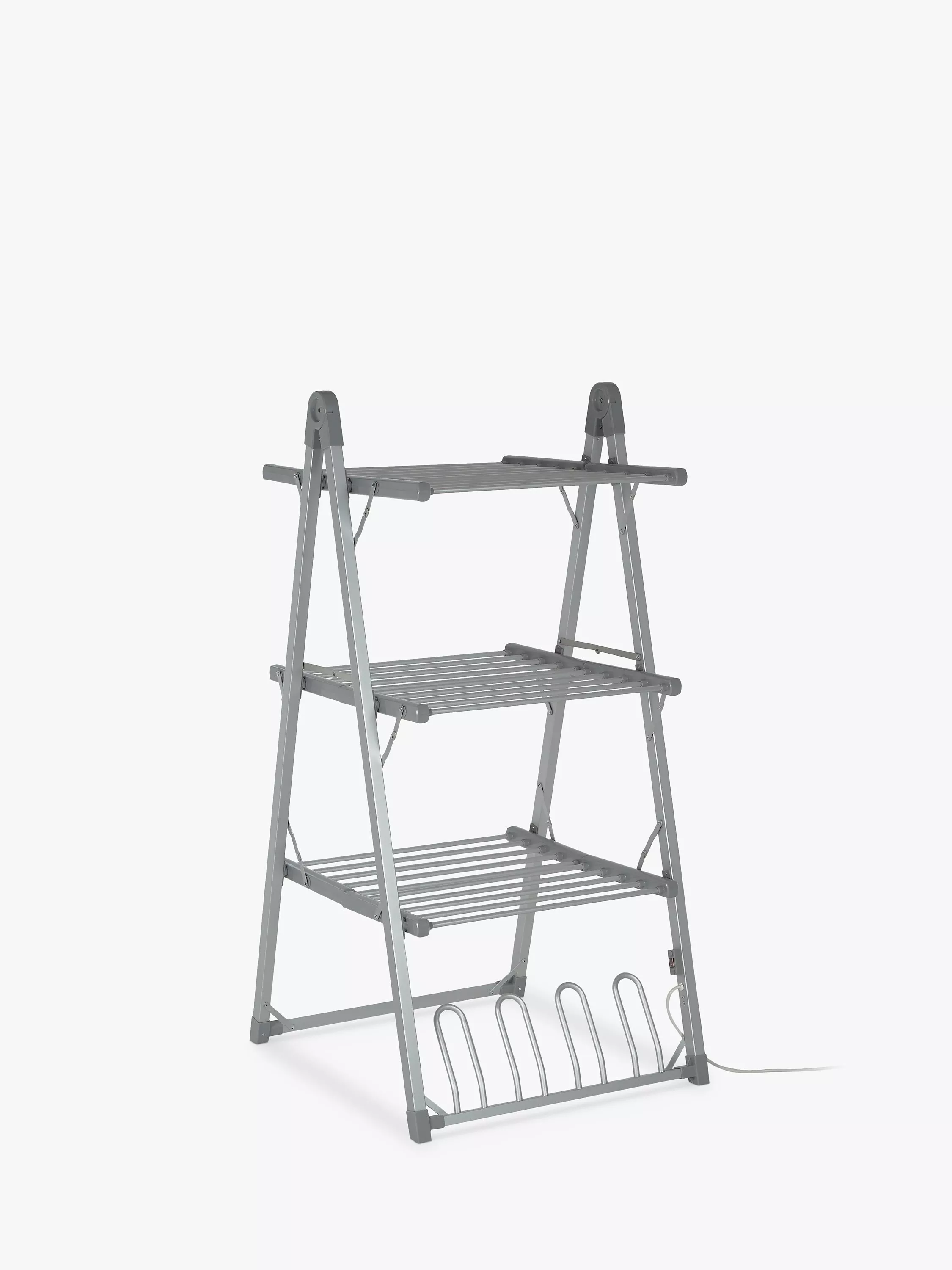 Costing only pennies per hour, drying on our heated airer is kinder to clothes than tumble drying and better than muffling the heat from your radiators by laying clothes over them. Extremely versatile, just position the folding shelves to suit your needs: fold out to hang T-shirts, socks and smalls, lay delicate items flat to avoid stretching, or open only the top tier to hang sheets and big towels without them touching the floor.