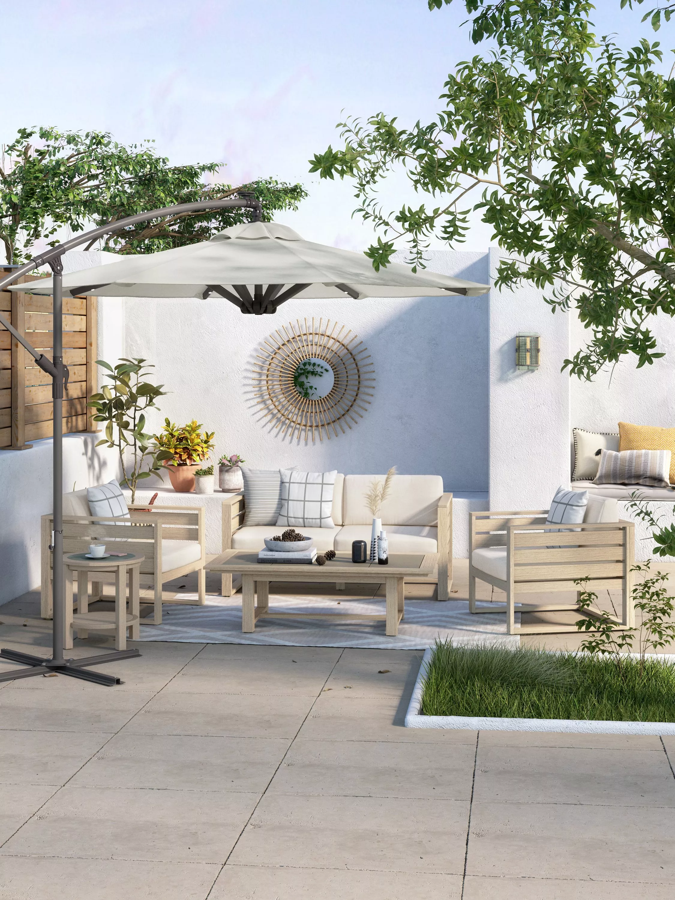Control protection from the sun with this easily adjusted freestanding parasol. Ideal for a four to six-seater dining table set, it provides plenty of shade to keep you and your guests cool while dining in your garden or on your patio. Solar-powered LEDs on the canopy frame will give you light when the sun dips.