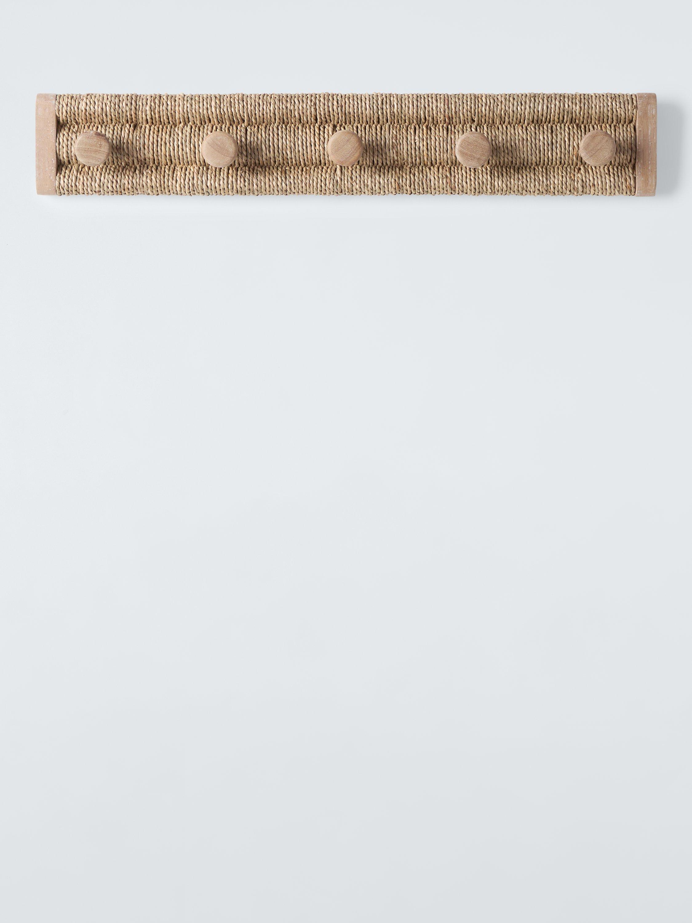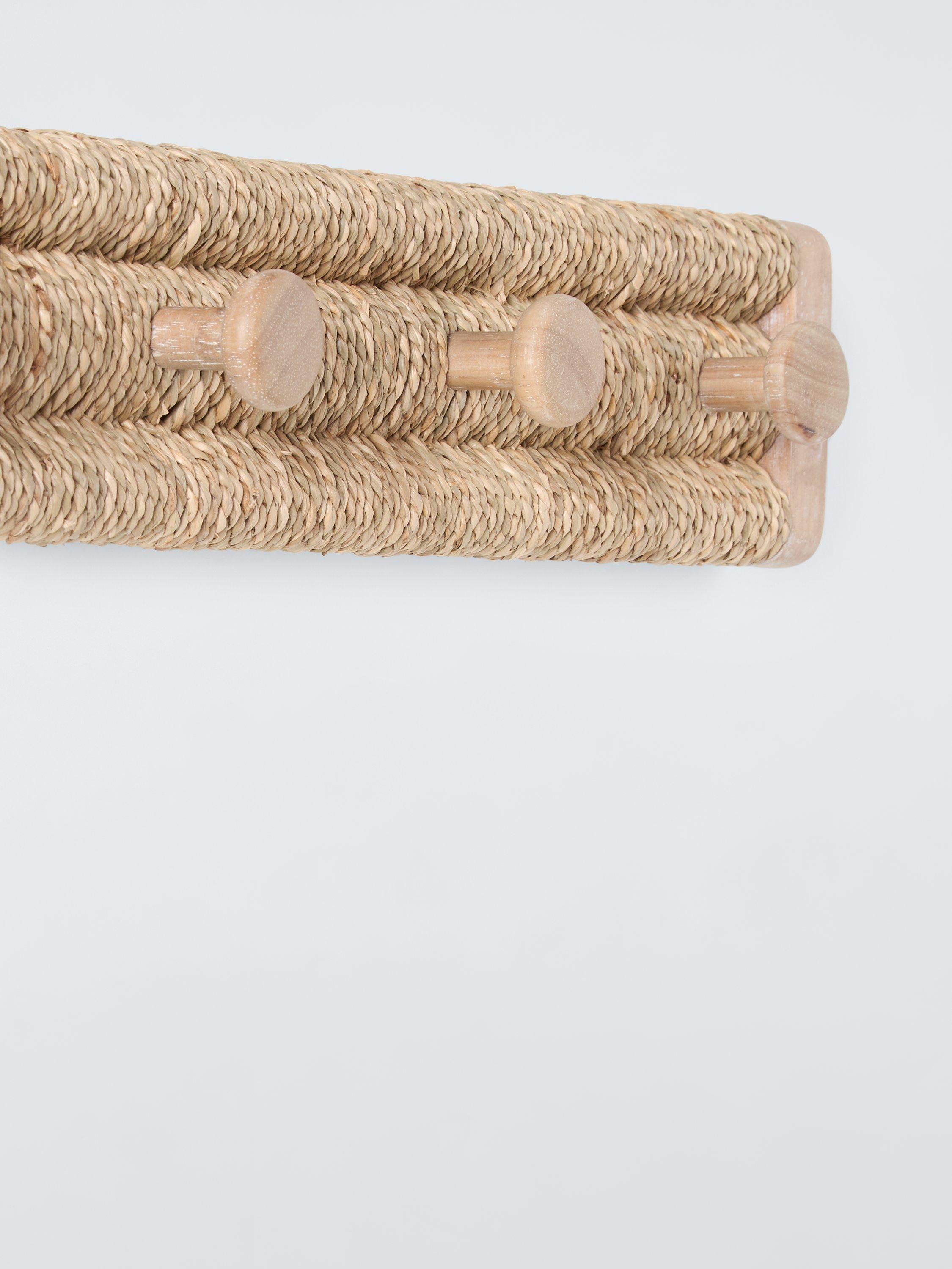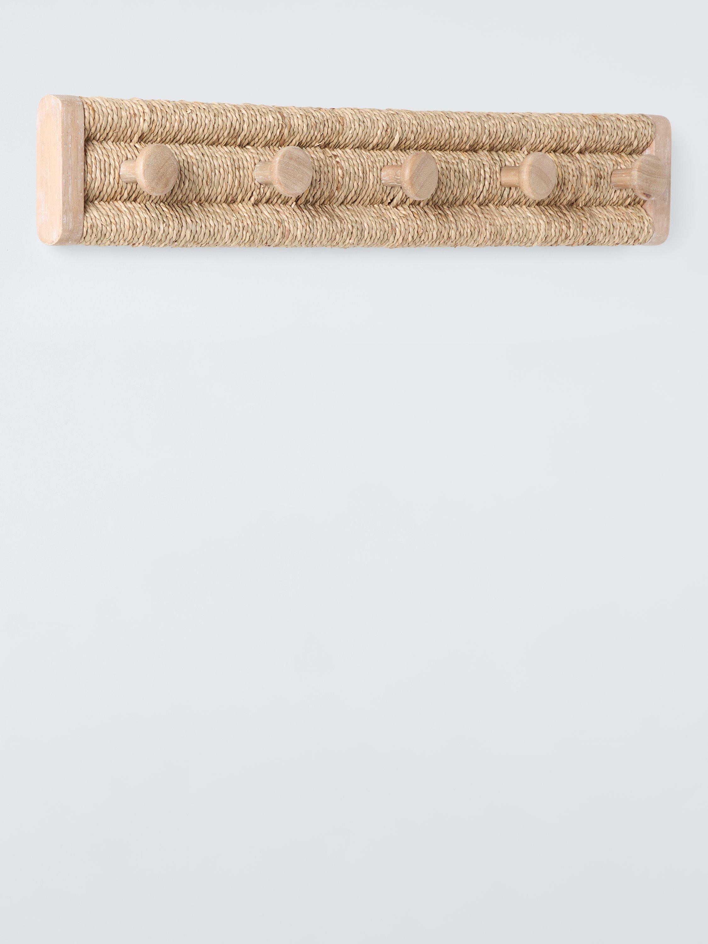 Pale wood, combined with a seagrass woven wrap, make for an attractive 5 hook rack that will look beautiful in your porch or hallway.