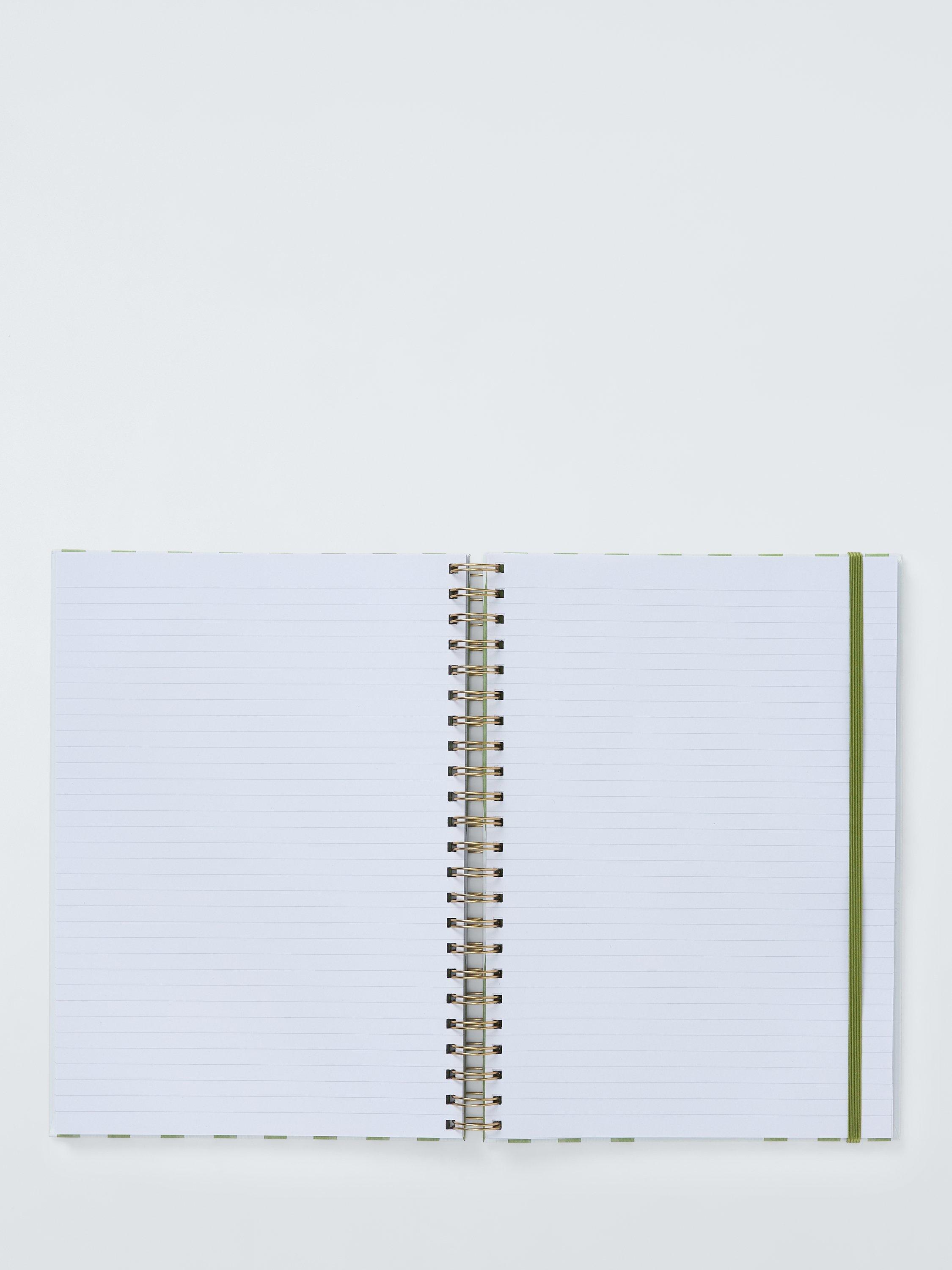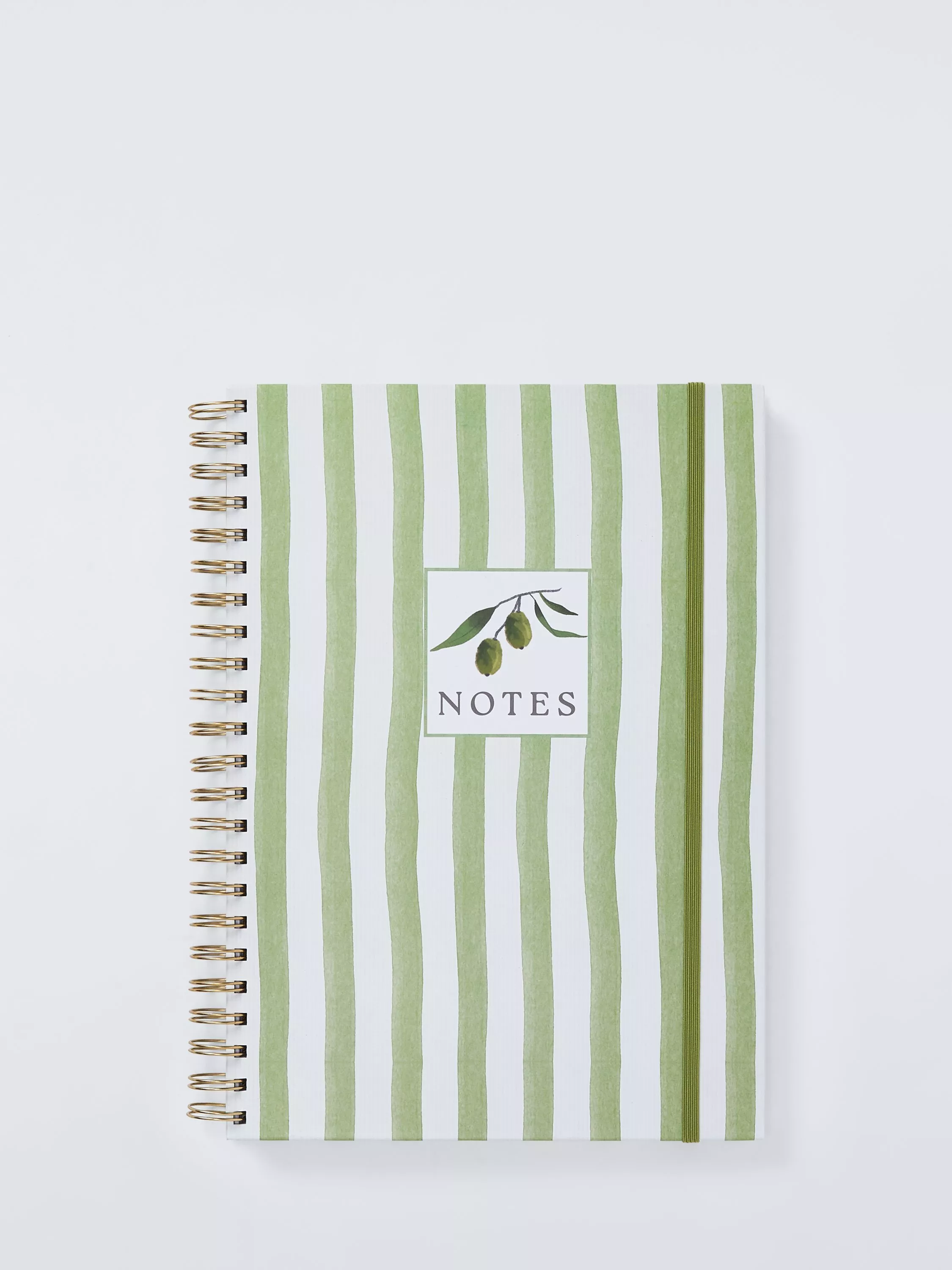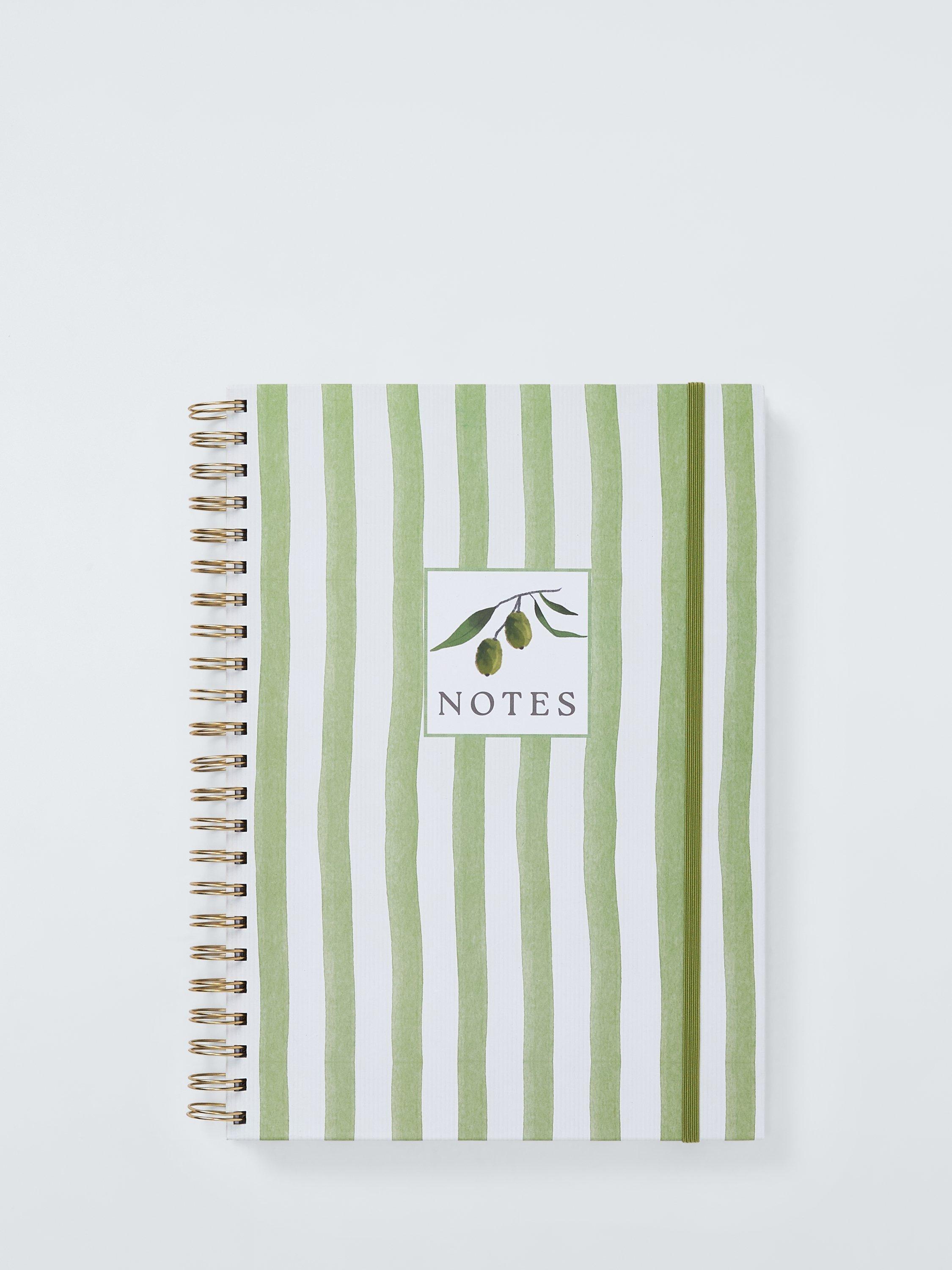 A classic, spiral-bound notebook with a Mediterranean-inspired stripe and olive design.