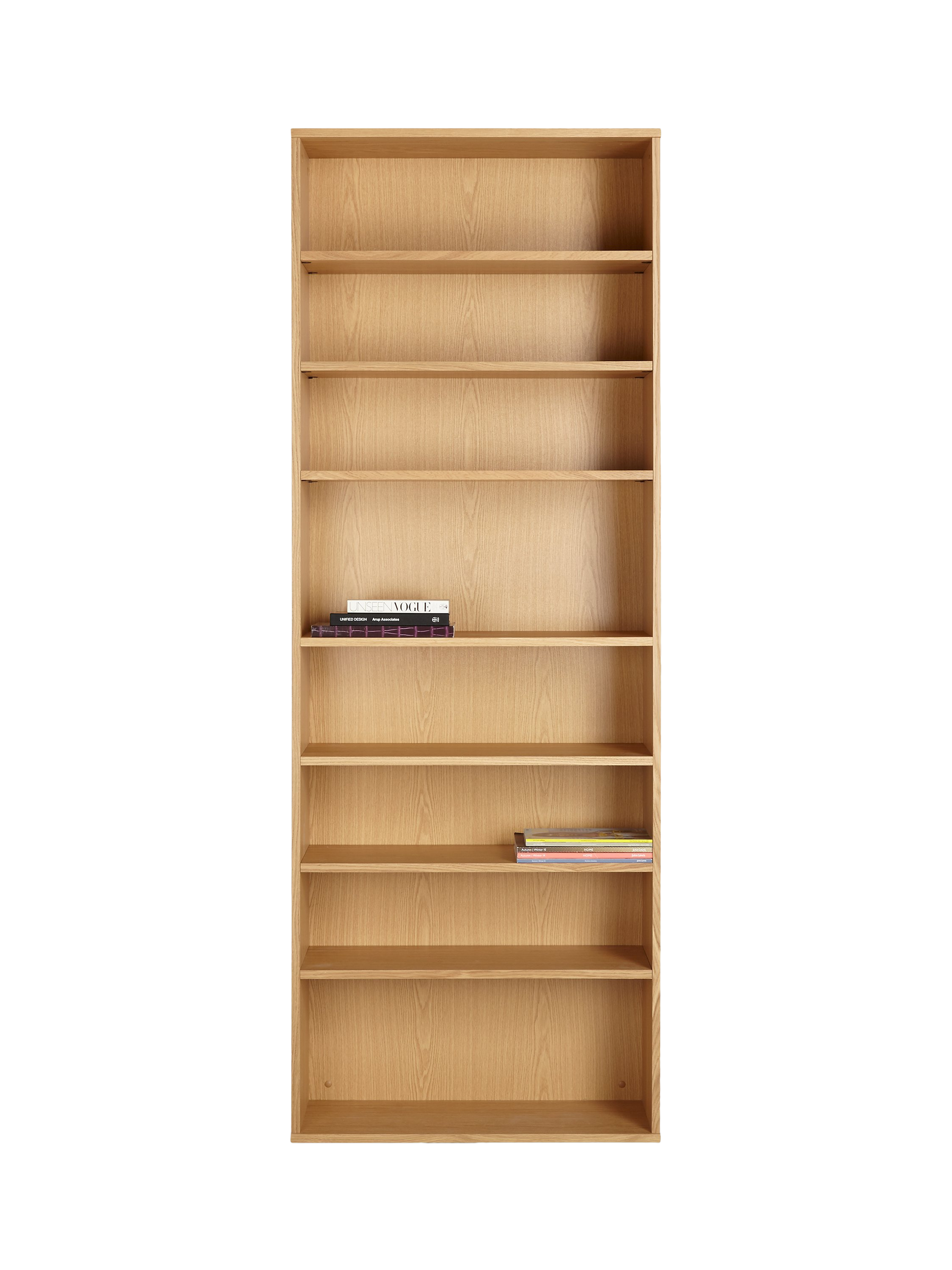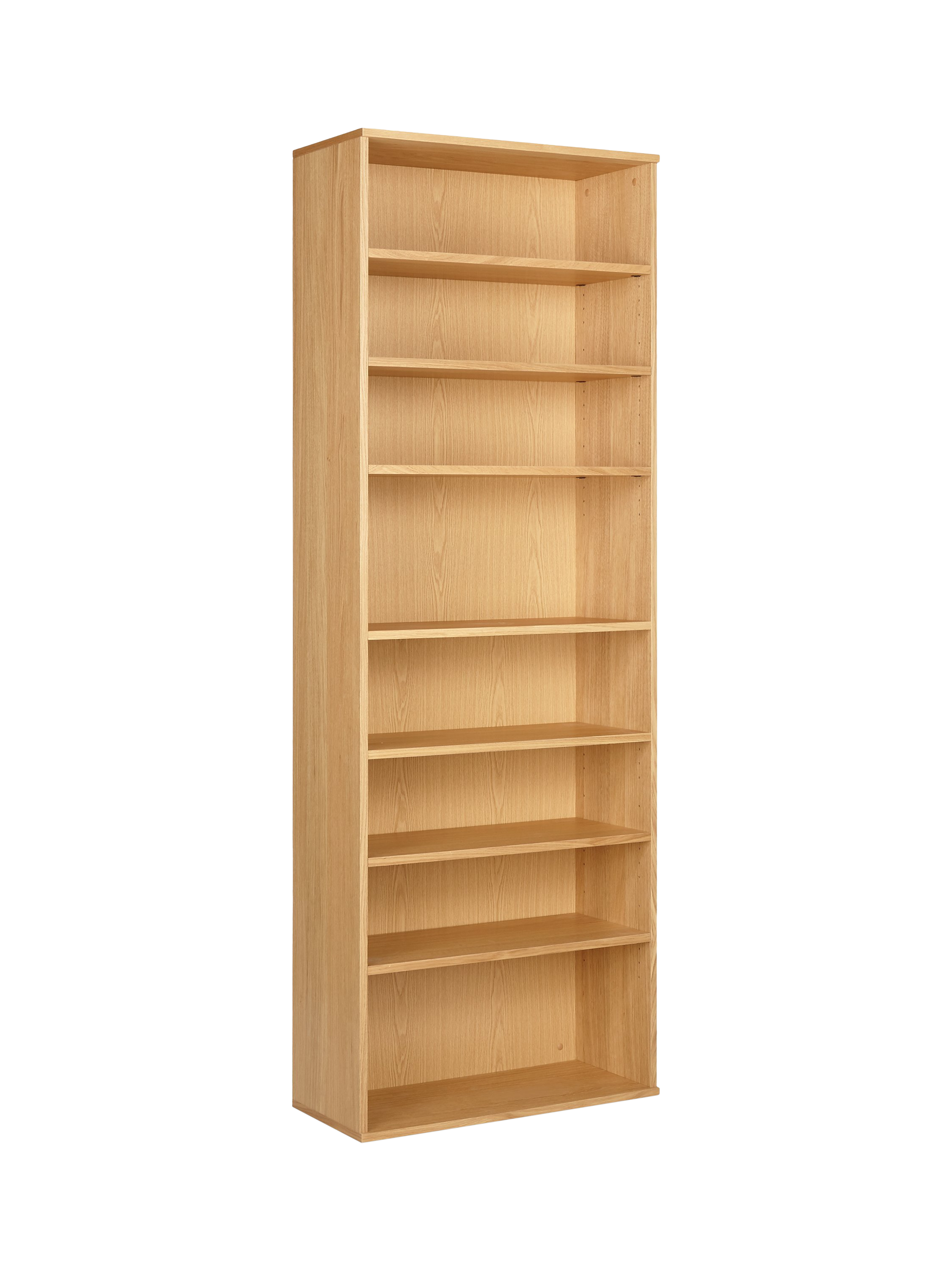 This wide oak veneer bookcase provides stylish and practical storage for any living room, hallway or study. It includes six adjustable shelves and one fixed shelf in the middle, providing ample room to display your books, DVDs and ornaments.