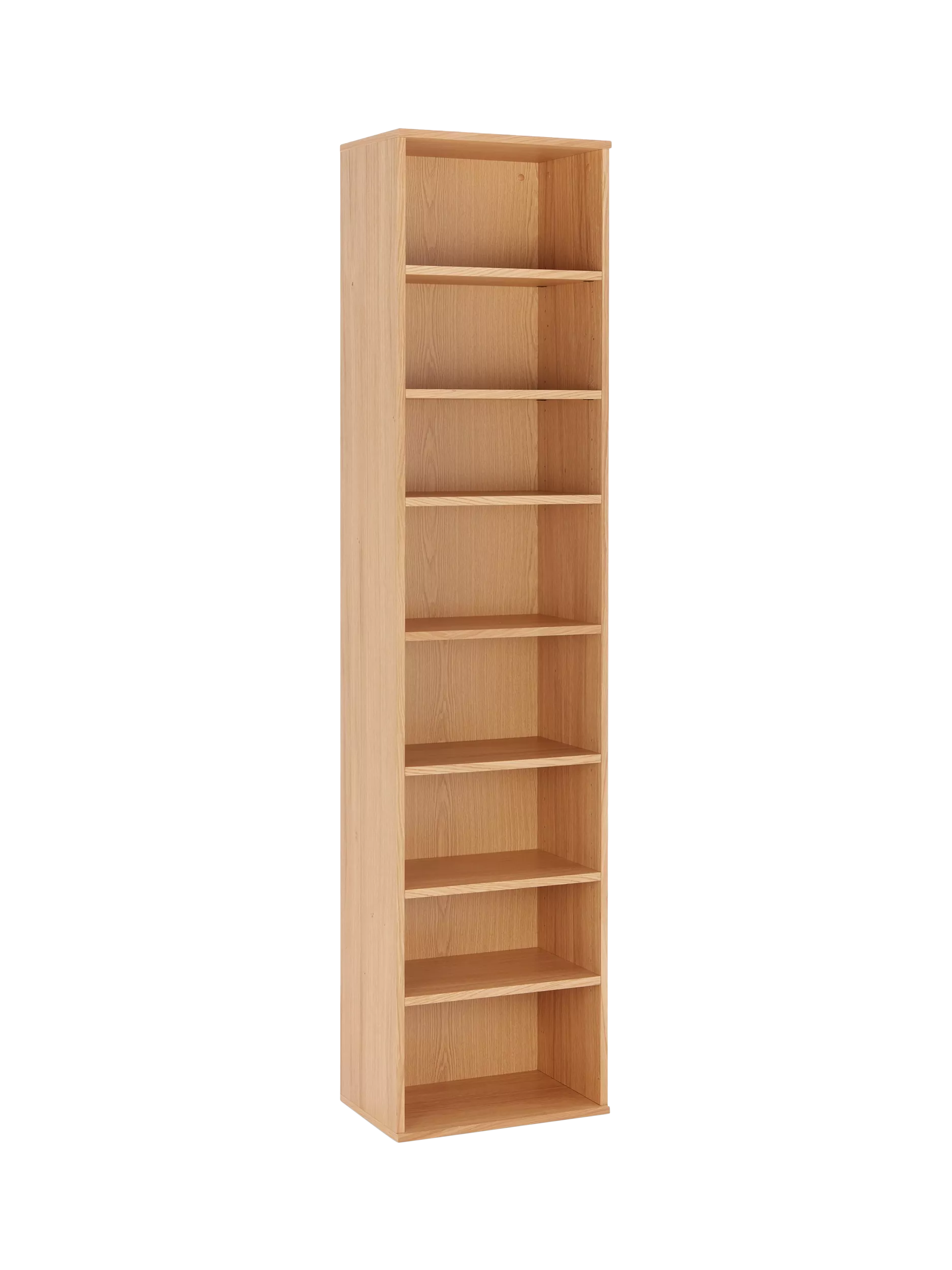 A narrow oak and veneer bookcase, with one fixed shelf and six adjustable shelves that provide ample storage for DVDs, books or ornaments. The narrower profile is perfect for hallways or smaller rooms.