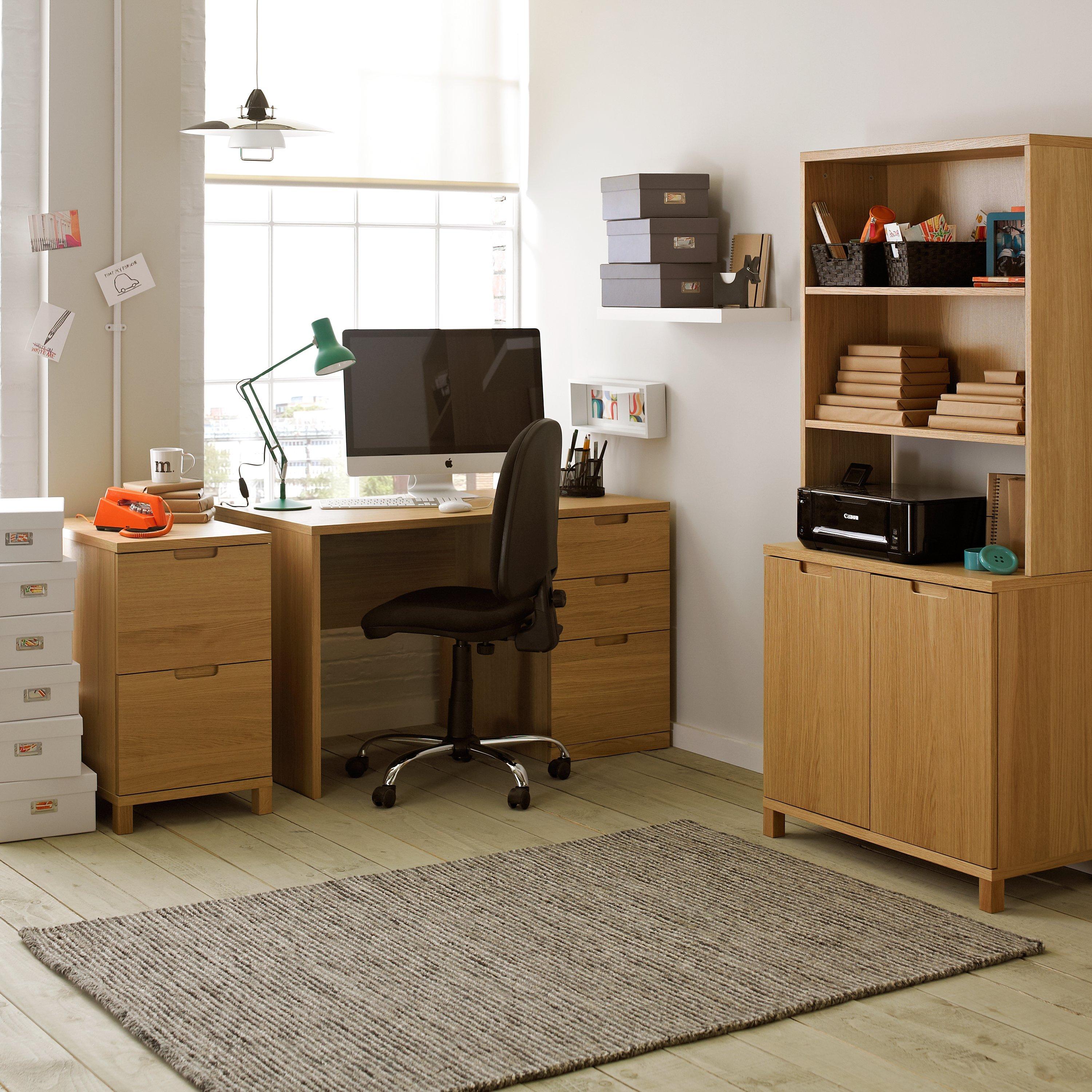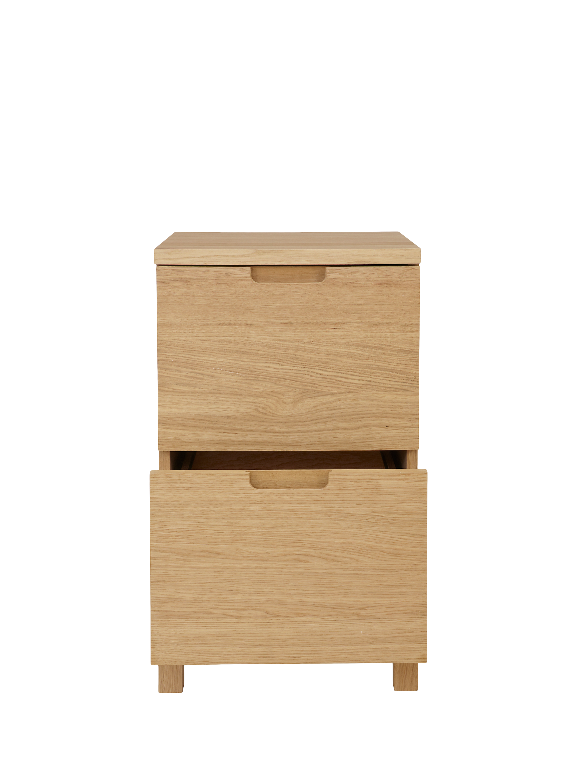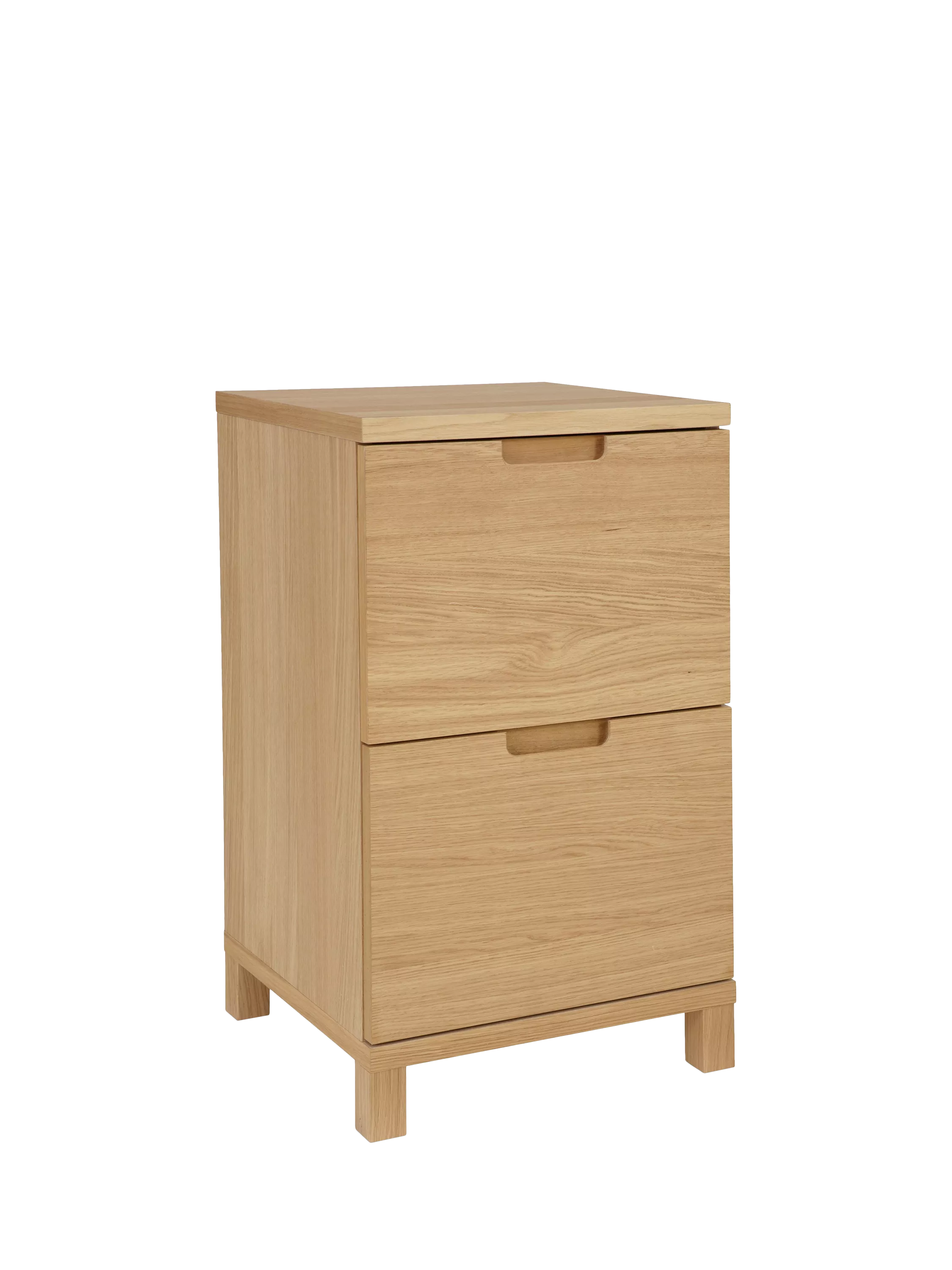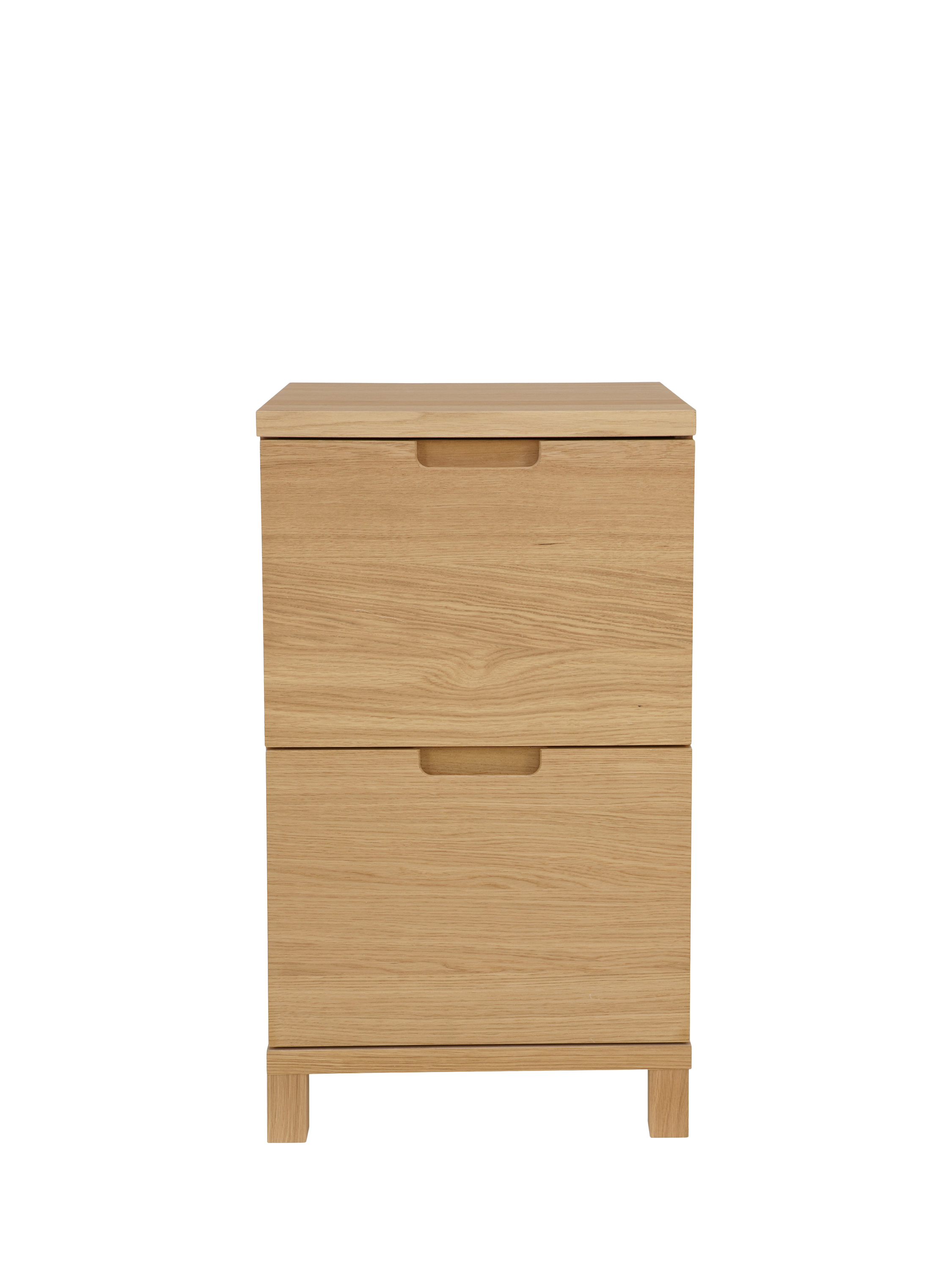 This FSC oak veneered chipboard filing cabinet fits neatly into your home office to provide stylish and practical storage. It includes two deep drawers, providing ample room to store unwanted clutter and runners in each drawer for A4 hanging files.