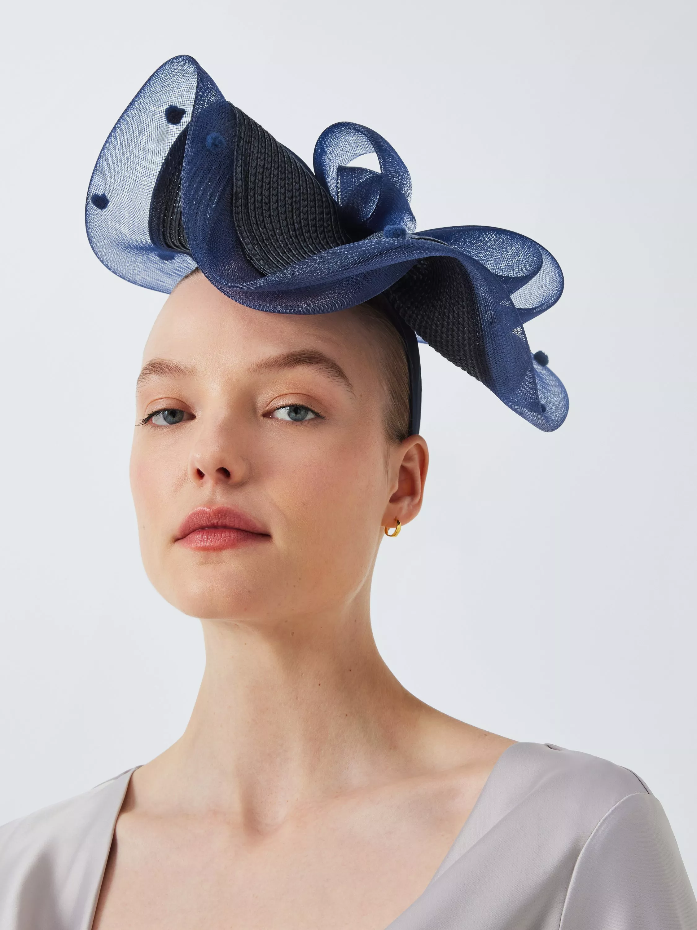 A large fascinator for that special day, layered with ribbons and braiding for texture and finished with polka dots for subtle patterning.