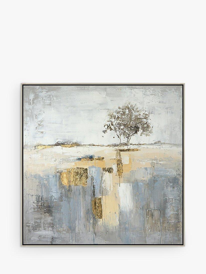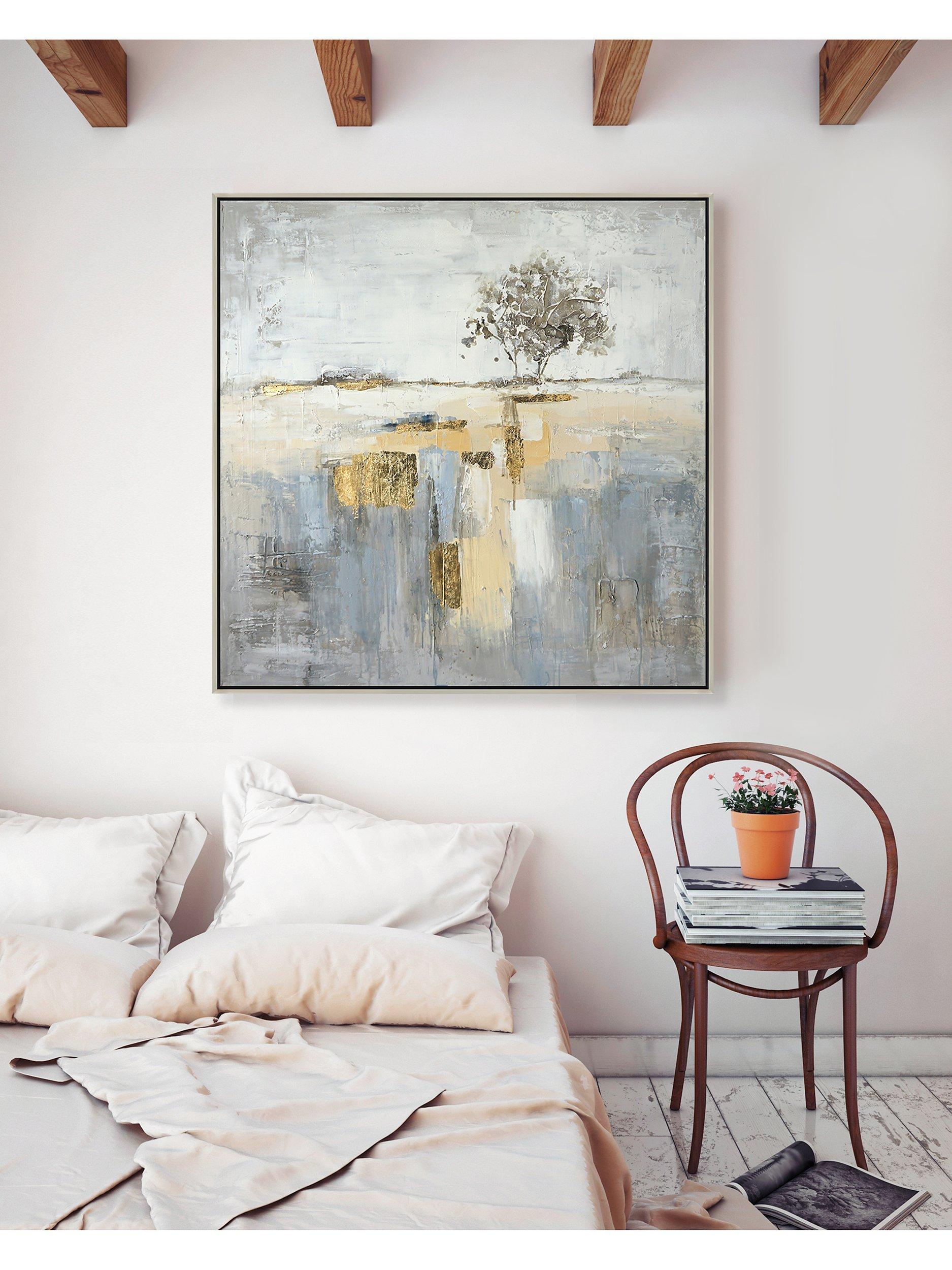 A dream-like hand-painted canvas depicting an abstract landscape that draws the eye to a lone tree. It's framed and ready to wall mount by the D-ring fittings on the reverse side.