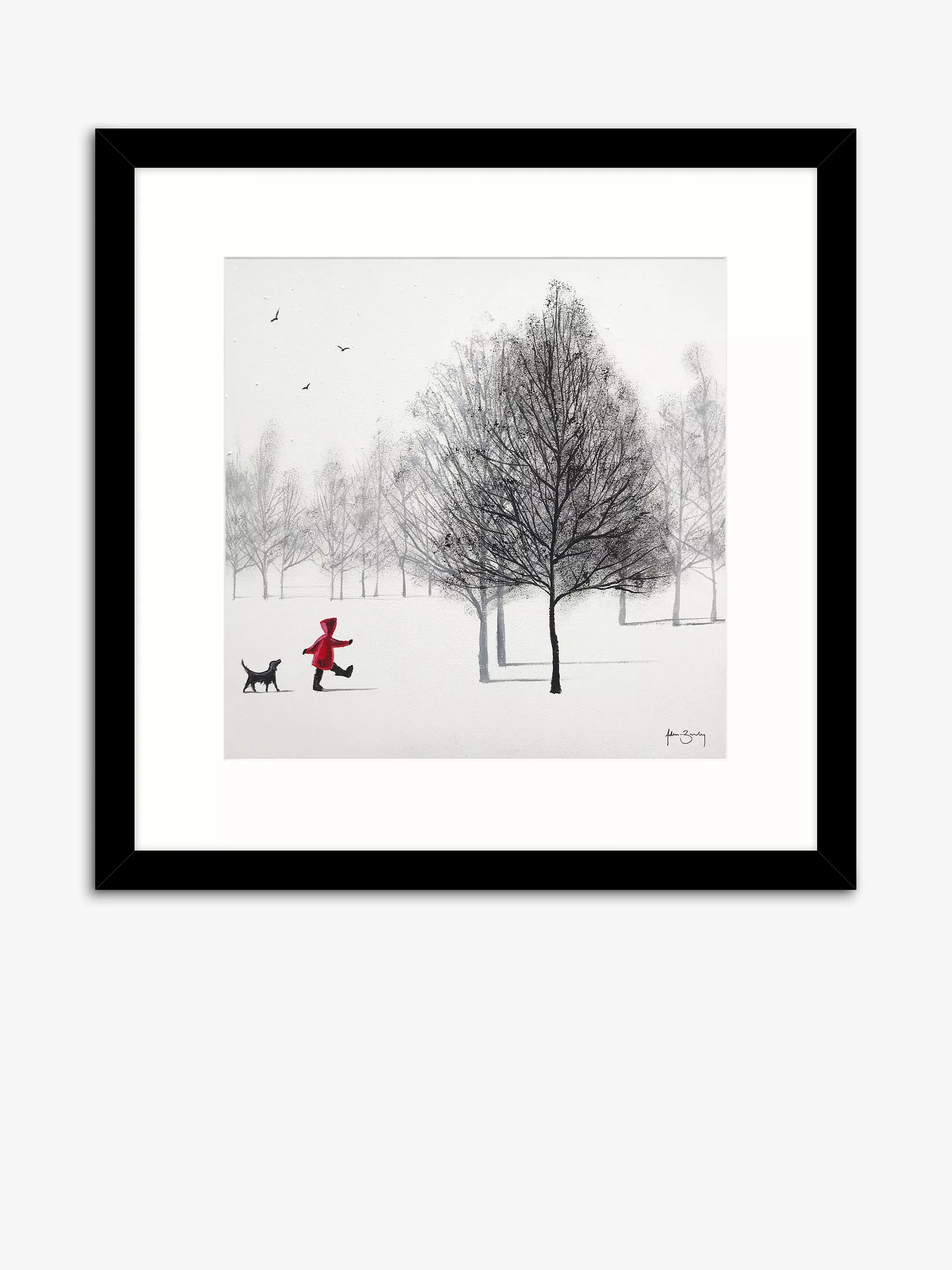 A framed print of a child wearing a red coat in contrast to the monochrome wintry landscape, by artist Adam Barsby. Made in the UK and ready to hang on your wall, this print is presented in a window mount and frame.