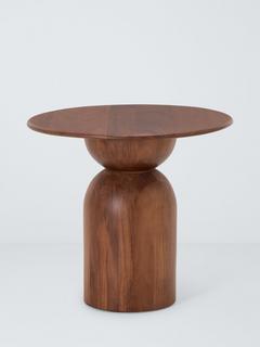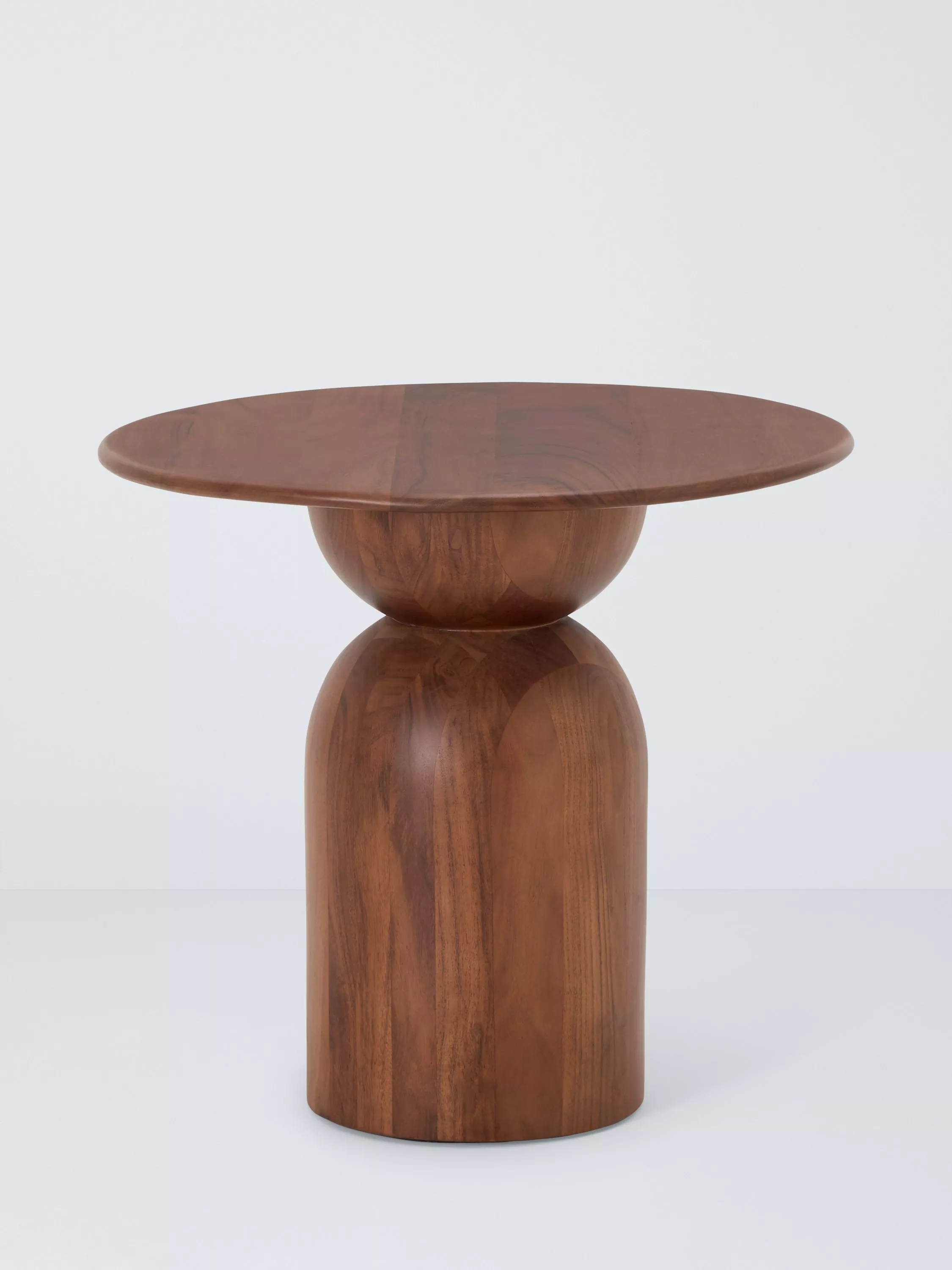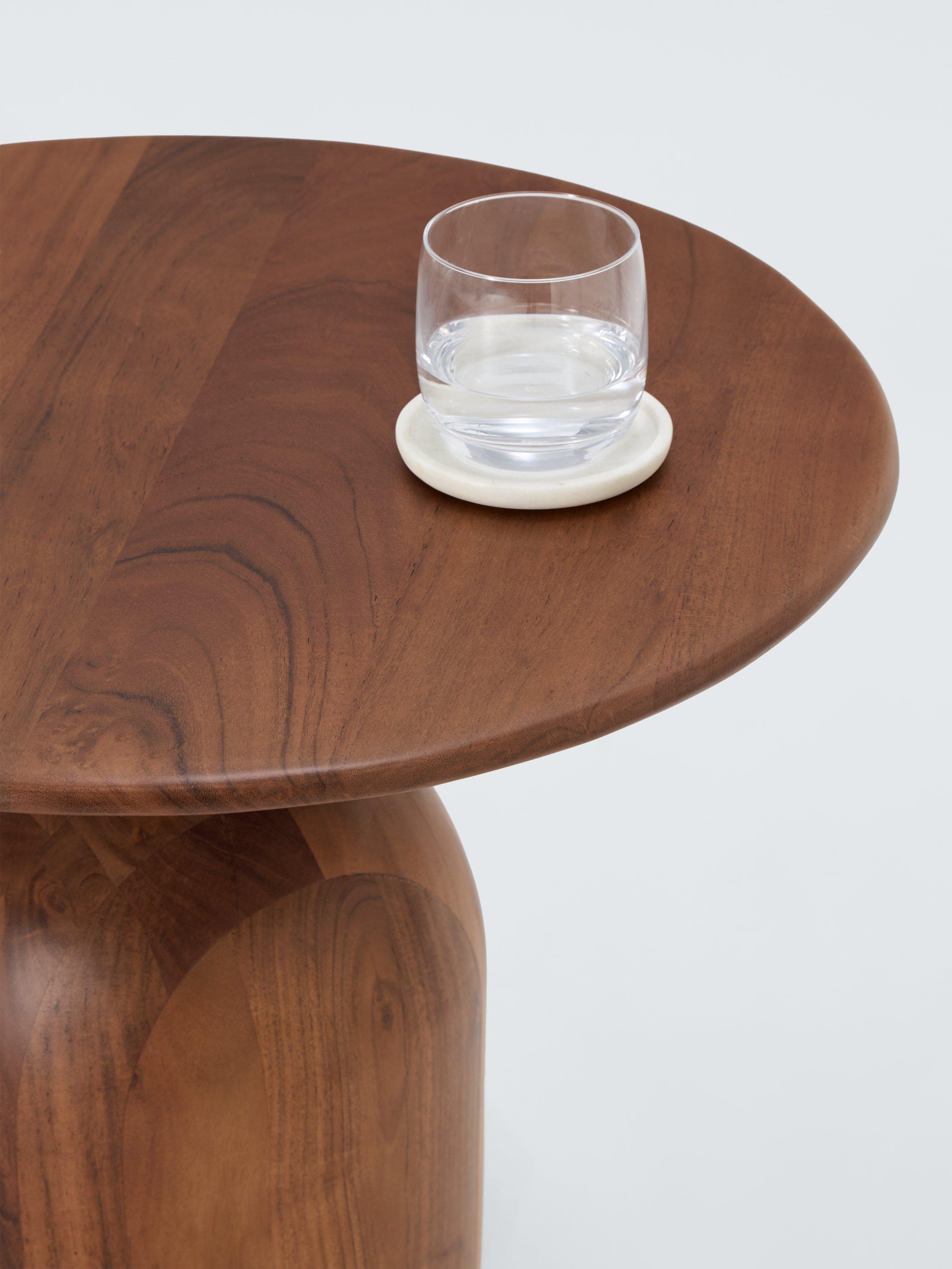 A solid acacia wood round side table with a walnut stain. A beautiful and functional piece of furniture that is perfect for any room.