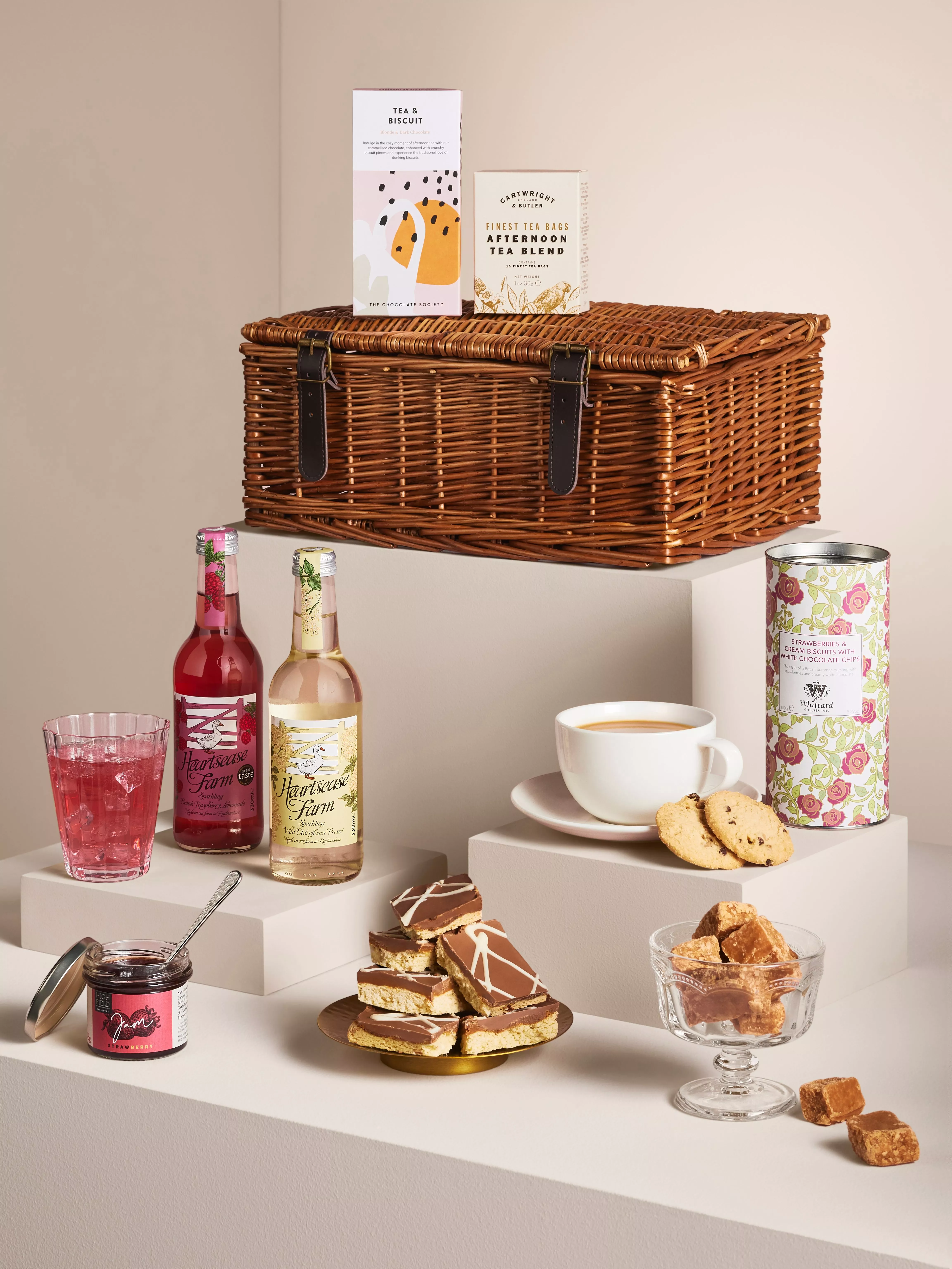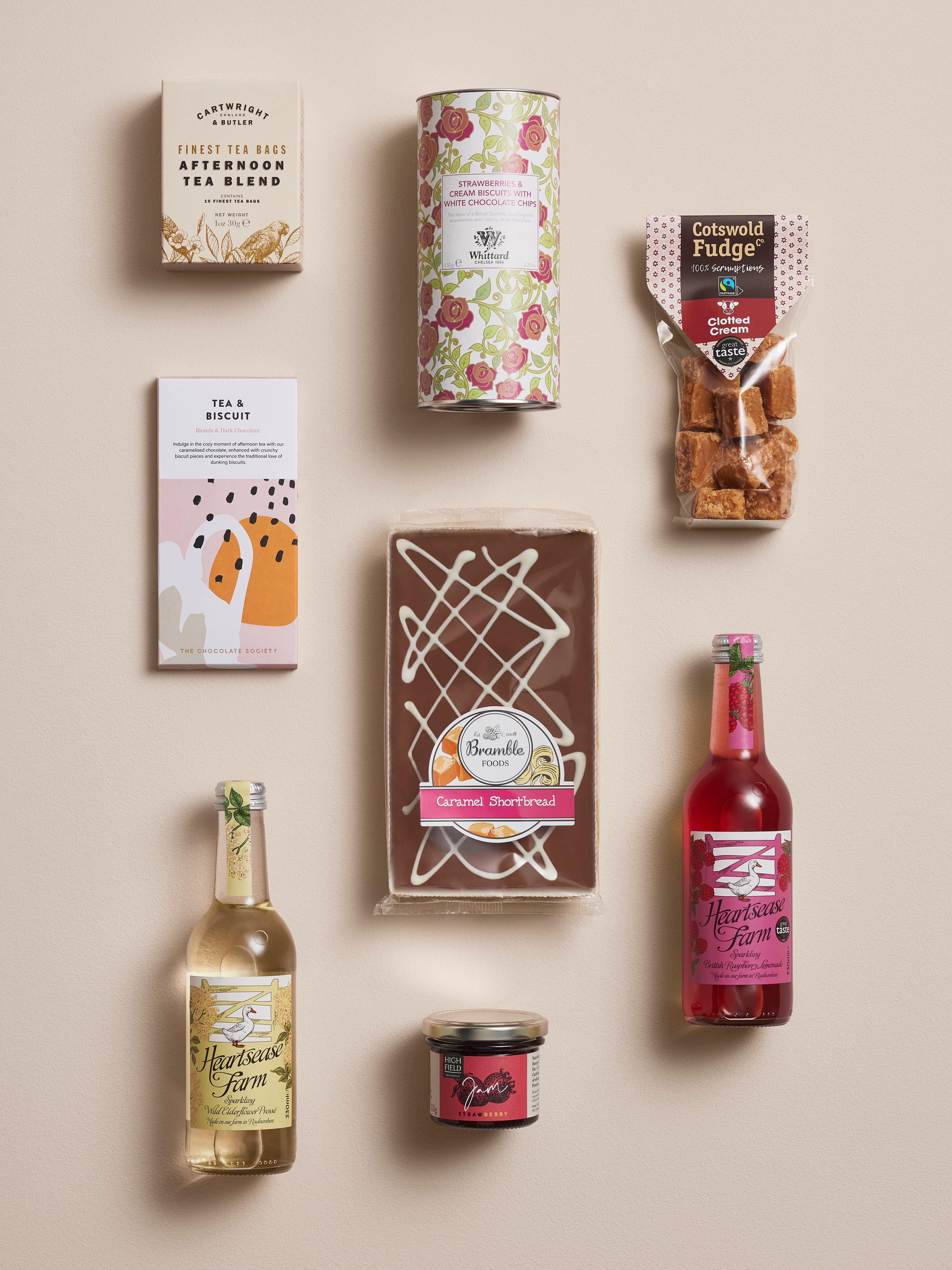 - Heartsease Farm Sparkling British Raspberry Lemonade 330ml Heartsease Farm Sparkling Wild Elderflower Presse 330ml Bramble Foods Caramel Shortbread 285g Whittard Strawberries & Cream Biscuits with White Chocolate Chips 150g Cotswold Fudge Co. Cotswold Clotted Cream Fudge 150g Highfield Preserves Strawberry Jam 113g The Chocolate Society Tea & Biscuit Blonde & Dark Chocolate Bar 80g Cartwright & Butler English Afternoon Blend-10 Finest Tea Bags 30g