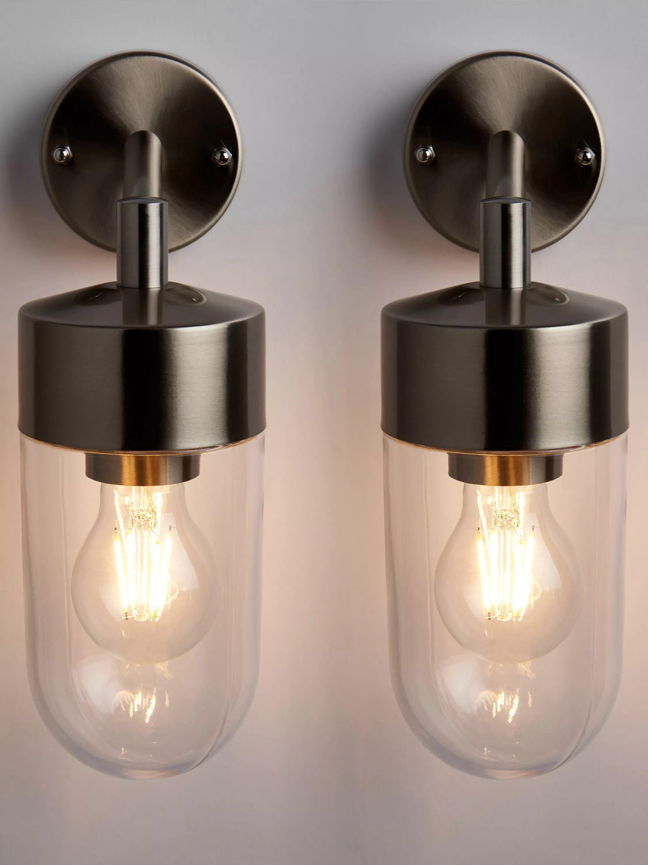 This pair of wall lights are made from brushed stainless steel with a clear glass shade. They're IP44 rated and suitable for installation outside. Style on either side of your front door for a smart set up and enjoy a functional glow of light.