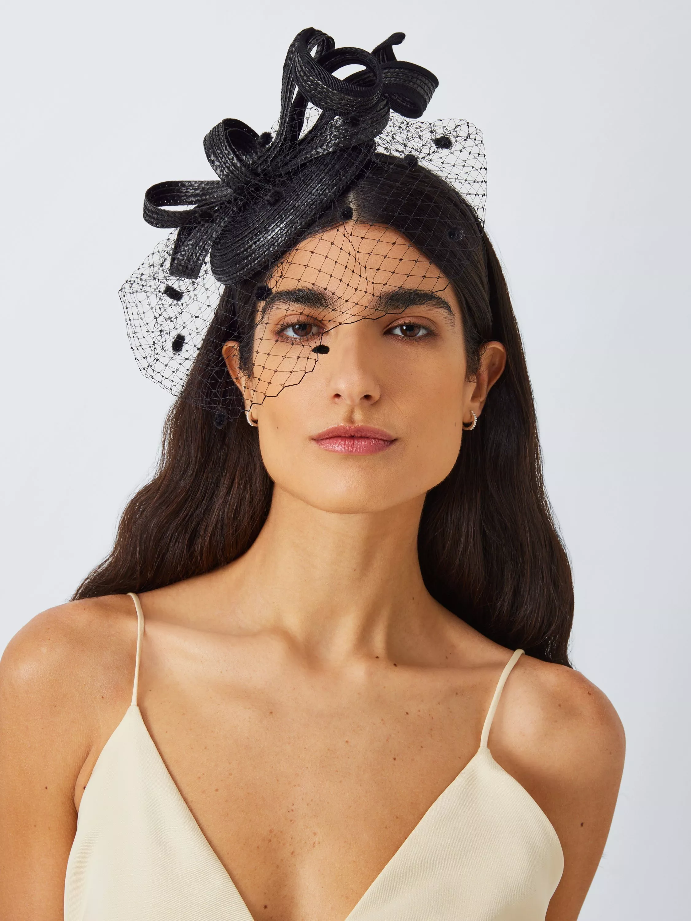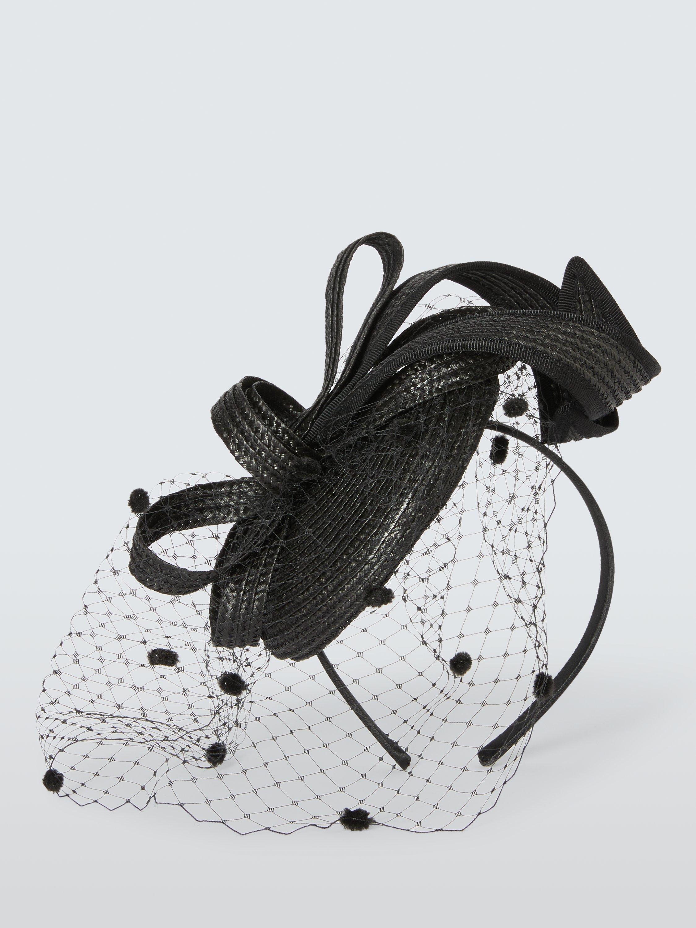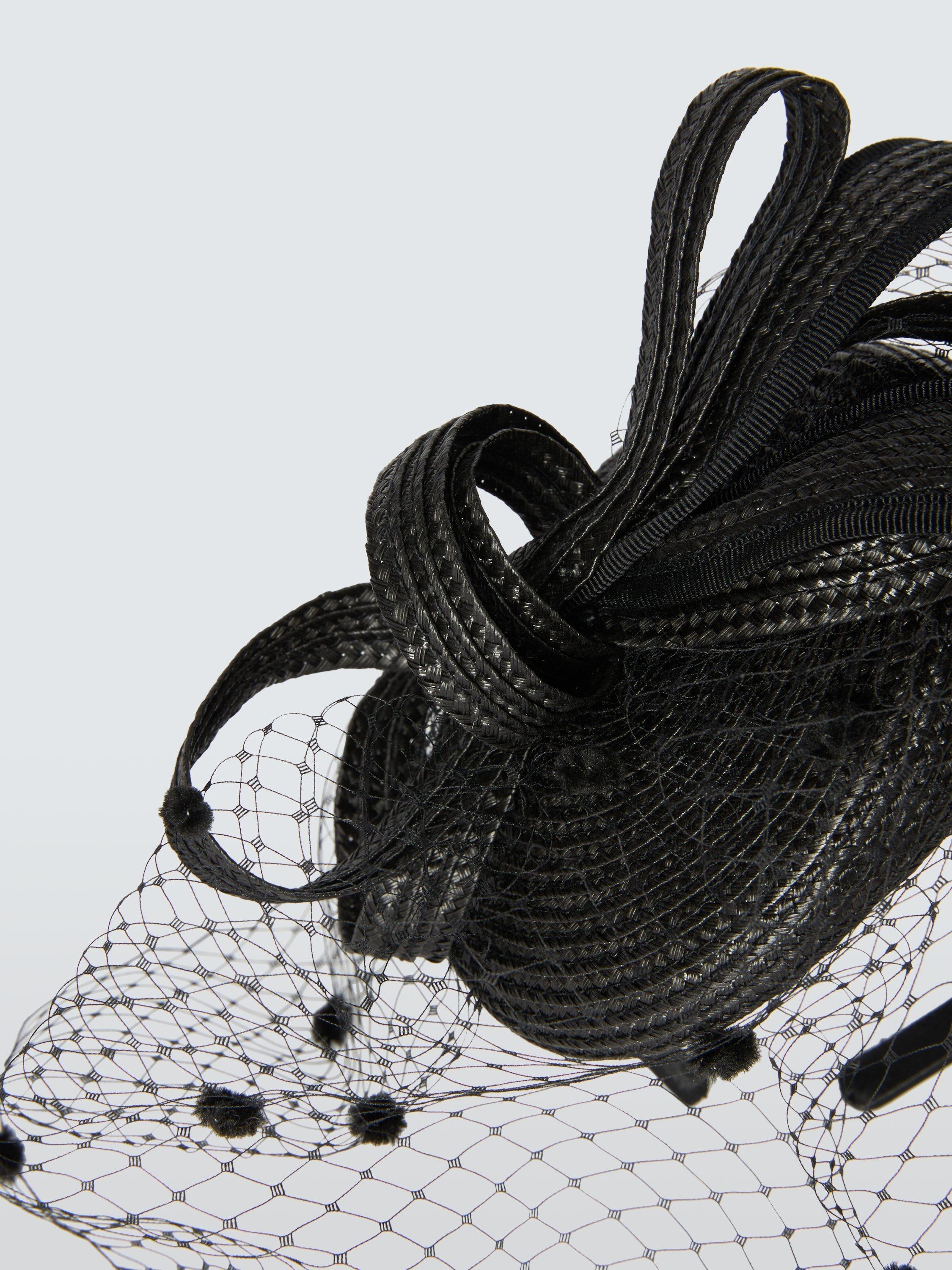 A fashionable pillbox-style fascinator with textured detailing, voilette netting and structured loops. Ideal for a wedding or a day at the races.
