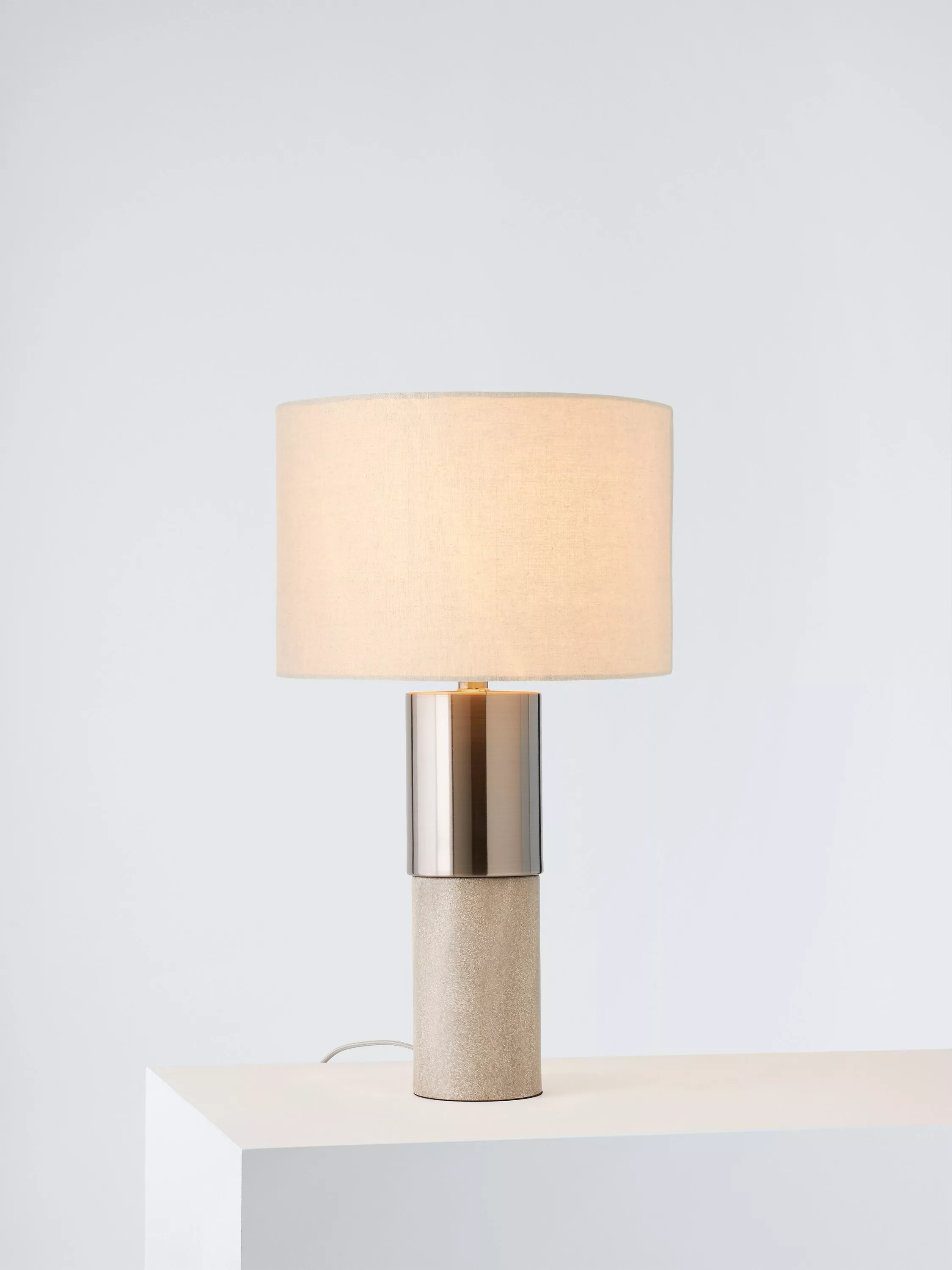 The Akani table lamp reflects contemporary elegance, with its sturdy profile and brushed finish. Its smart two-tone base will lend tactile interest to your table tops, while its complementary natural linen lampshade offers a perfect finishing touch.